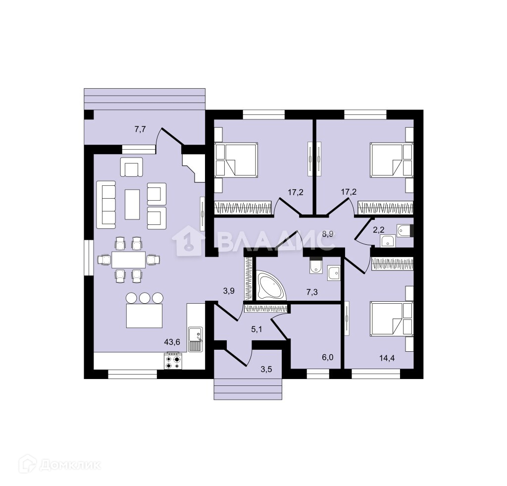 Отличная планировка дома: кухня гостиная 43 кВ метров , 3 просторные комнаты :17,17,14 кВ метров, 2 санузла, выход на террасу.