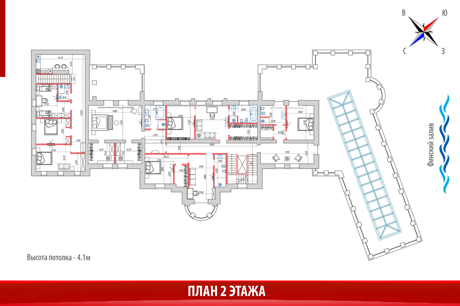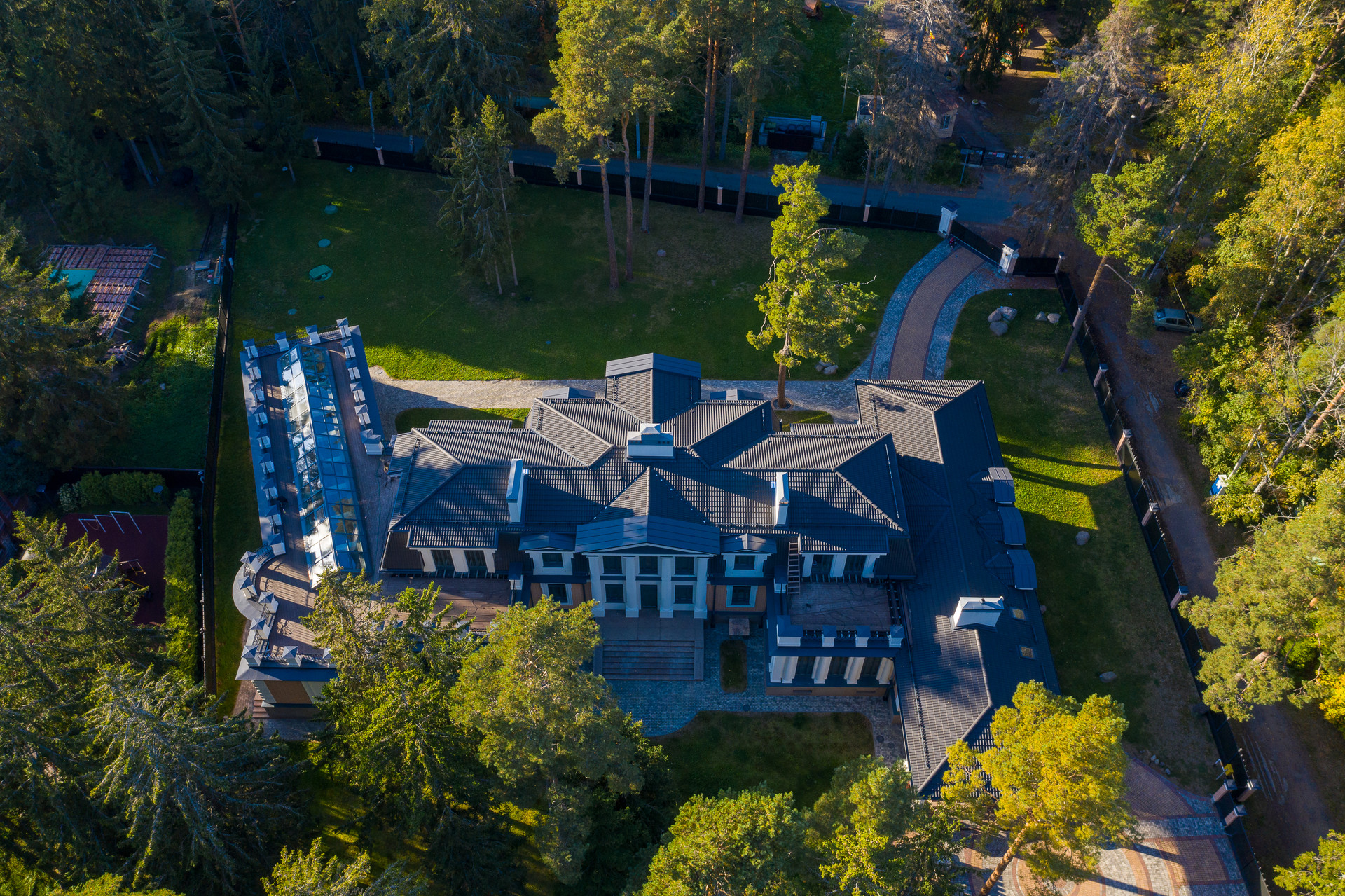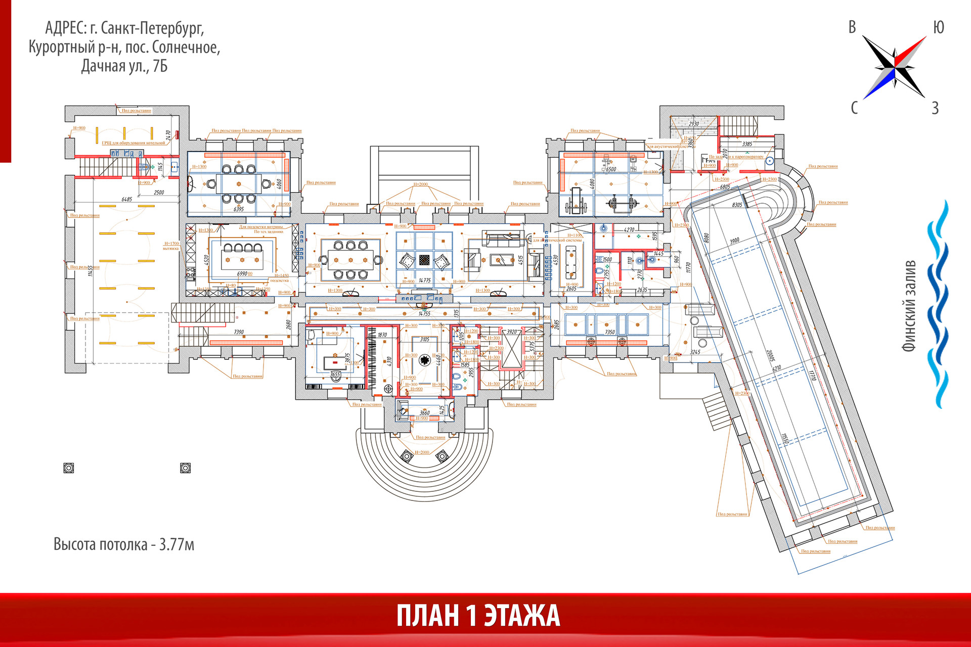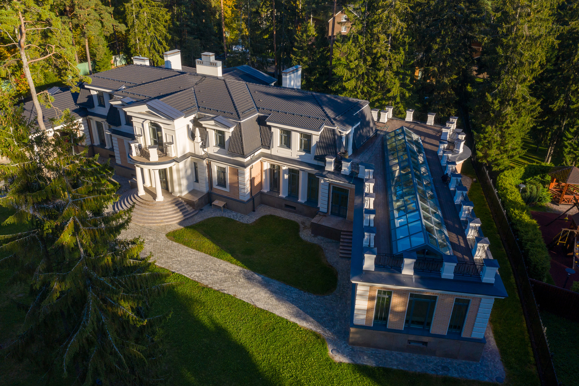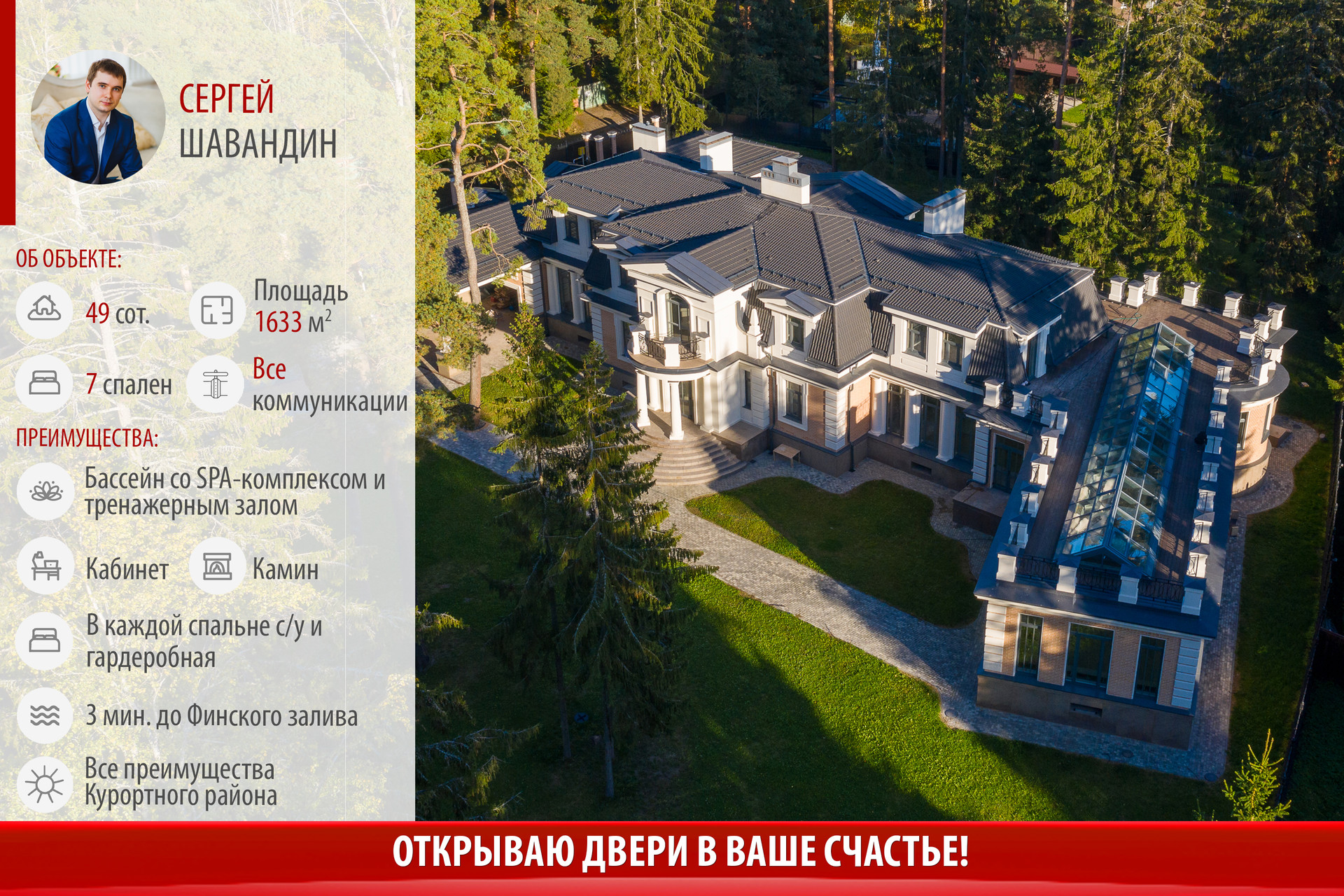 Это ШЕДЕВР! Но это еще не все!))) Самое интересное, что это домовладение 1633м2 располагается на участке 0,5 Га среди многовековых сосен и елей, всего в 400м от Финского залива, с песчаным пляжем, и в нем есть бассейн и СПА-комплекс, потрясающие виды, эксплуатируемая крыша над бассейном с панорамным остеклением и ассамблеей колон! Он такой один на планете! Всего один! И в таком месте, в Курортном р-не Санкт-Петербурга!