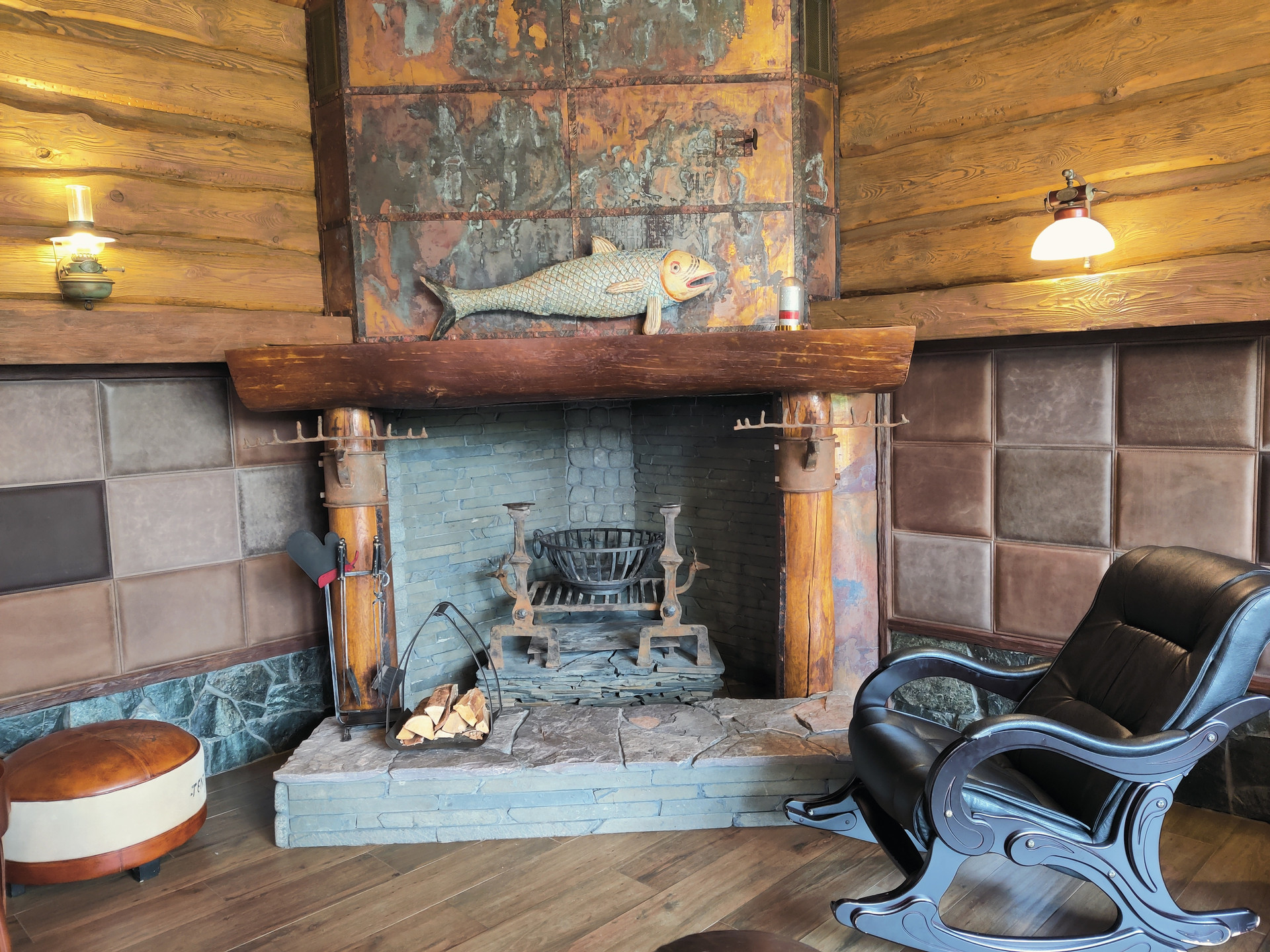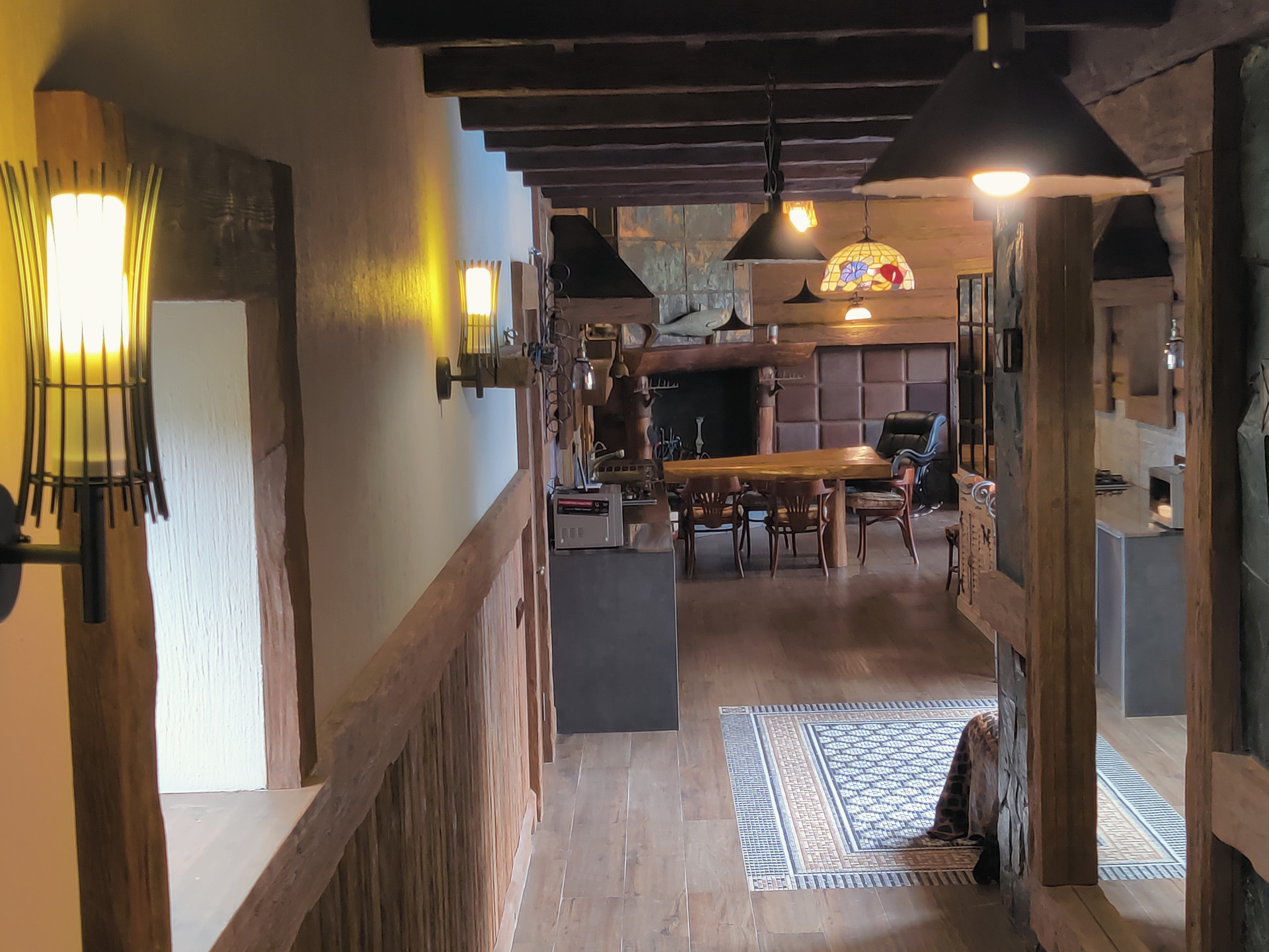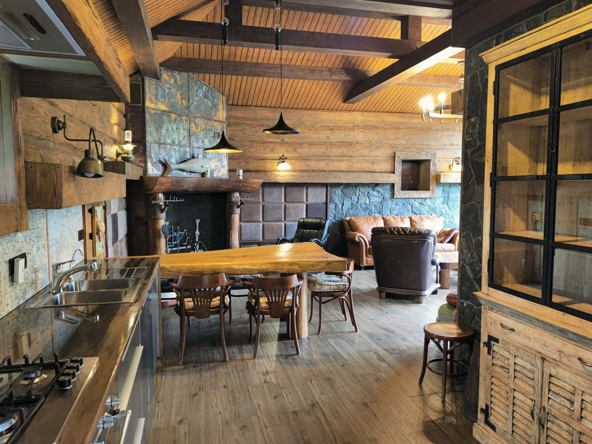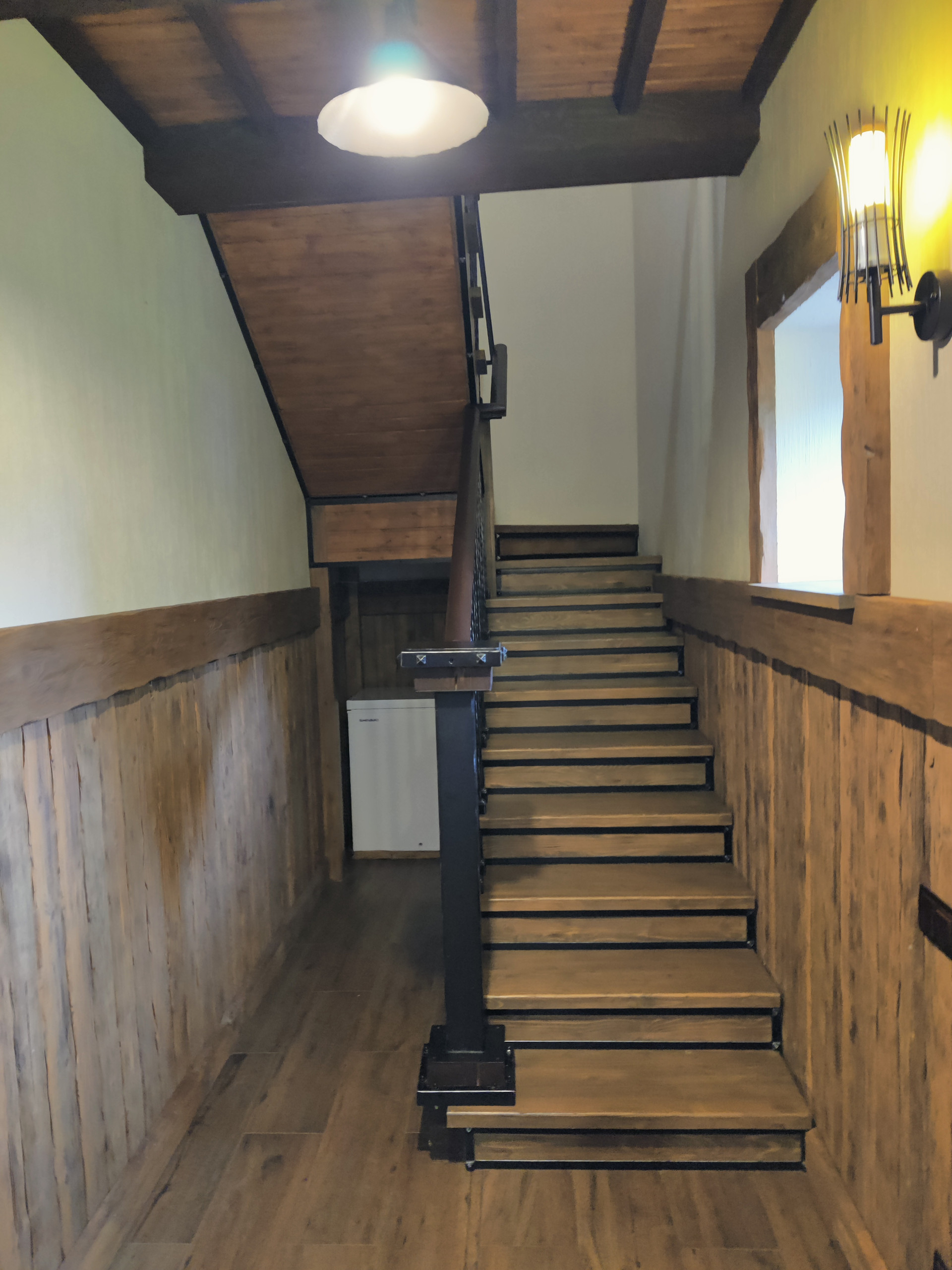 На первом этаже расположены: прихожая, гостиная с камином, кухонная зона, терраса, гостевая спальня, санузел с сауной, техническое помещение.