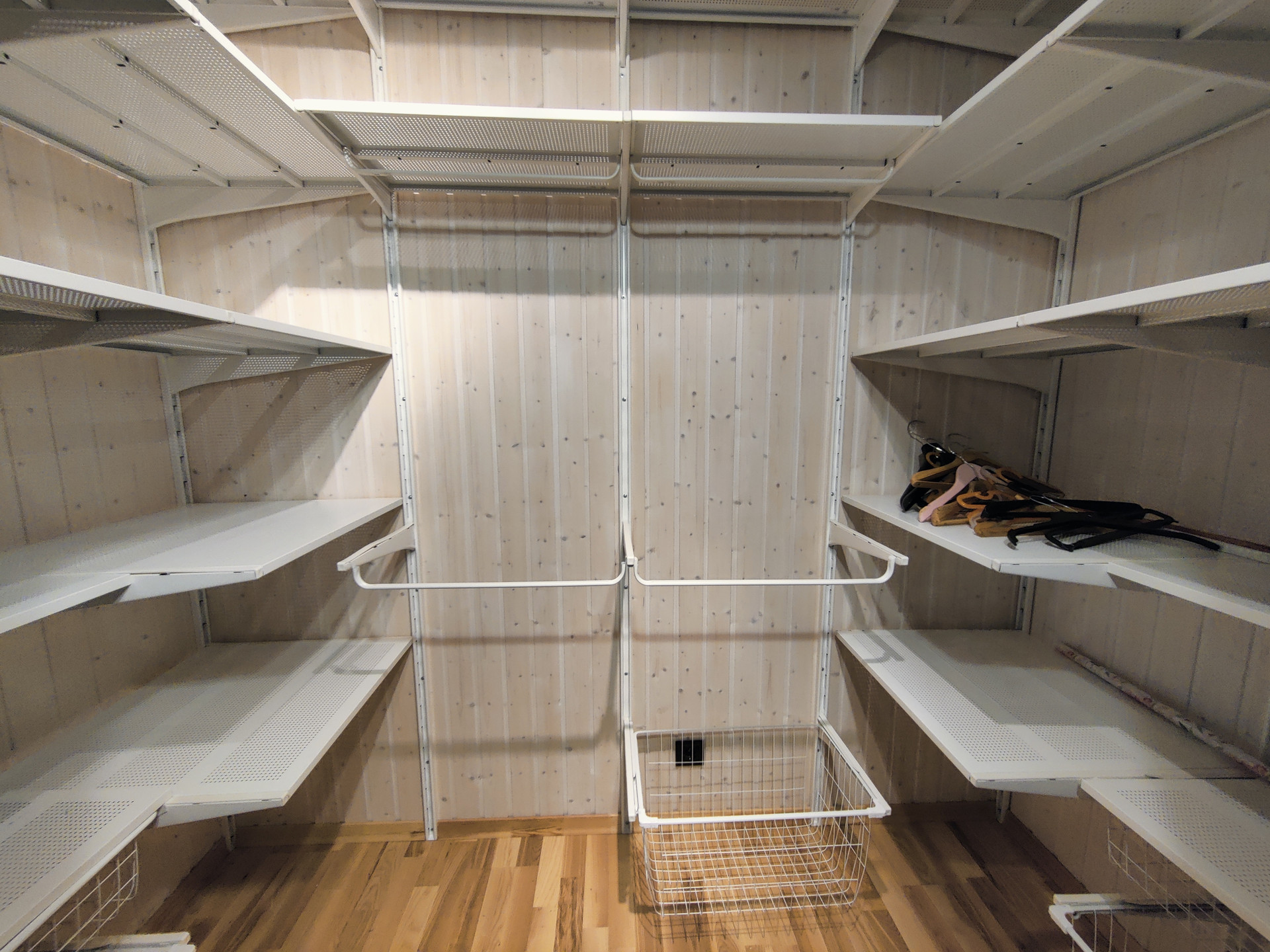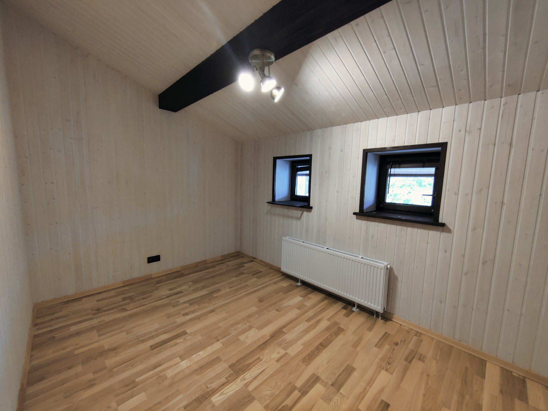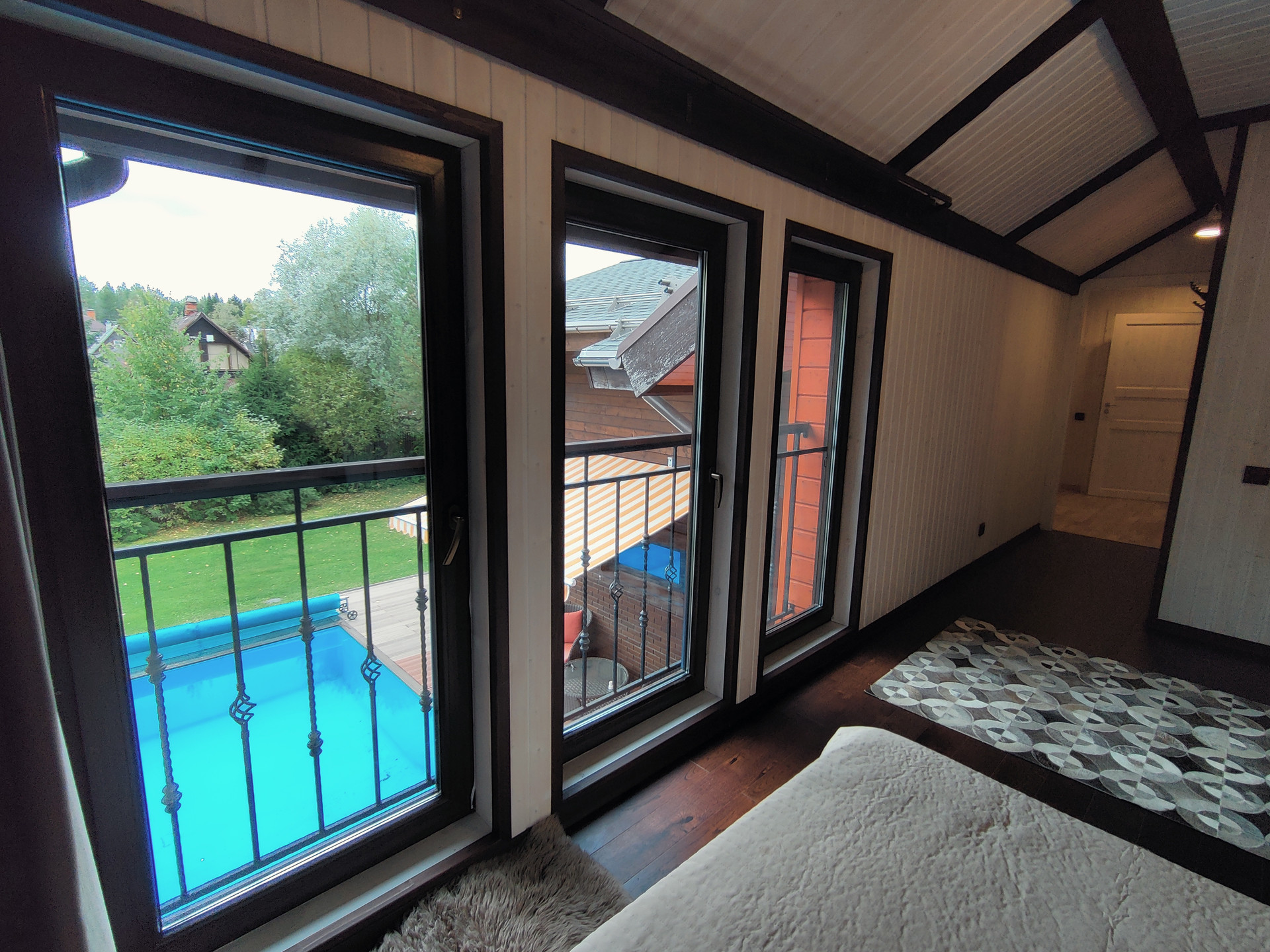 Второй этаж состоит из 2 спален, комнаты свободного назначения (можно оборудовать под детскую или кабинет), санузла, гардеробной. Изо всех окон коттеджа открывается прекрасны вид на участок с открытым бассейном.