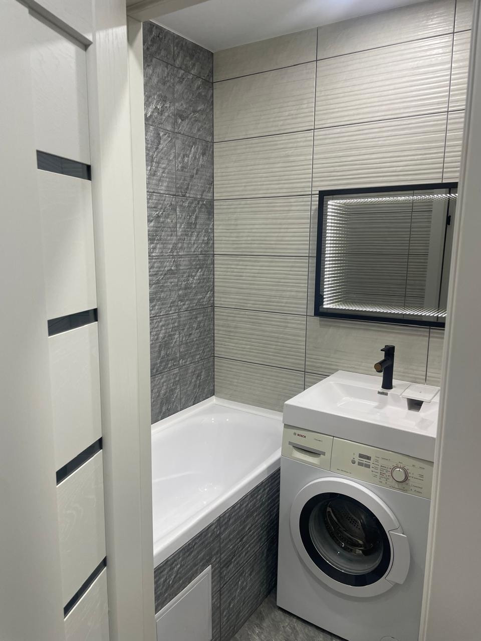 В ванной комнате кафель,акриловая ванна.