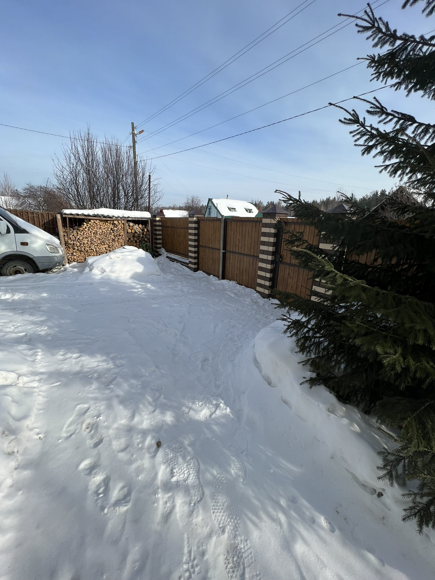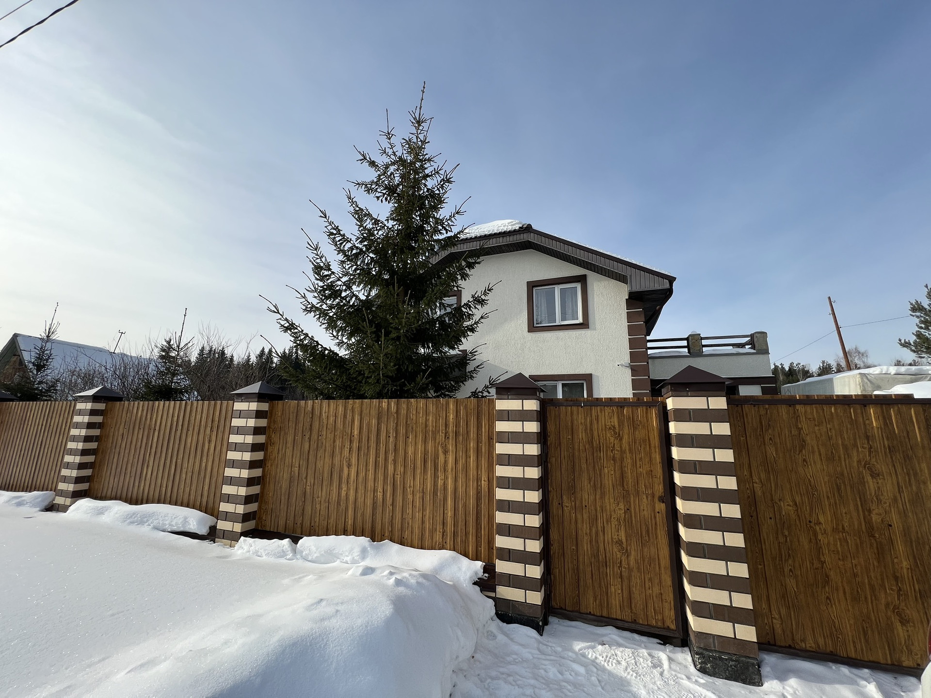 Участок огражден современным забором , фундамент забора ж/б сваи, лицевой забор на монолитном ростверке с кирпичными столбами, распашными воротами и калиткой.