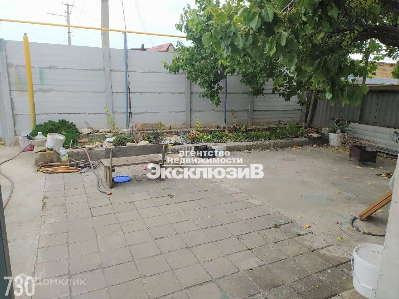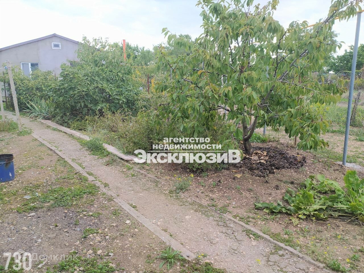 с разнообразными фруктовыми деревьями и кустарниками. Двор залит бетоном.
