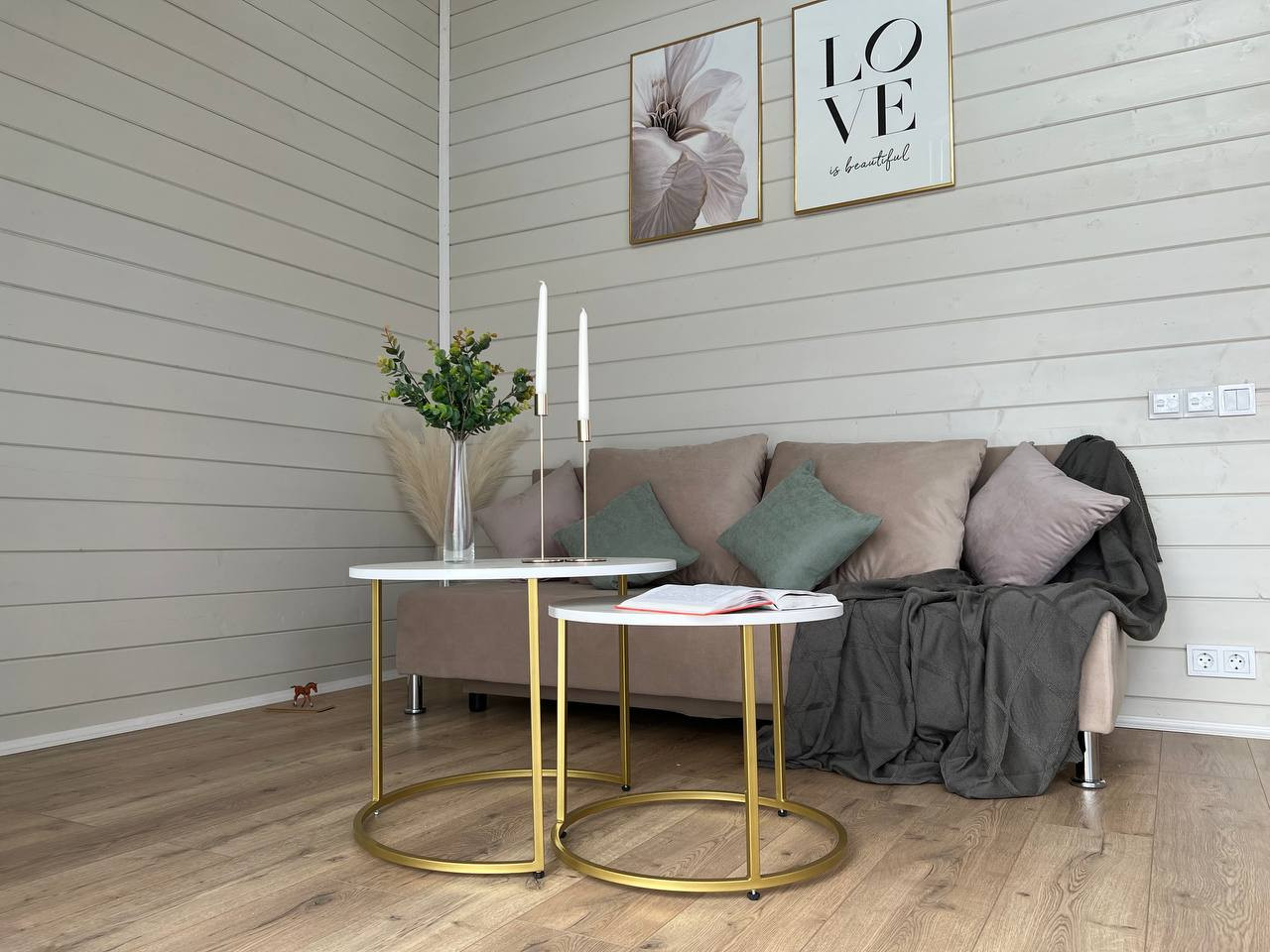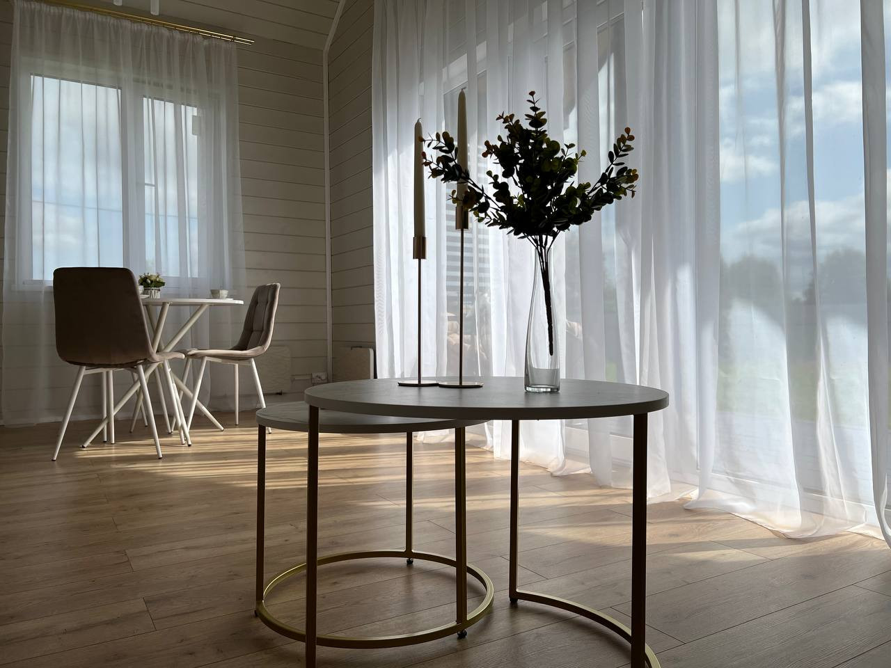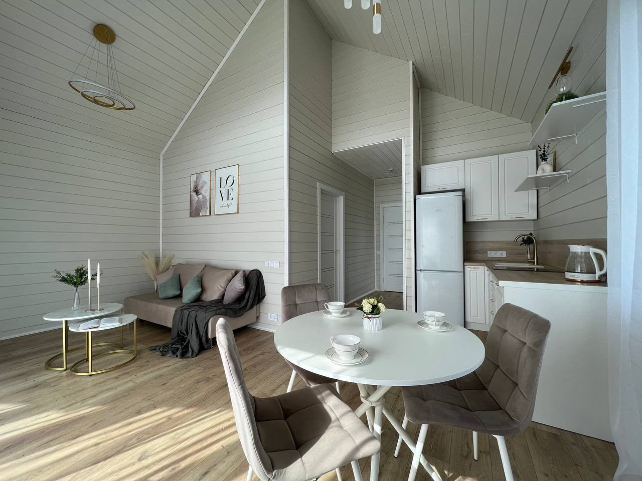 Внутренняя отделка дома выполнена в светлых тонах, зона гостиной со вторым светом, который визуально увеличивает пространство.