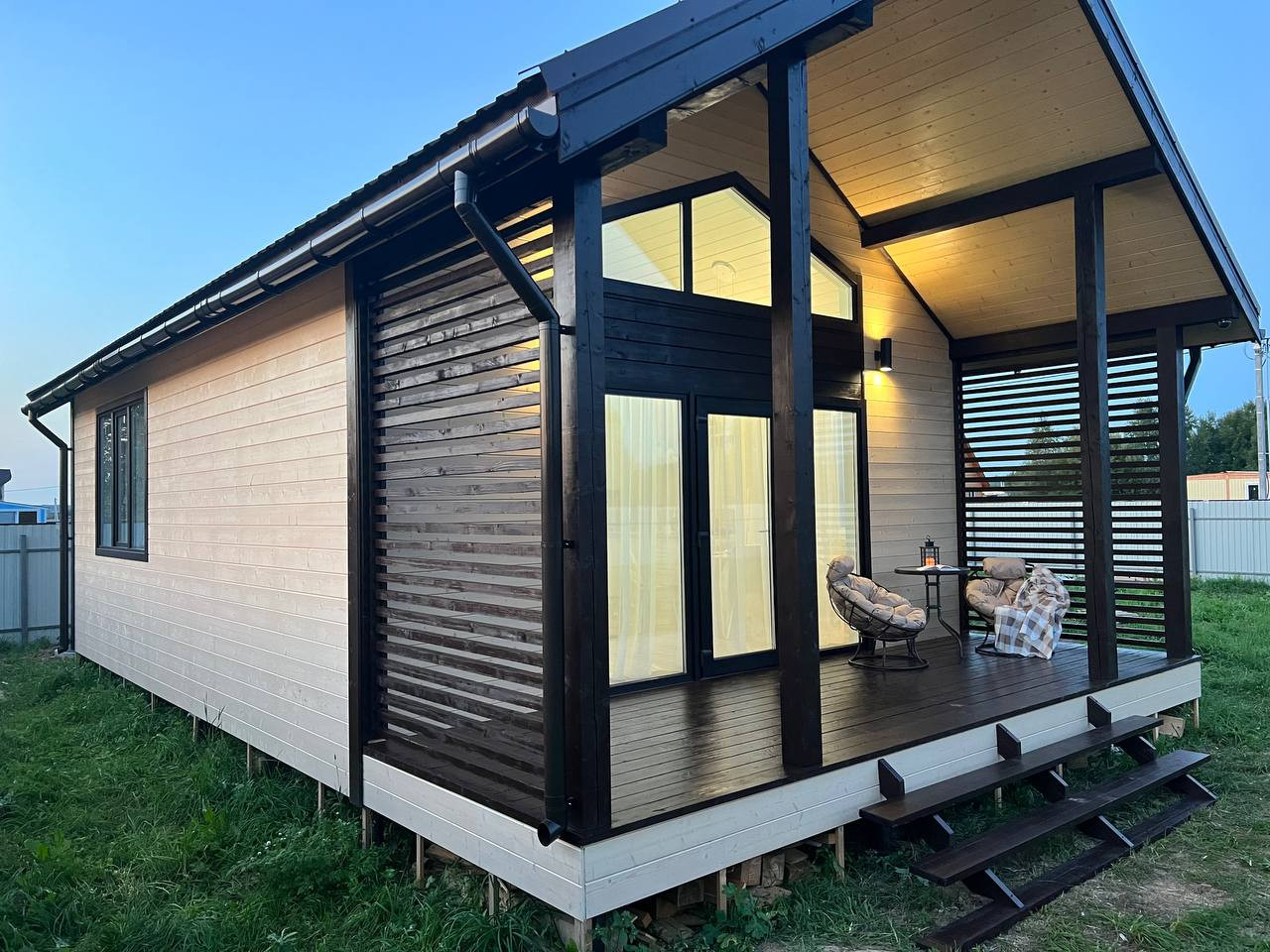 Продается дом с панорамными окнами и уютной террасой на участке правильной формы в поселке Солнечный круг Чеховского района.