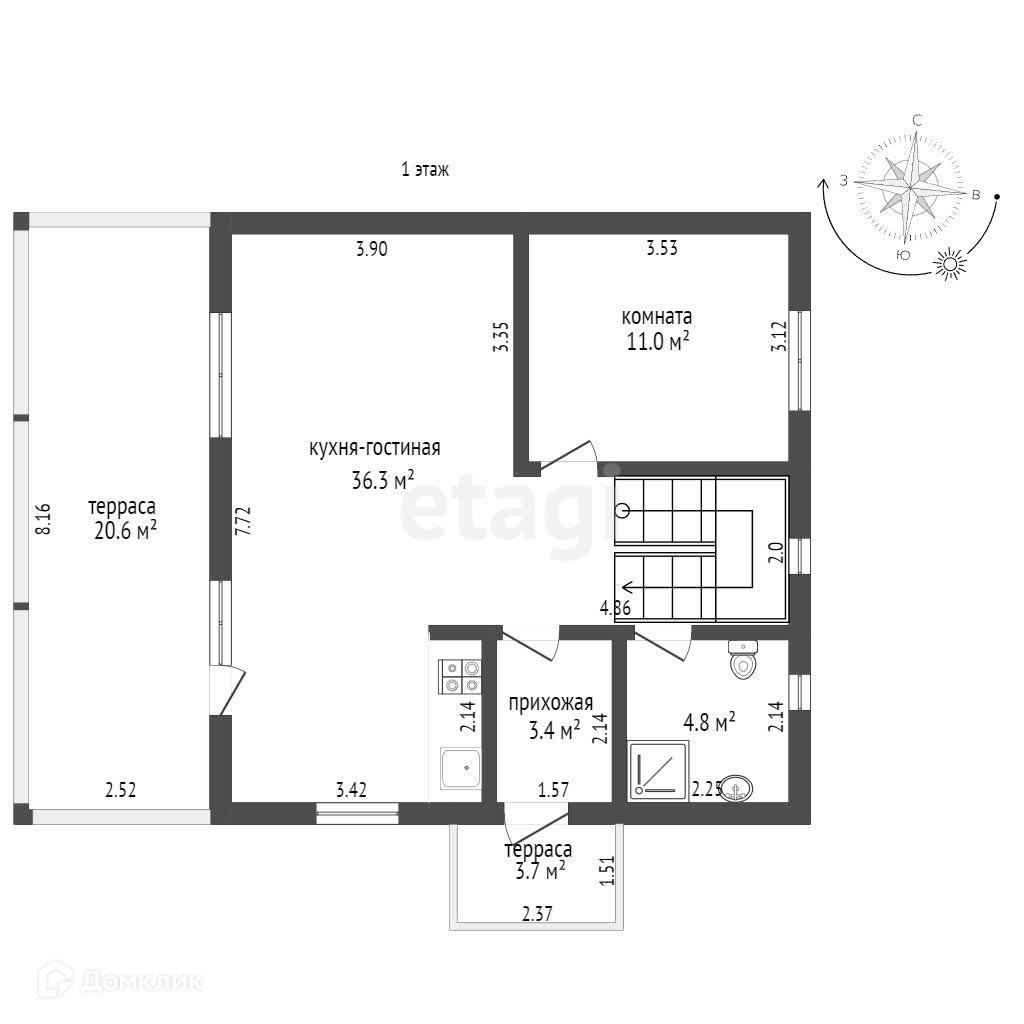 Планировка: 1 этаж- крыльцо, прихожая, холл, просторная кухня- гостиная с выходом на большую террасу, комната, санузел с душевой кабиной; лестница (под лестницей мини-котельная); 2 этаж- холл, 3 спальни, санузел оборудован ванной, гардеробная.