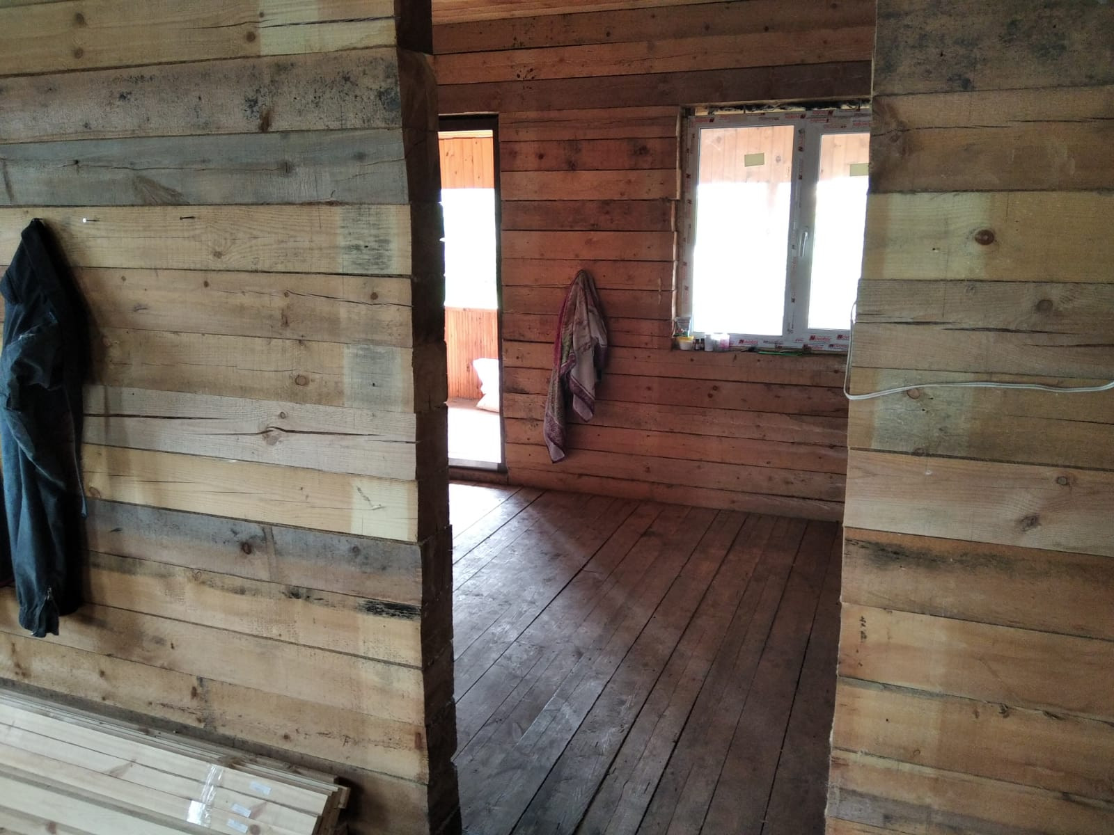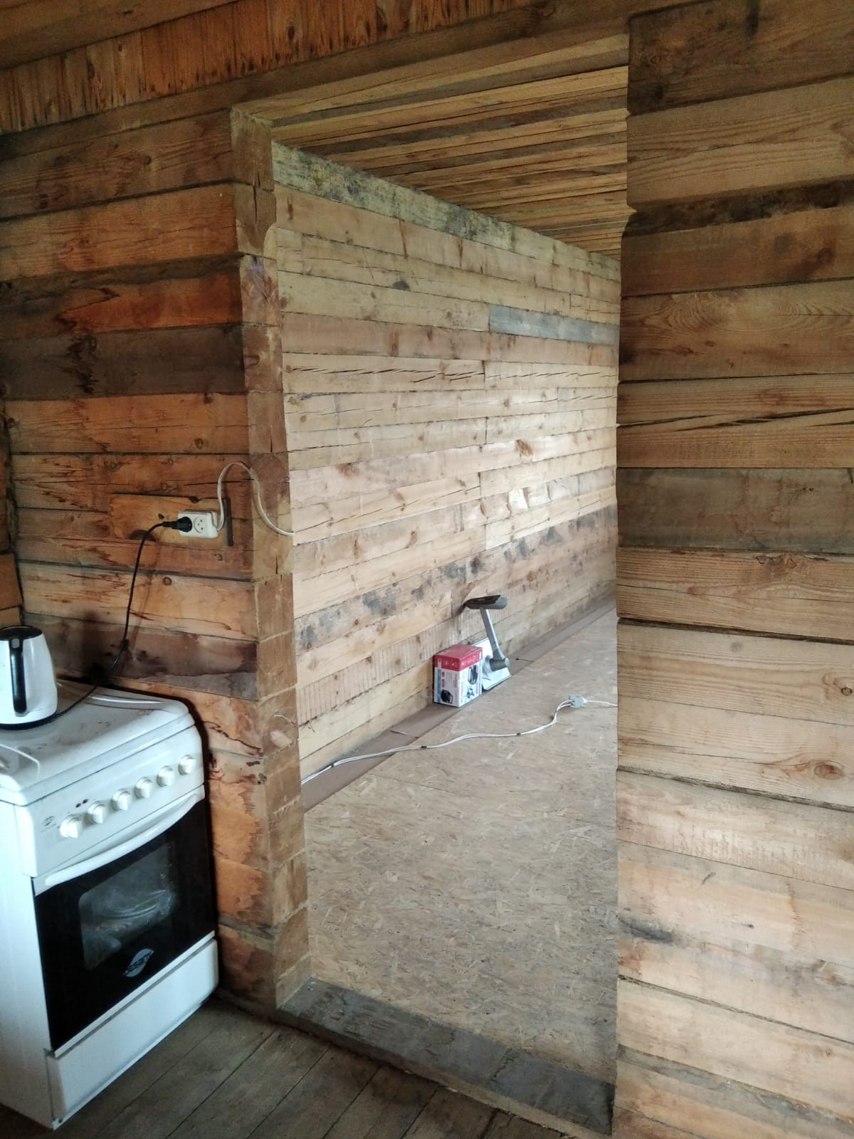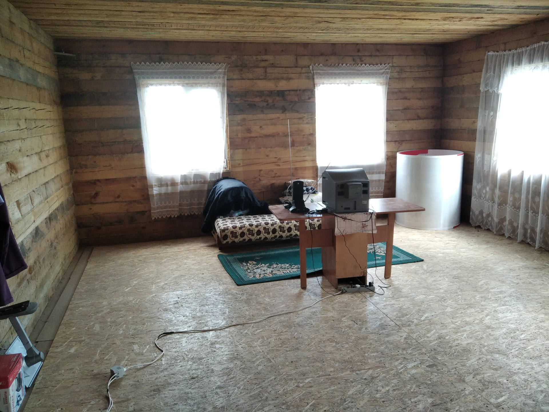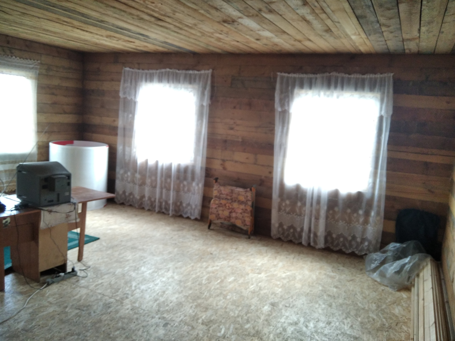 Большая комната проконопачена льном, обработана медным купоросом.На пол положен OSB.