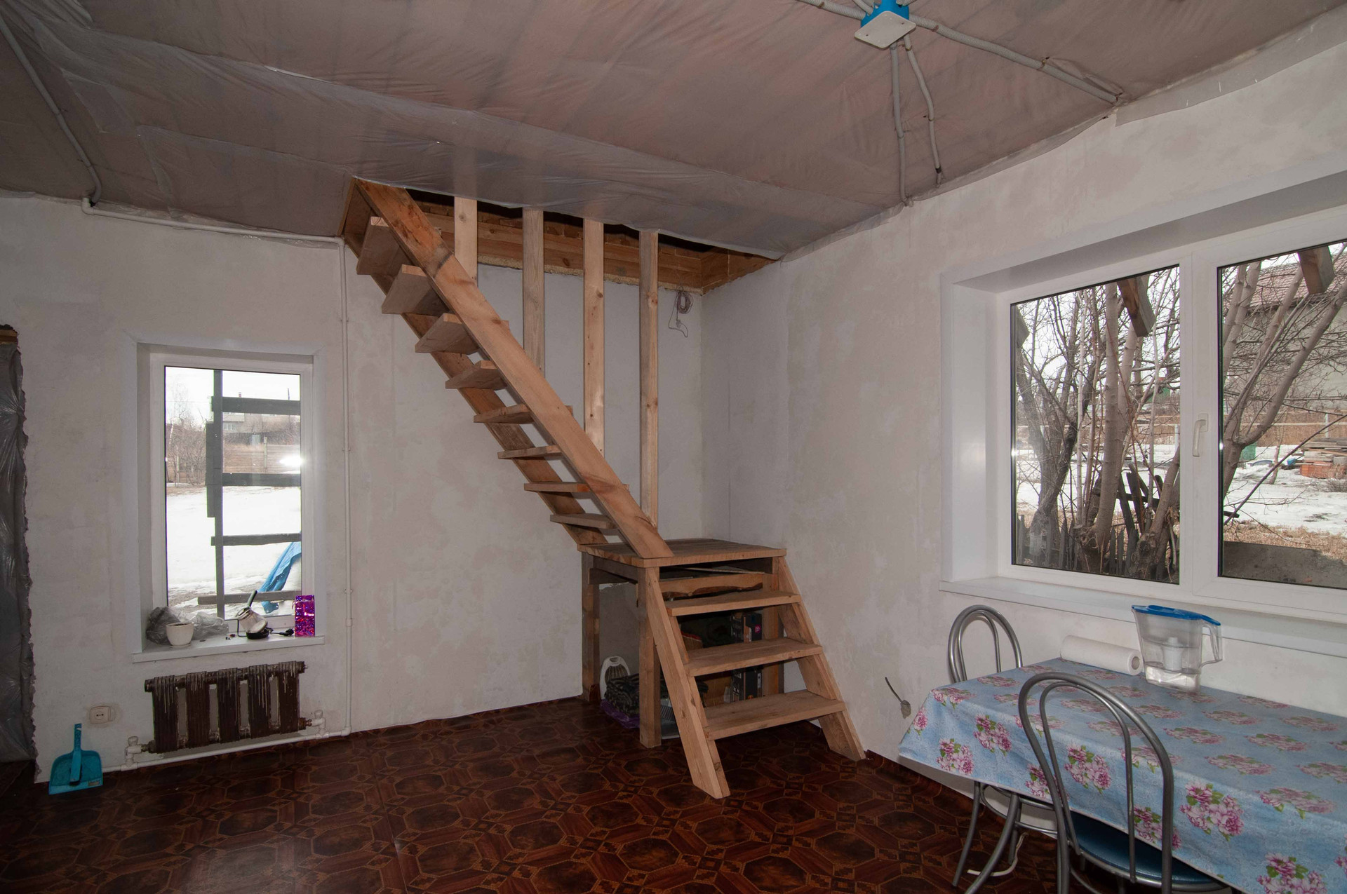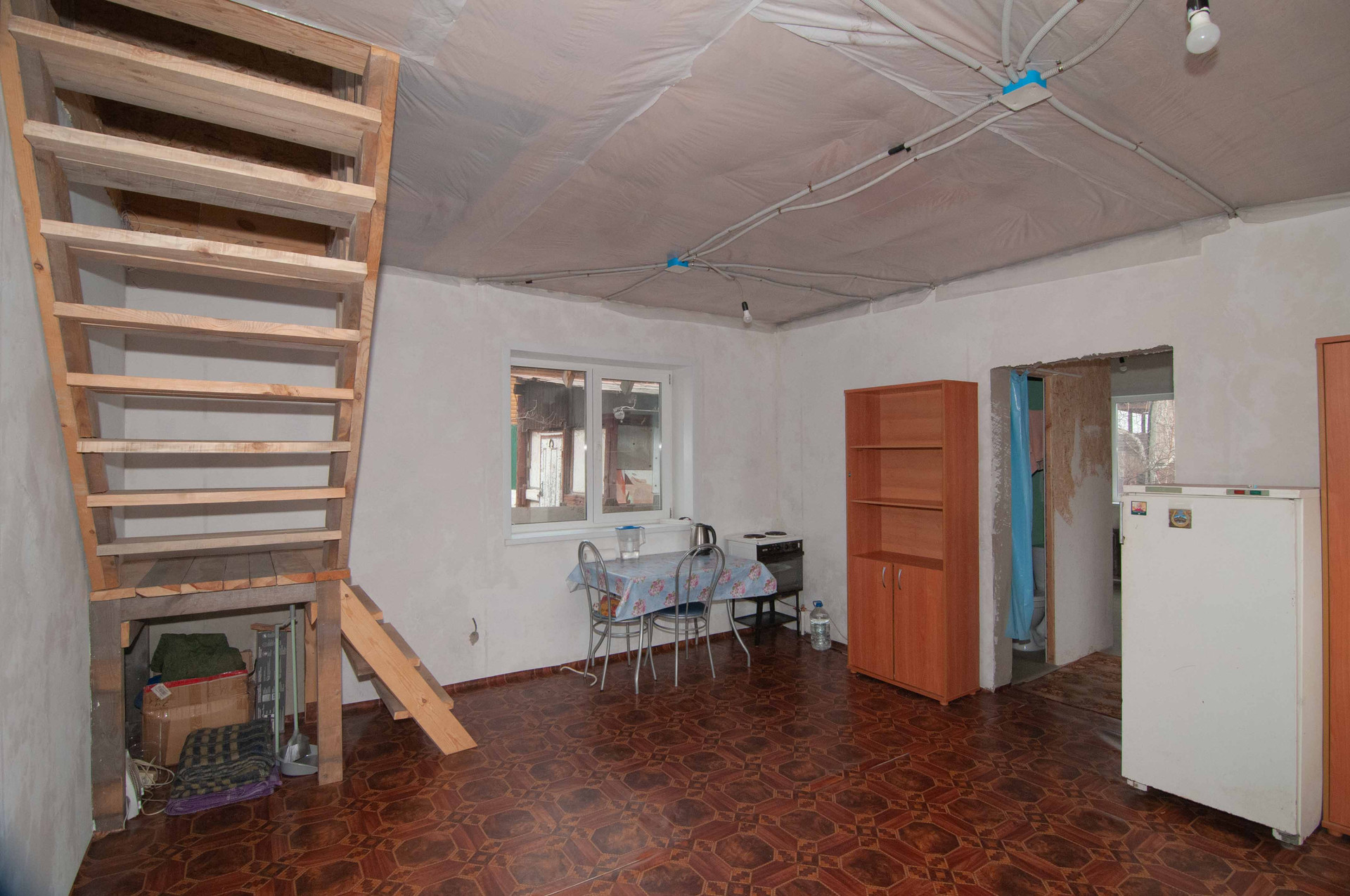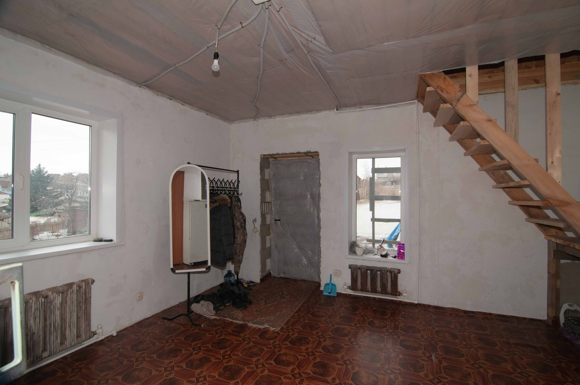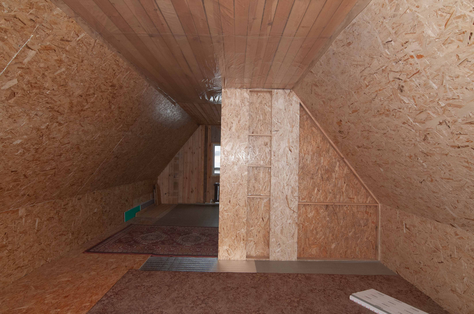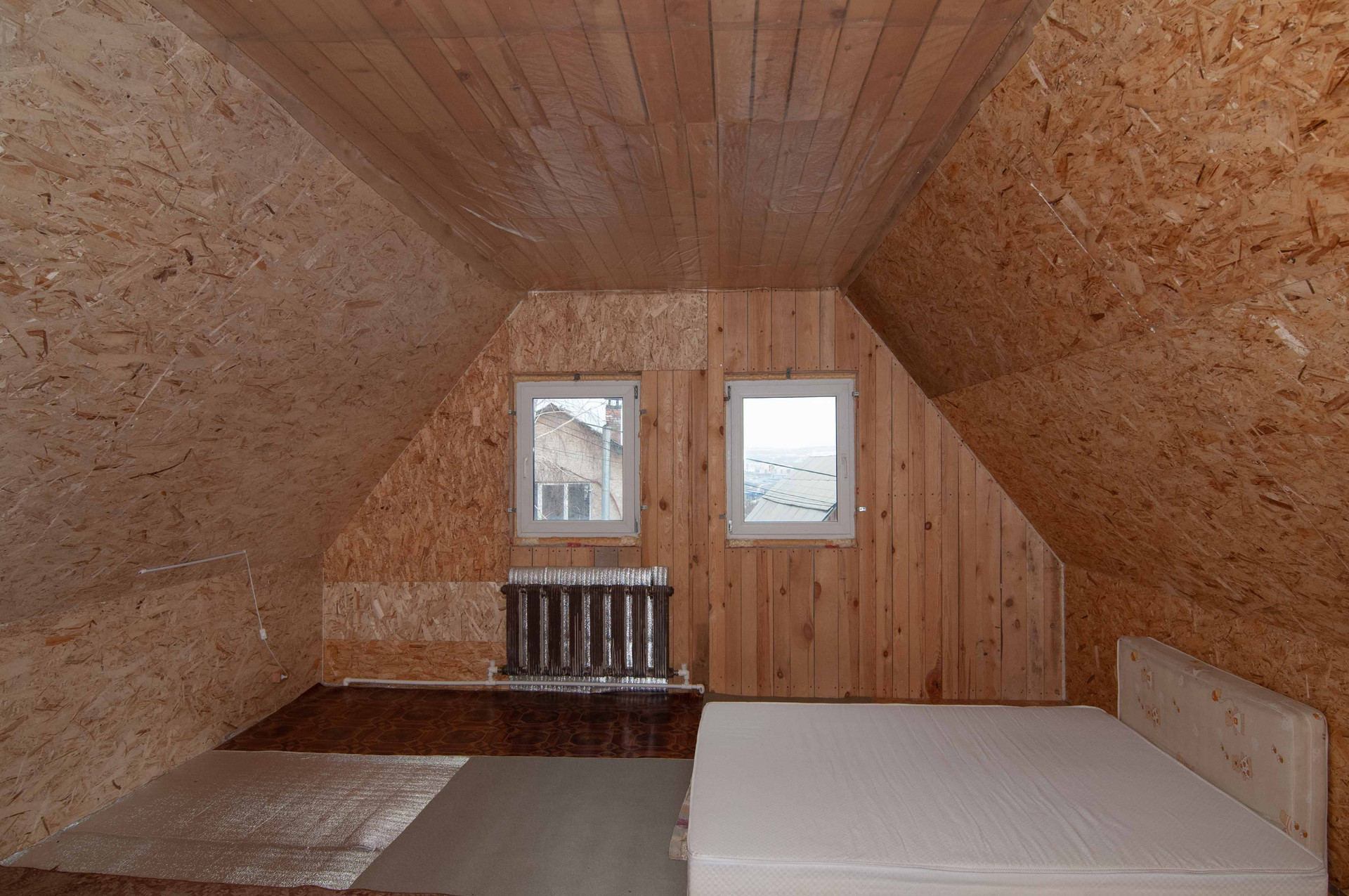 На первом этаже 2 отдельные комнаты и кухня гостиная, на втором этаже утепленная мансарда свободной планировки.