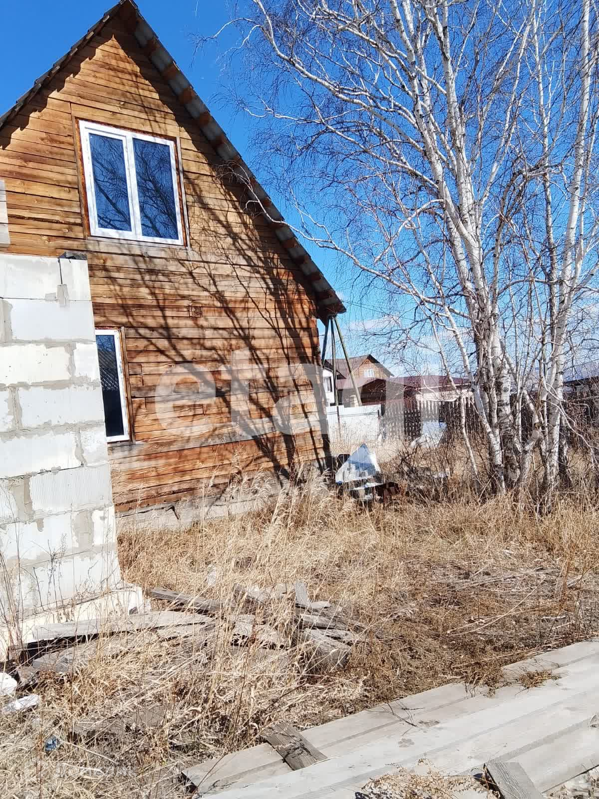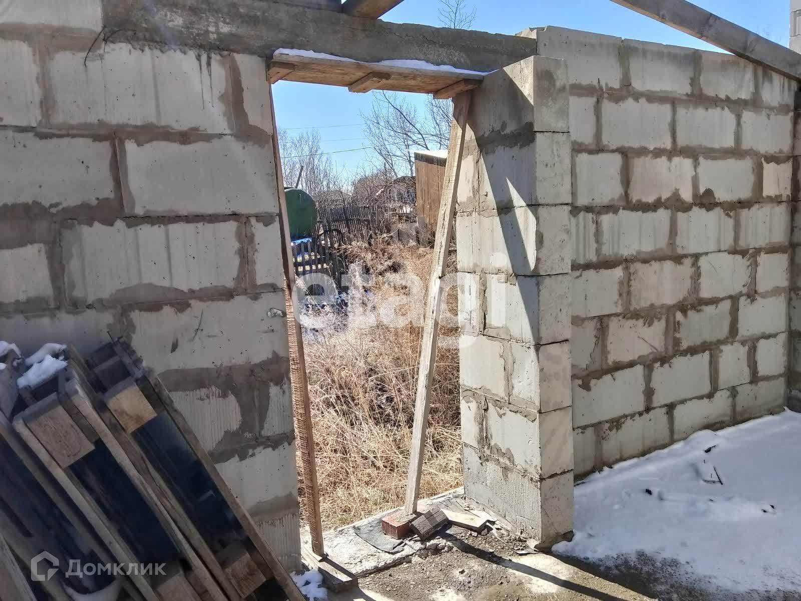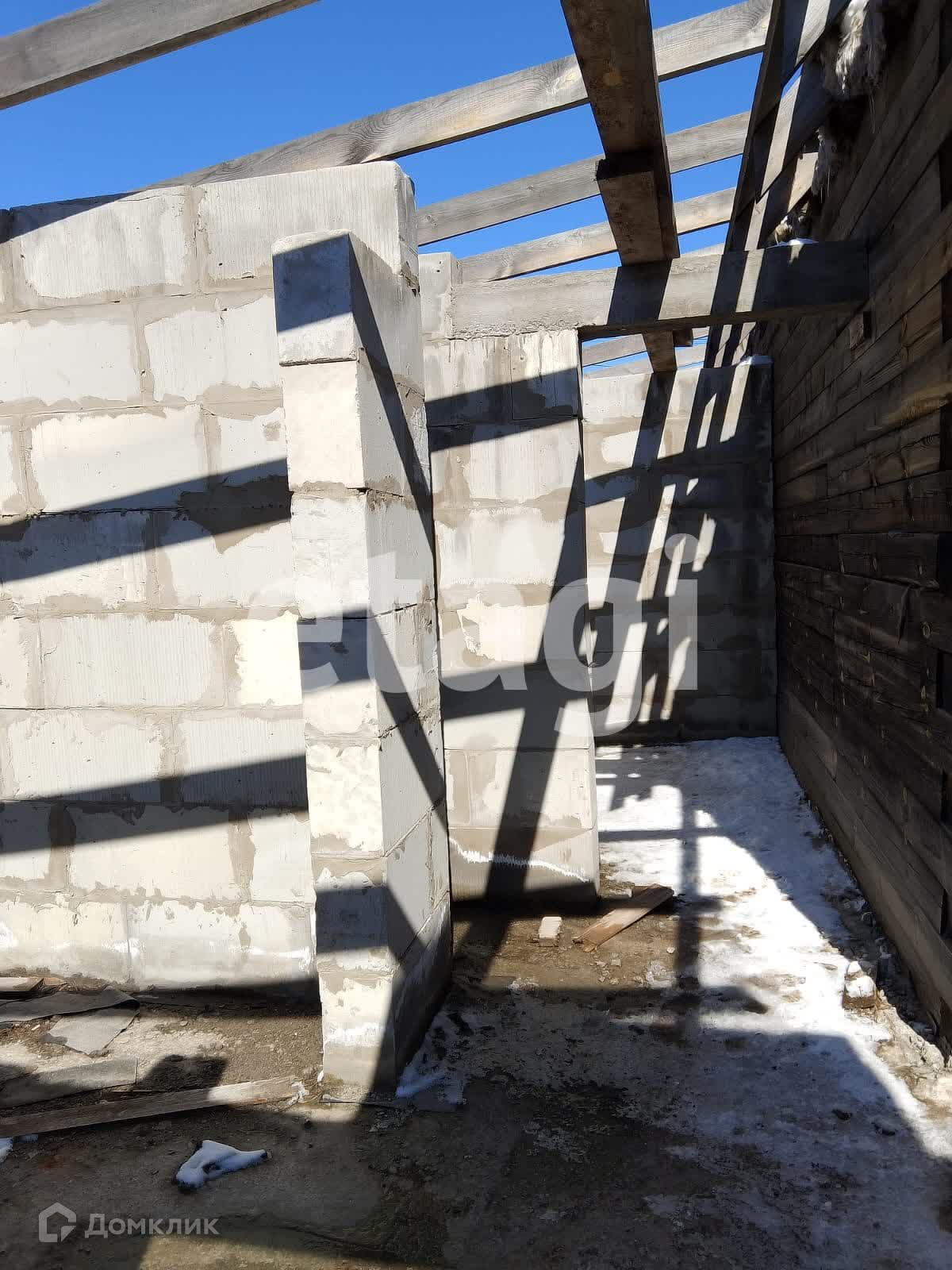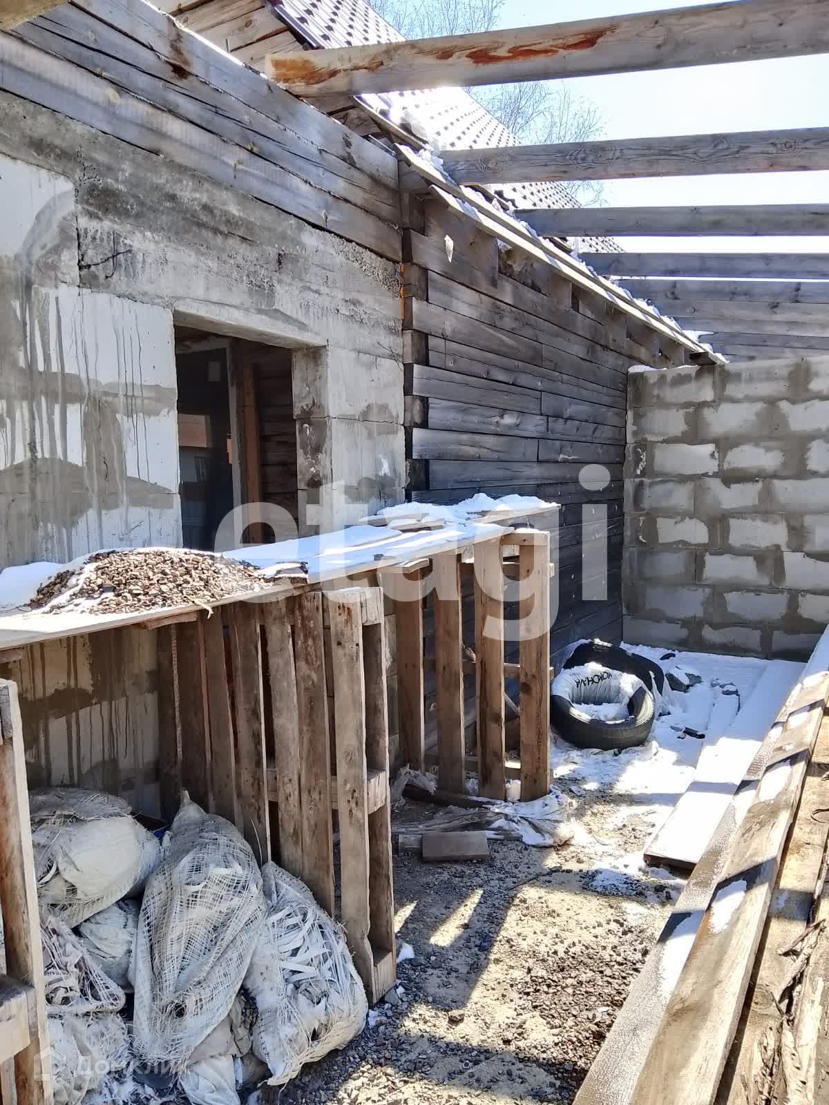 Дом стоит на добротном ленточном фундаменте, выложен из бруса, 2 этажа. Крыша двускатная с качественной кровлей. На дом закуплен утеплитель. К дому пристроен вместительный гараж с отделенным помещением для хранения и ремонта. Куплены откатные ворота -нужно лишь установить. Котельная внешняя, по проекту имеет выход их дома. Так же выложено помещение для сауны, но может использоваться для любых целей, например, хранения. На входе в дом установлена бетонная плита для беседки. На участке растут березы, открывается вид на город, огорожен профлистом.