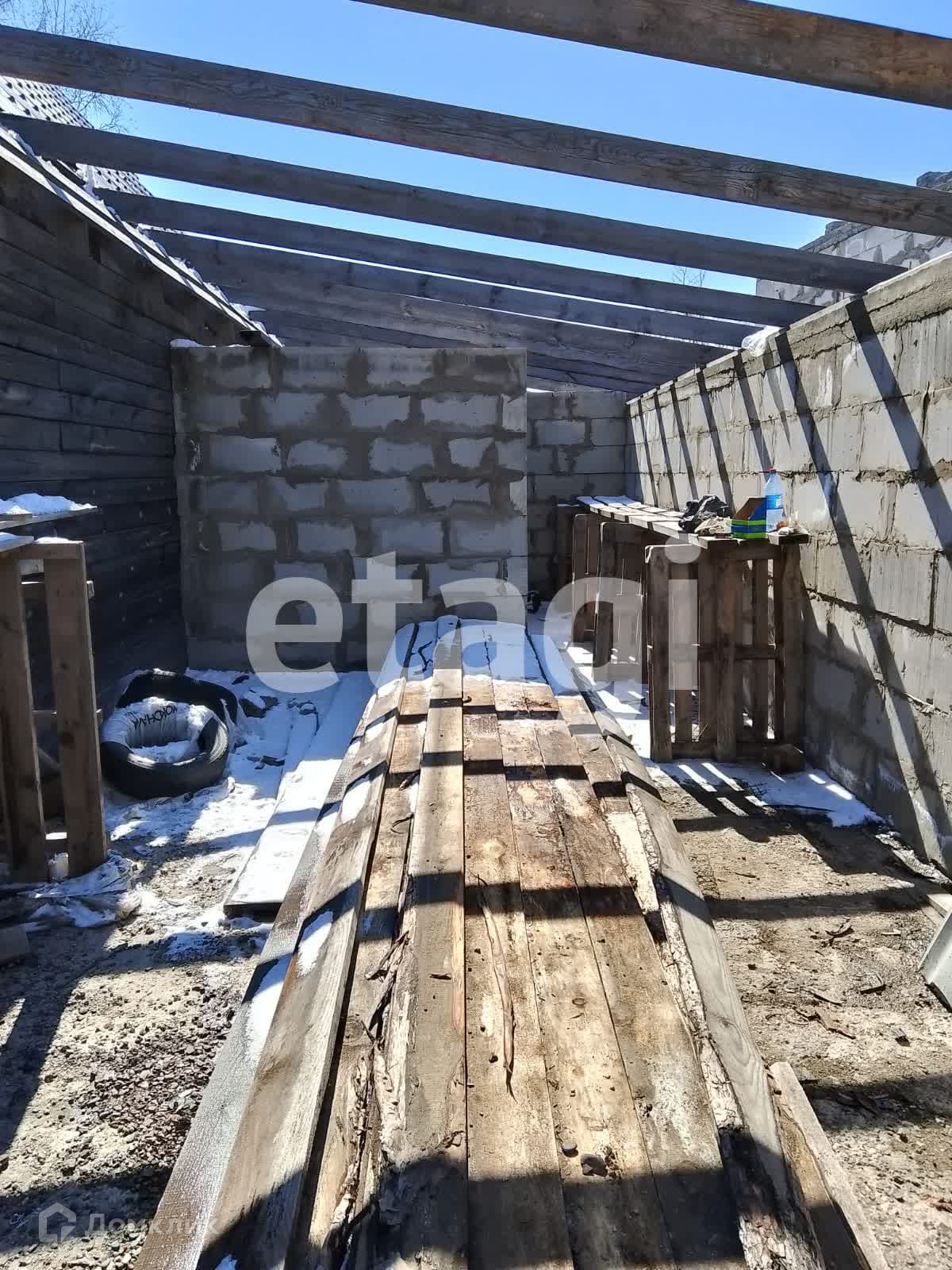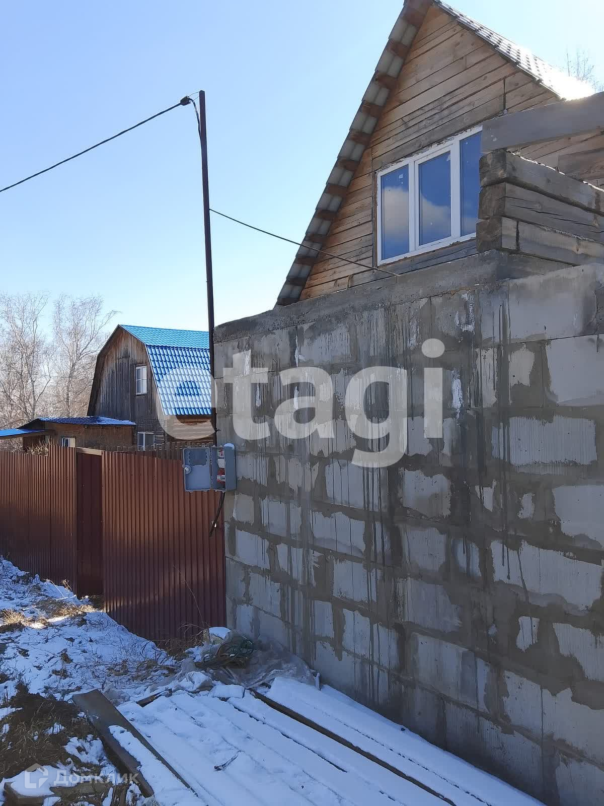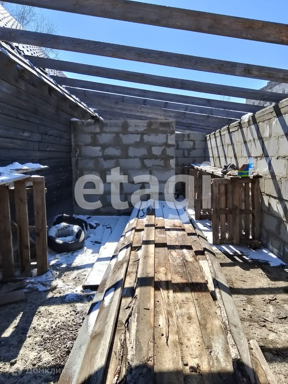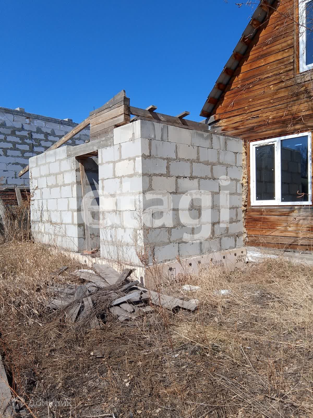 Дом стоит на добротном ленточном фундаменте, выложен из бруса, 2 этажа. Крыша двускатная с качественной кровлей. На дом закуплен утеплитель. К дому пристроен вместительный гараж с отделенным помещением для хранения и ремонта. Куплены откатные ворота -нужно лишь установить. Котельная внешняя, по проекту имеет выход их дома. Так же выложено помещение для сауны, но может использоваться для любых целей, например, хранения. На входе в дом установлена бетонная плита для беседки. На участке растут березы, открывается вид на город, огорожен профлистом.