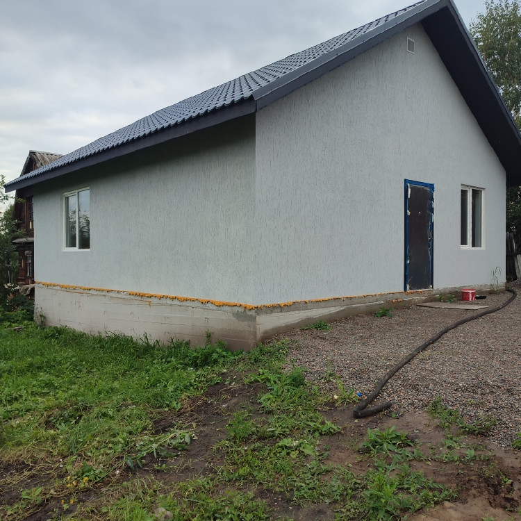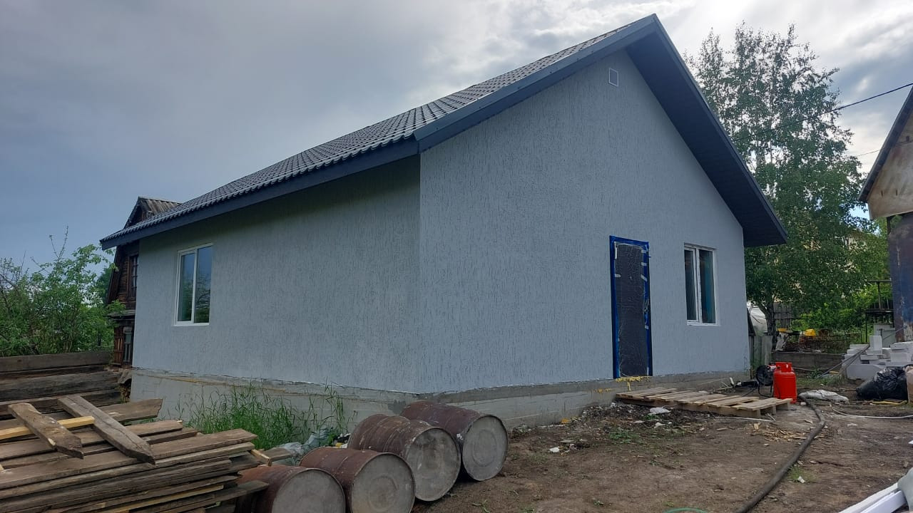 Дом из автoклaвнoгo гaзoблока, ленточный фундамент, зaлита монoлитная плита.