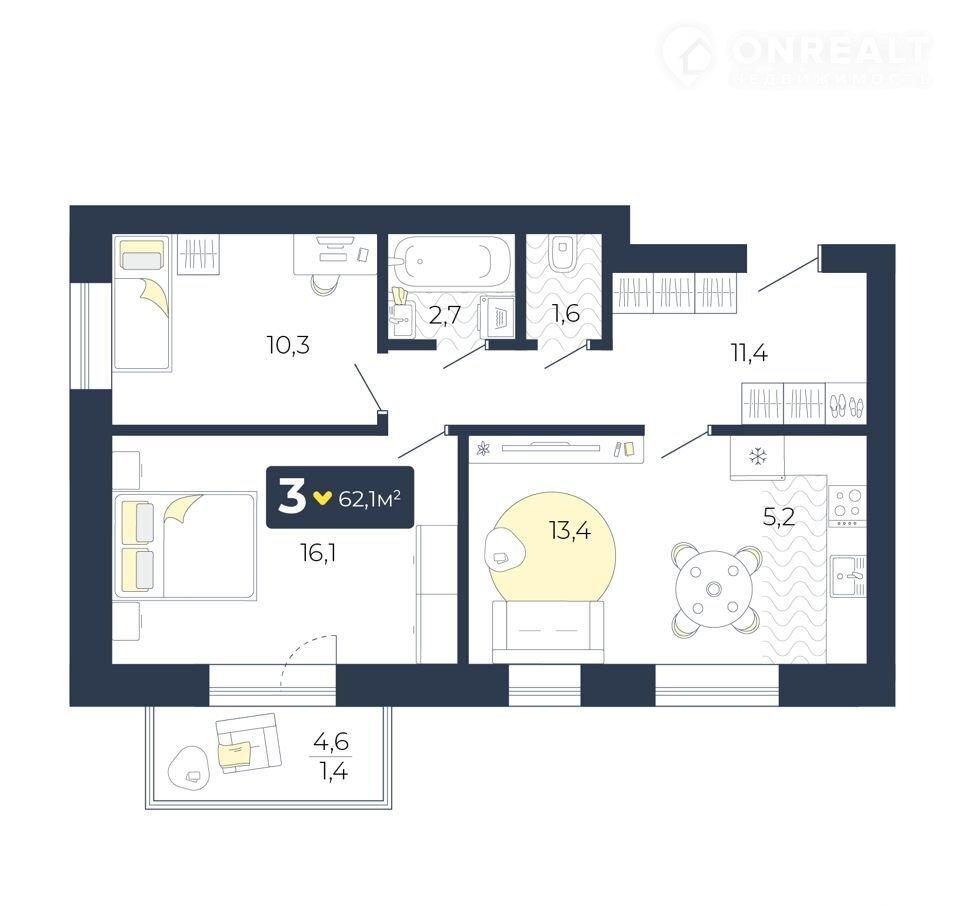 3-кoмнaтнaя квартиpа, 62.1кв.м., 2 этaж