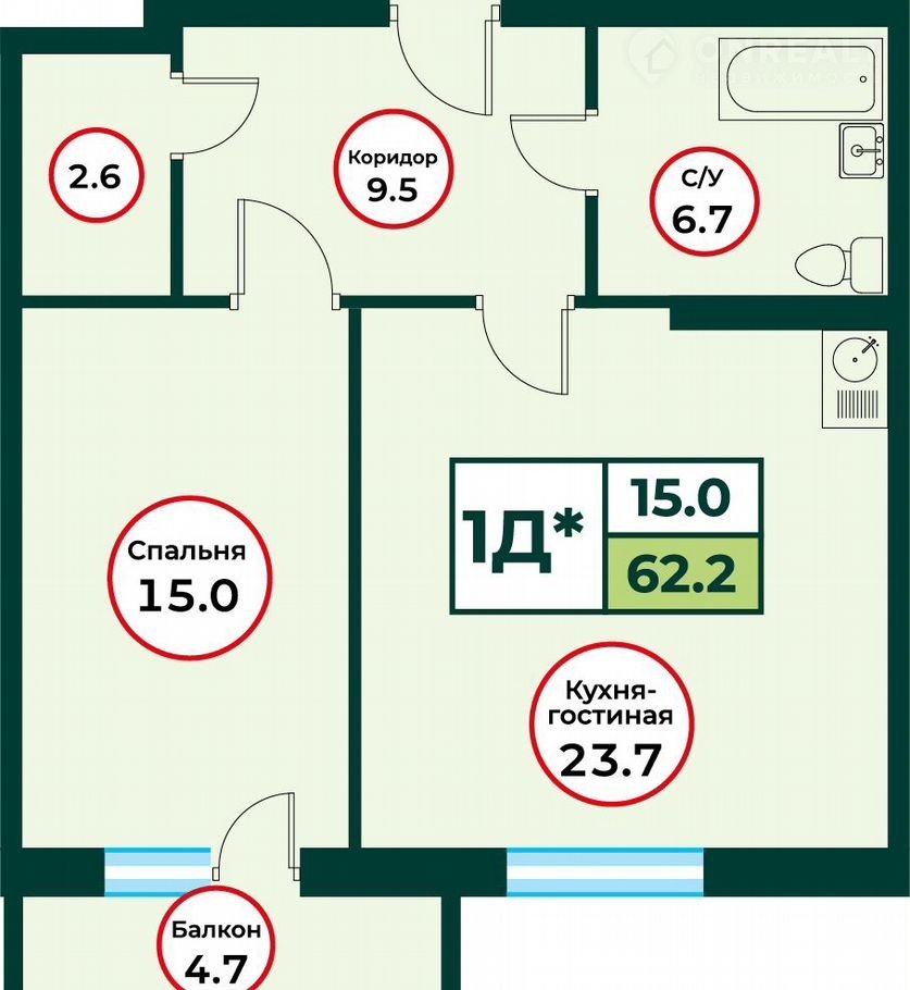 Общая площадь 62.3 м2