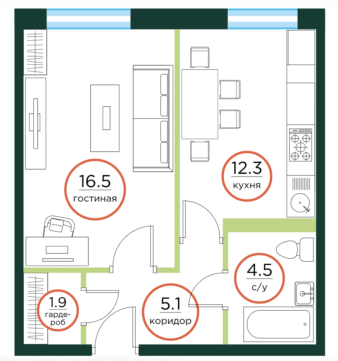 Площадь кухни 12.3 м2