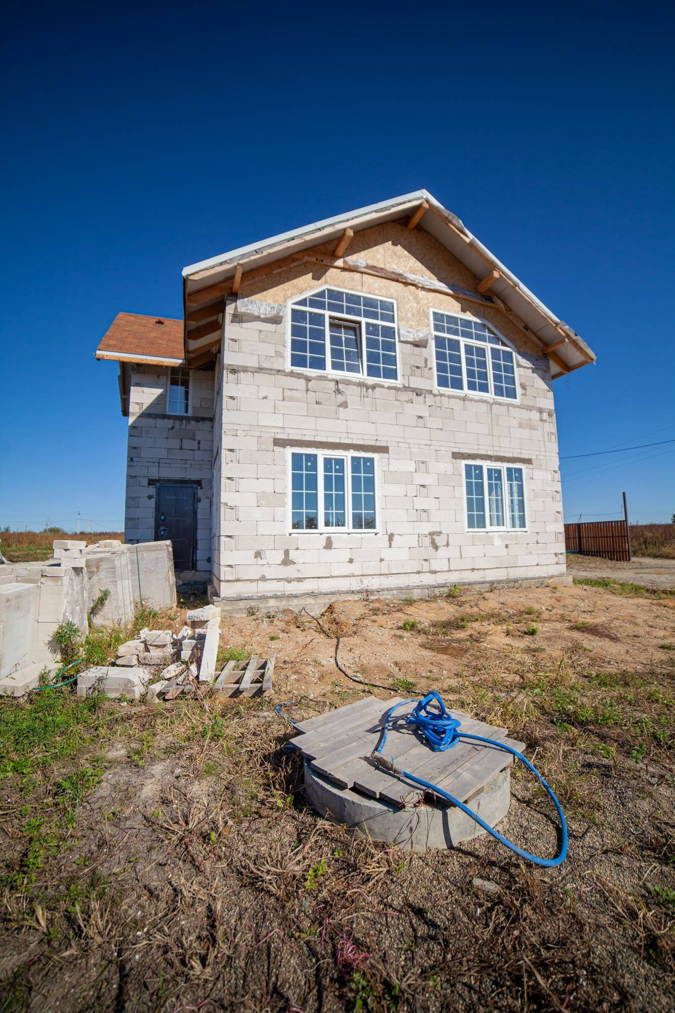 Дом построен из газоблока СИБИТ D500, толщиной 300мм. Площадь дома 158м.кв. 1й этаж. 9,4*7.4м, высота потолка 2.7м, 2й этаж мансардный такой-же площадью высота стен 2.4, а в высокой части -5м , Есть электричество 15кВт, вода заведена в дом (из колодца в дом через скваженый насос).