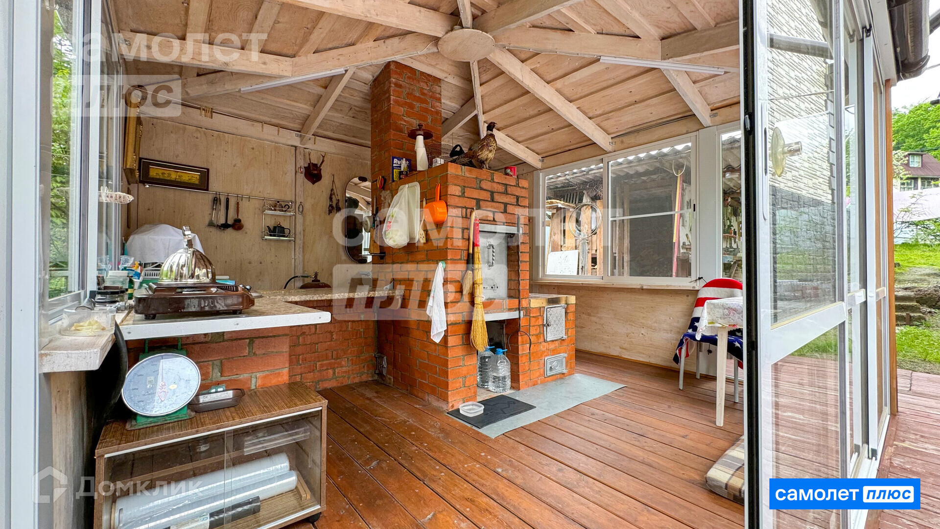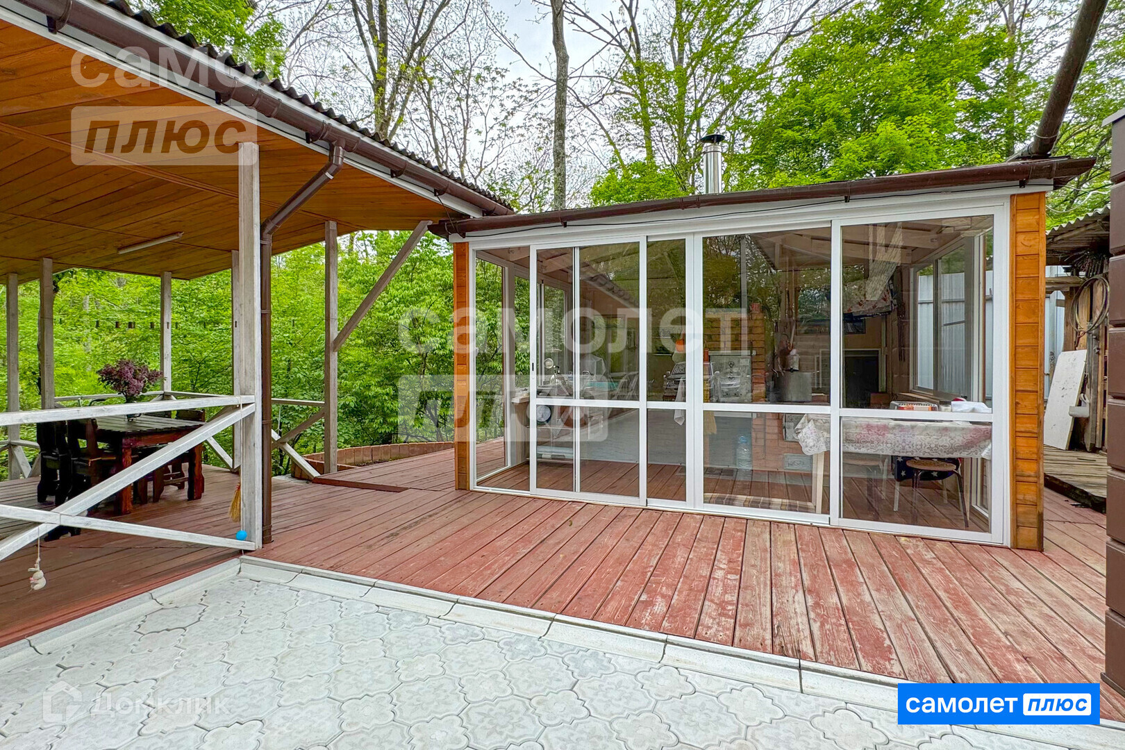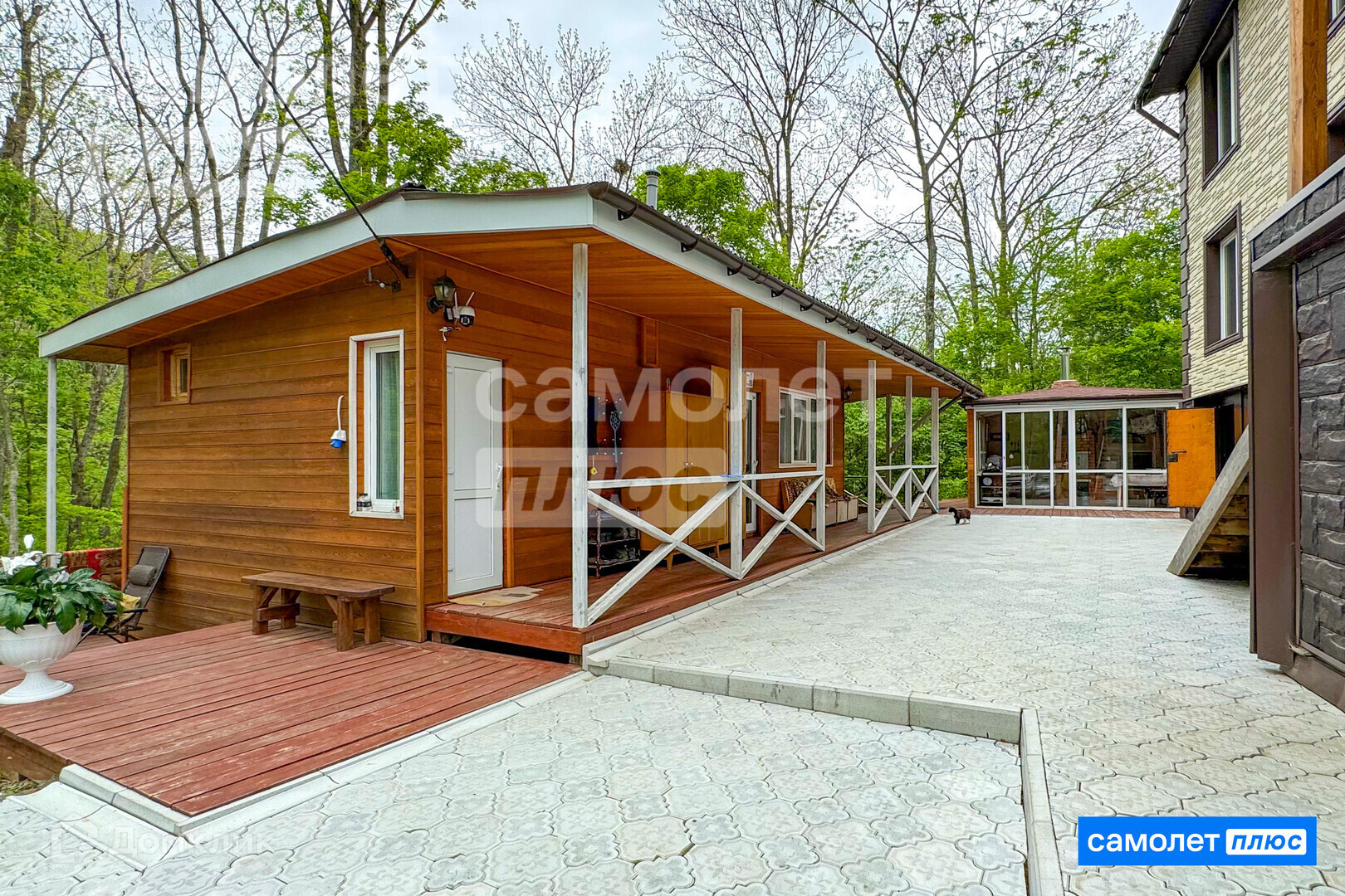 ВТОРОЙ ЖИЛОЙ ДОМ 42м.кв с БАНЕЙ - гостевой, со всеми коммуникациями для зимнего проживания ( сауна, санузел, гостевая комната). Вокруг него выстроена крытая терраса и веранда для отдыха, с витражным остеклением, и полностью распашными дверьми!