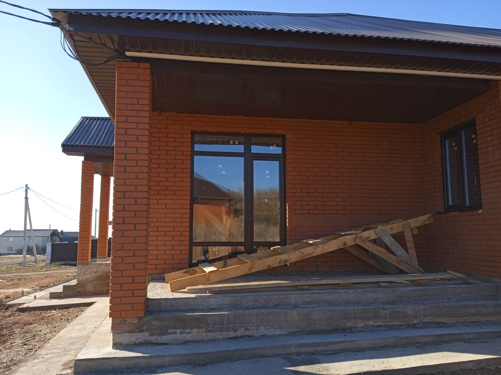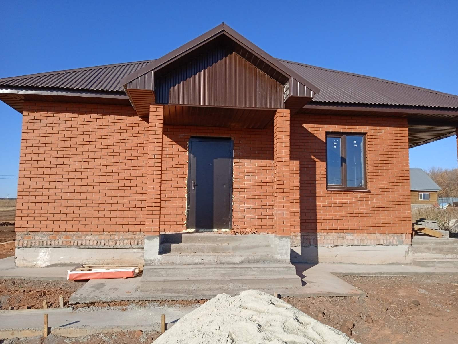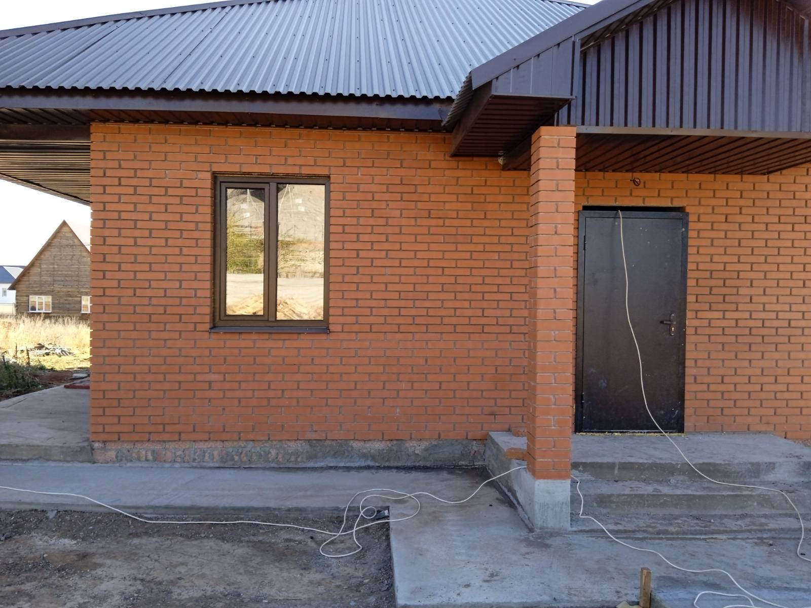 Крыша утепленная эковатой. Профлист шоколад. Окна ламинирование в цвет крыши, двухкамерный энергосберегающий стеклопакет. Металлическая входная дверь.