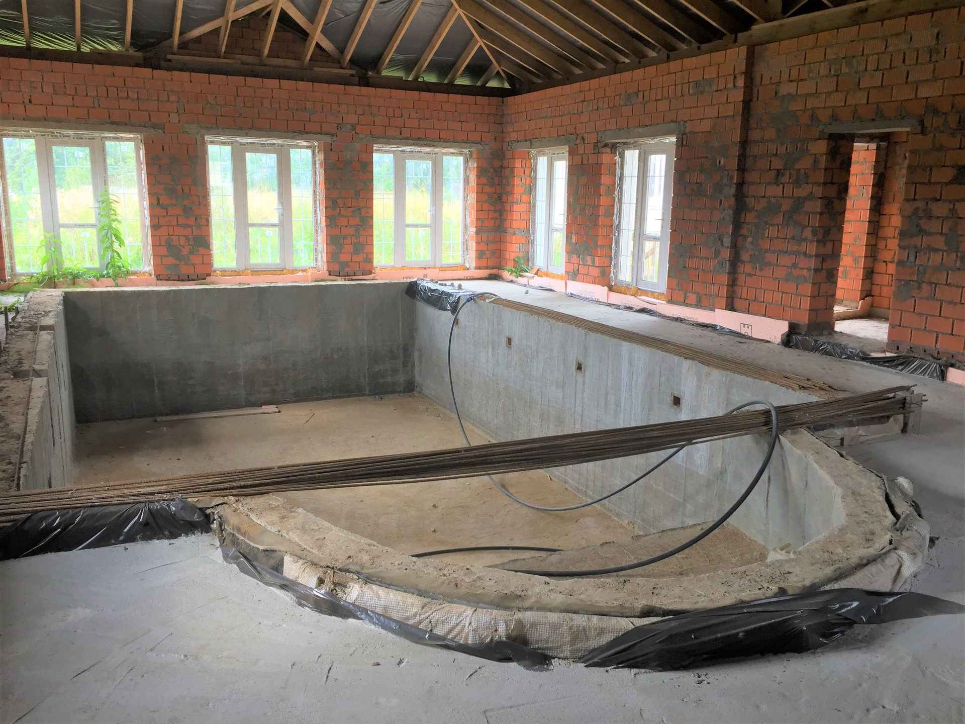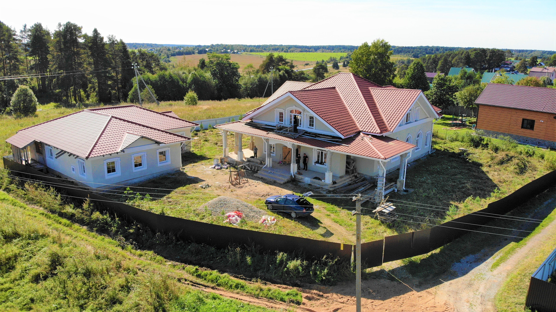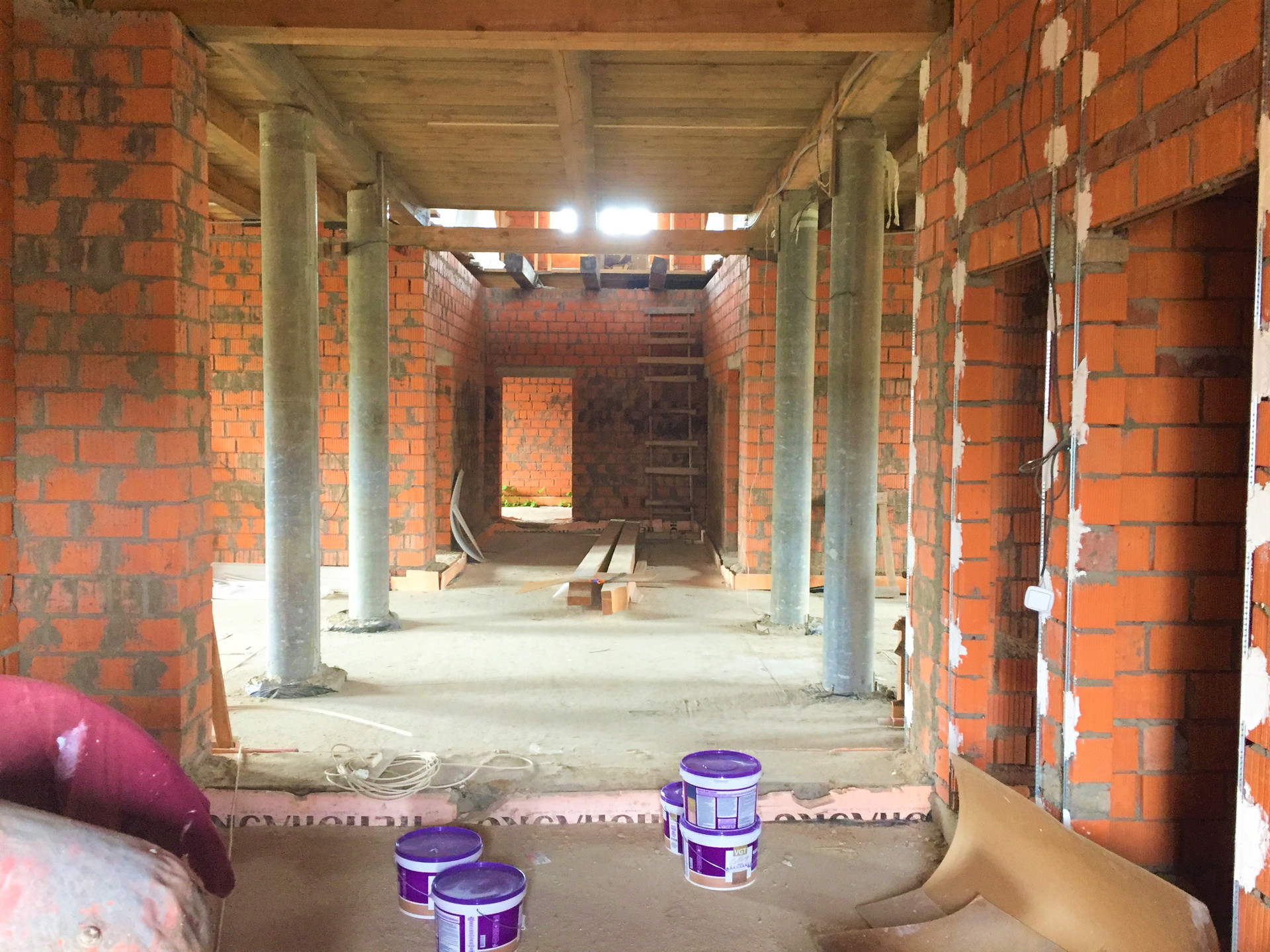 Фундамент – свайно-ростверковый (площадь 21 на 19 м. по внешнему периметру). Коробка – керамический кирпич, толщина стен – 60 см. Кровля металло-черепица (производство Бельгия).