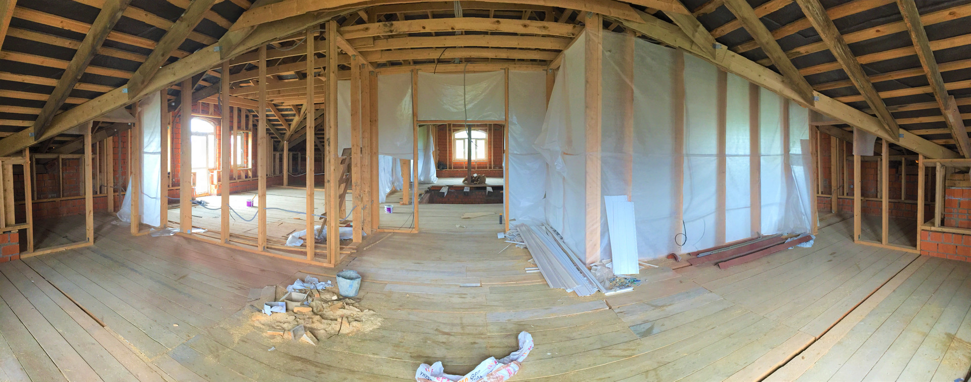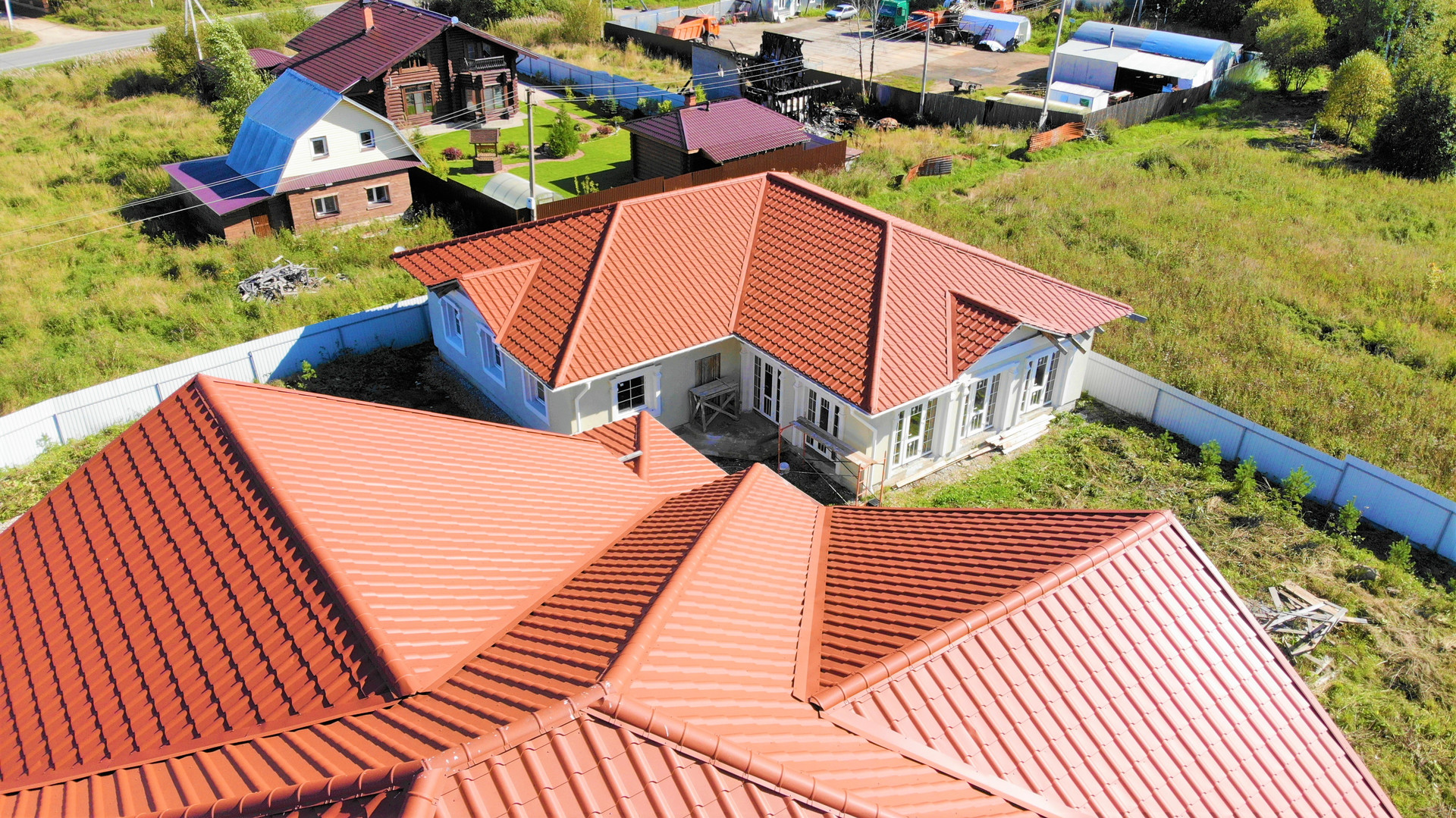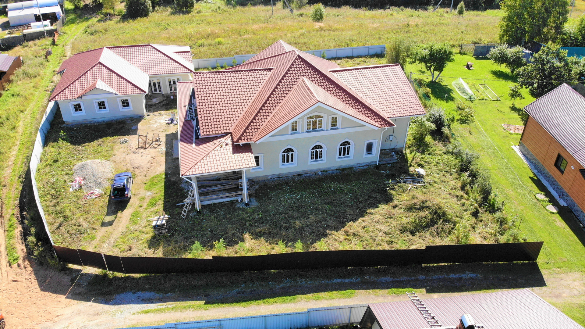 Фундамент – свайно-ростверковый (площадь 21 на 19 м. по внешнему периметру). Коробка – керамический кирпич, толщина стен – 60 см. Кровля металло-черепица (производство Бельгия).
