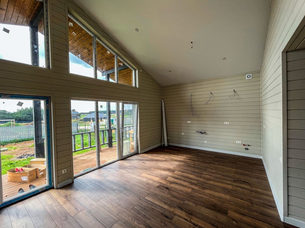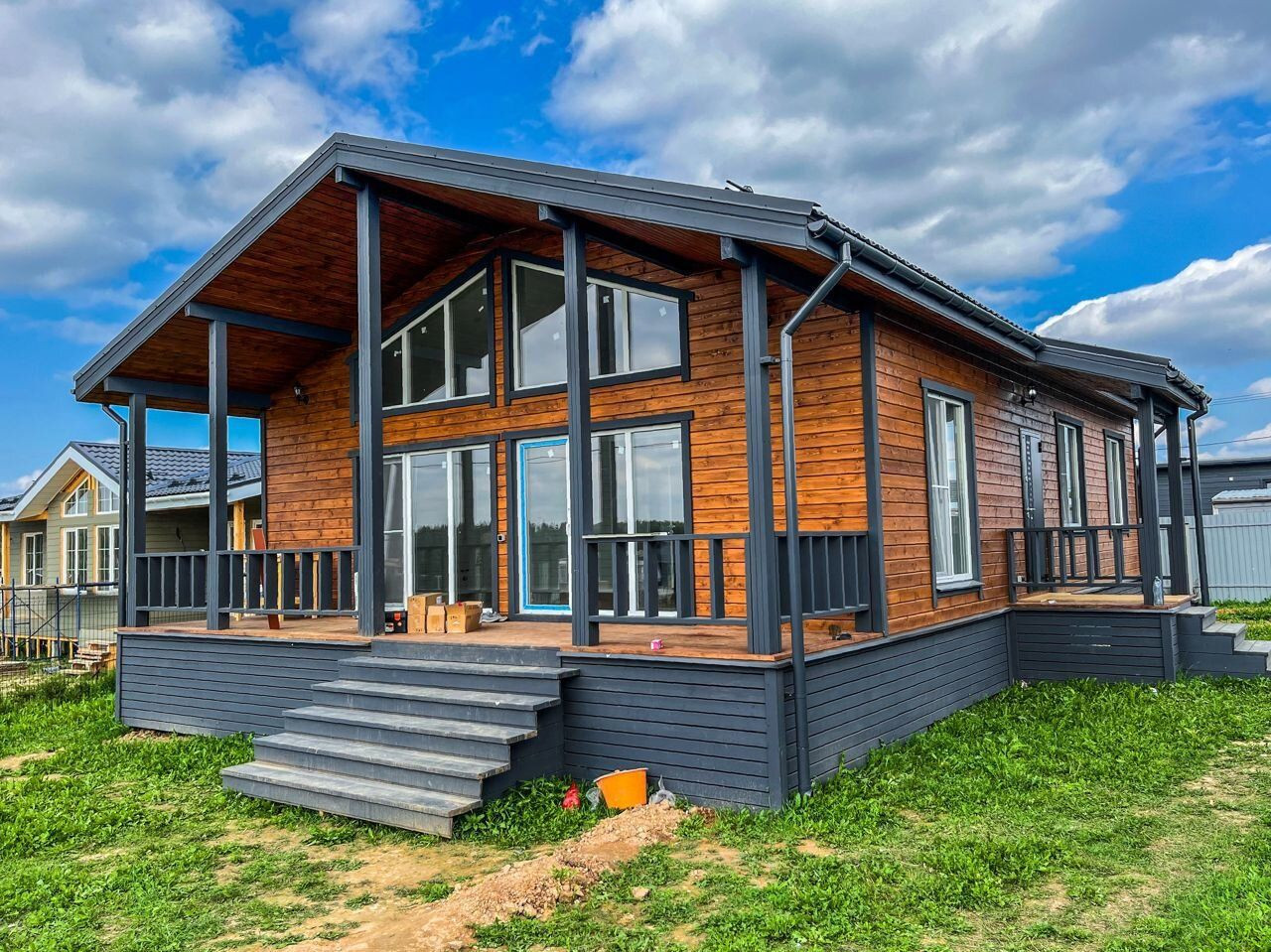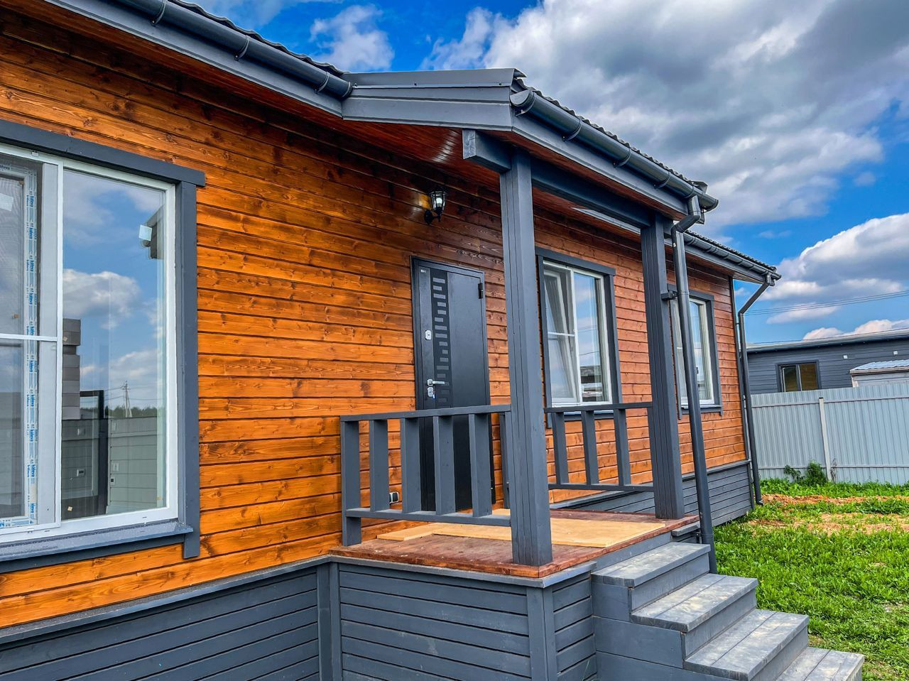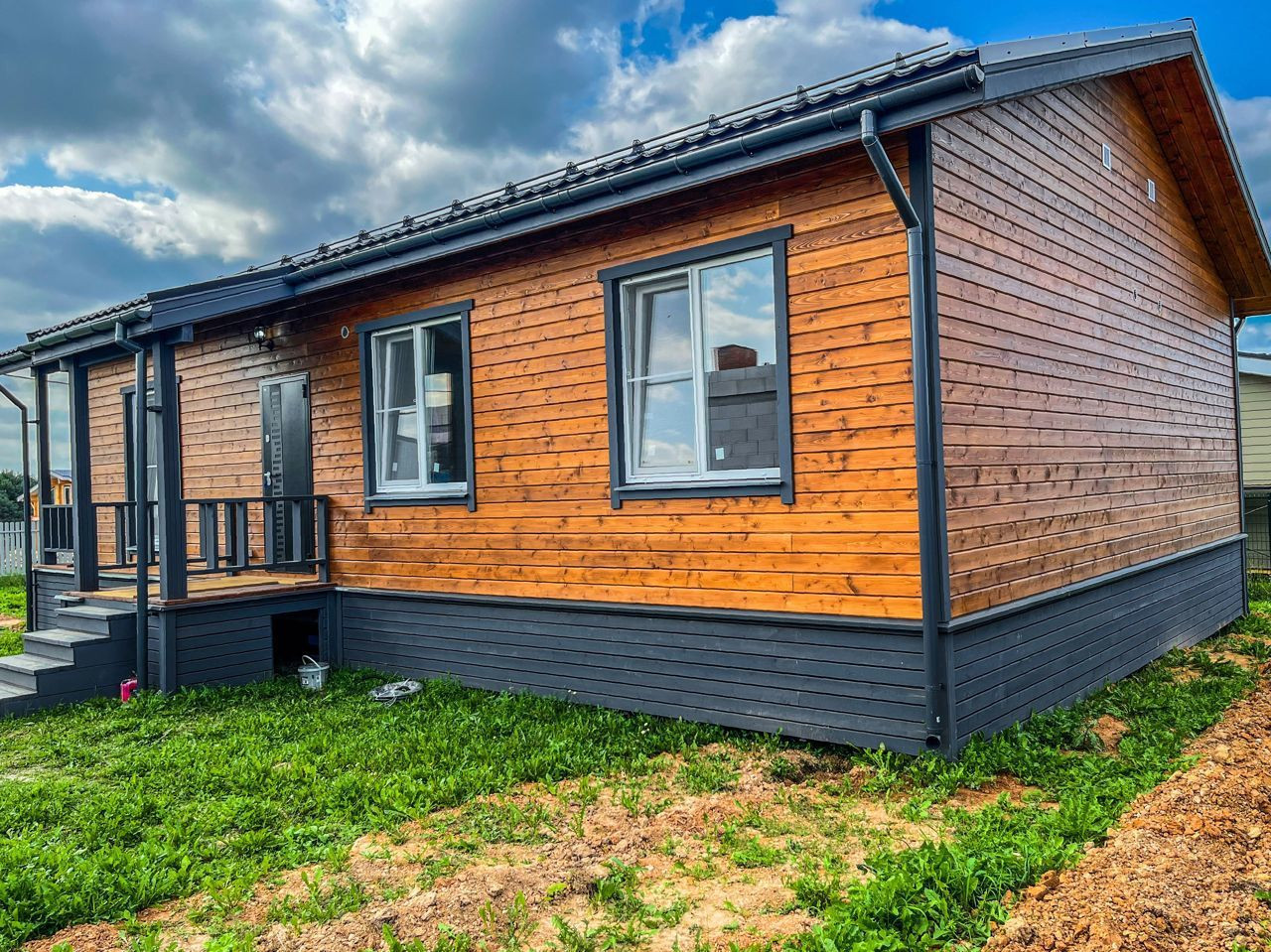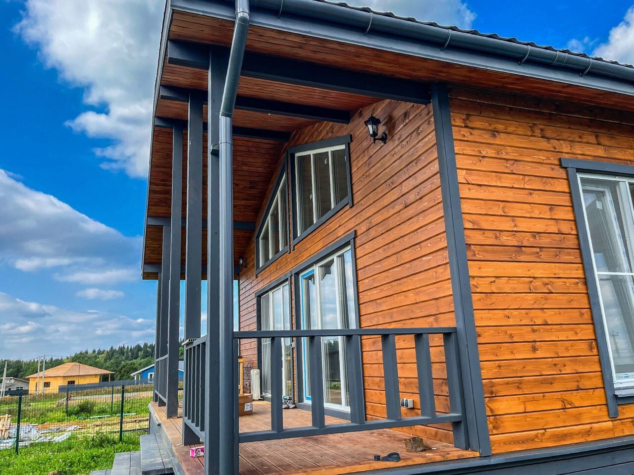 Вариант 1: Отделка фасада в стиле фахверк (светлые стены + тёмная расшивка): монтаж панелей ЦСП с устройством вент. зазора, покраска на два раза фасадной краской, монтаж антисептированой расшивки из лиственницы, наружная отделка окон