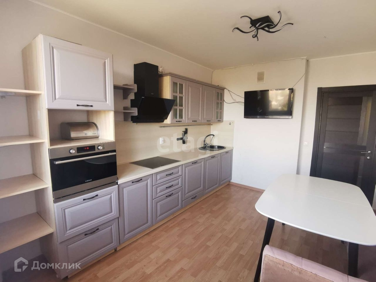 Кухня площадью 13.36 м2, остаётся гарнитур с электрической варочной поверхностью на 4 места, и вытяжка, другая техника - по договорённости. Есть возможность для установки посудомоечной машины. Интернет и тв от МТС.