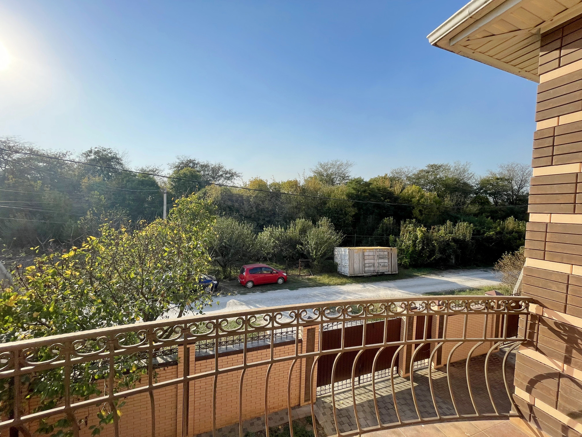 Территория двора покрыта тротуарной плиткой, по периметру кирпичный забор, железные ворота, капитальный навес.