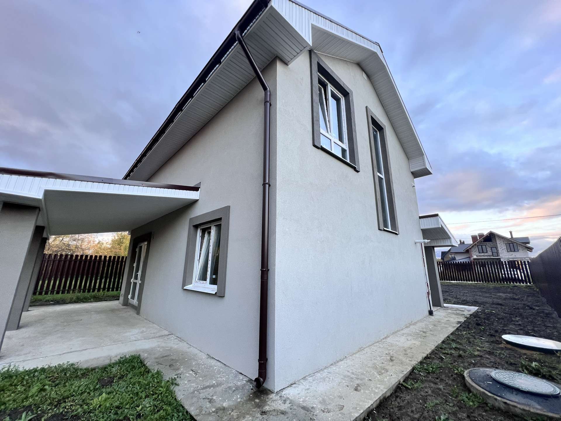 Дом продается с пред чистовой отделкой – стяжка пола, отштукатурены стены. Разводка отопления на 2-х этажах (водяные теплые полы), разводка электрики, сантехники, газ.
