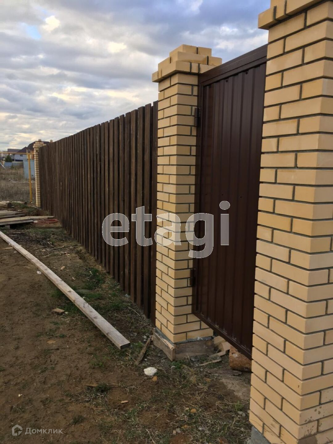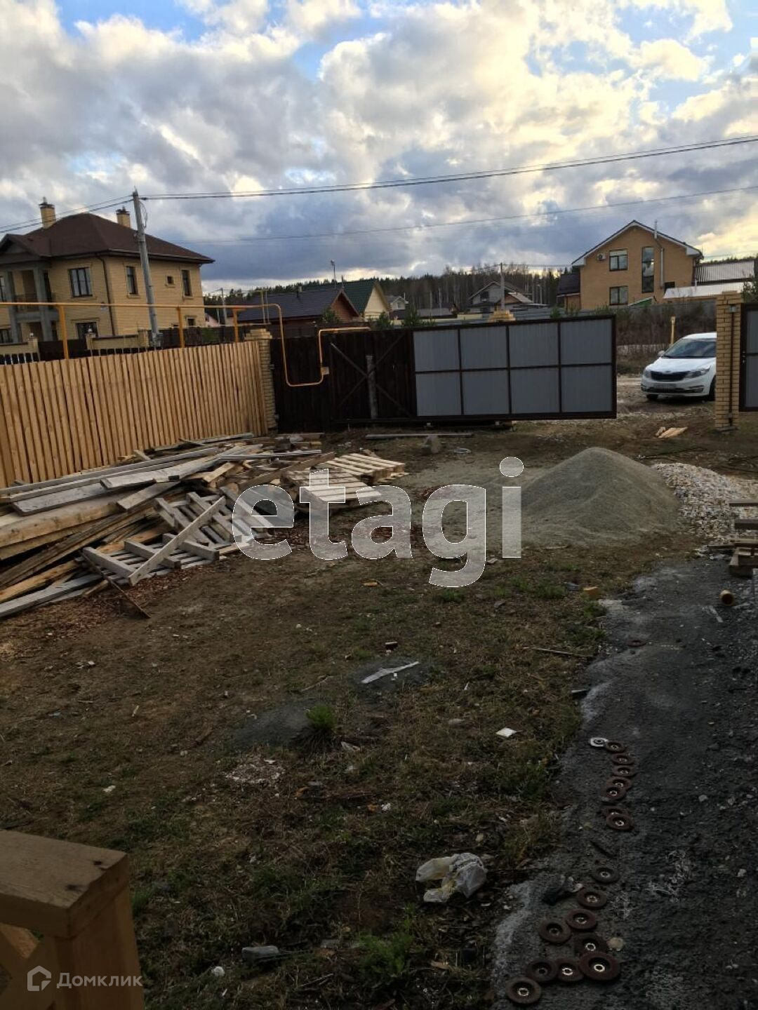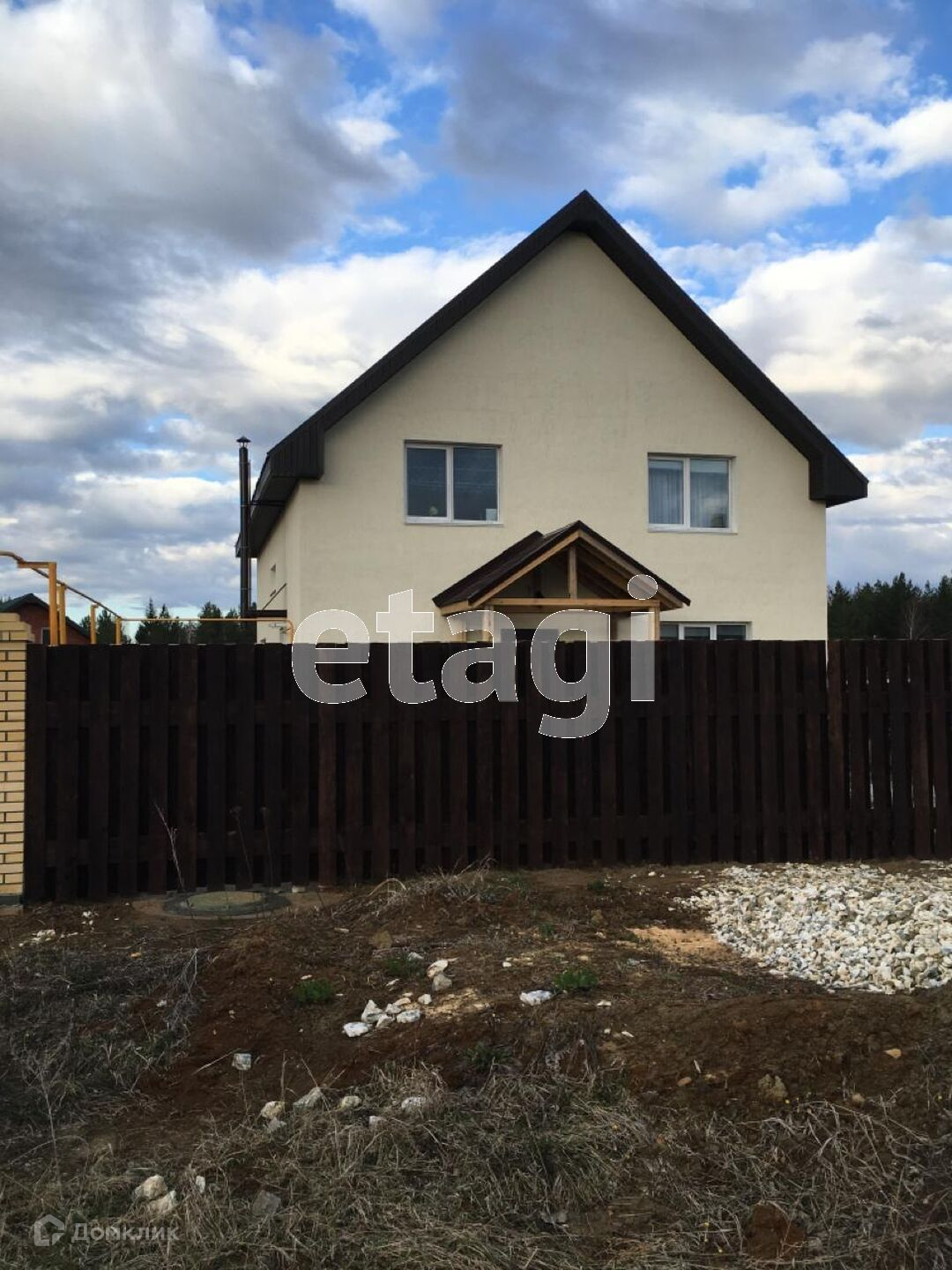 Участок обнесен забором из шоколадного профлиста на бетонном ростверге, парадный вход на территорию оснащен откатными воротами. Двор отсыпан белым щебнем. На участке есть баня .