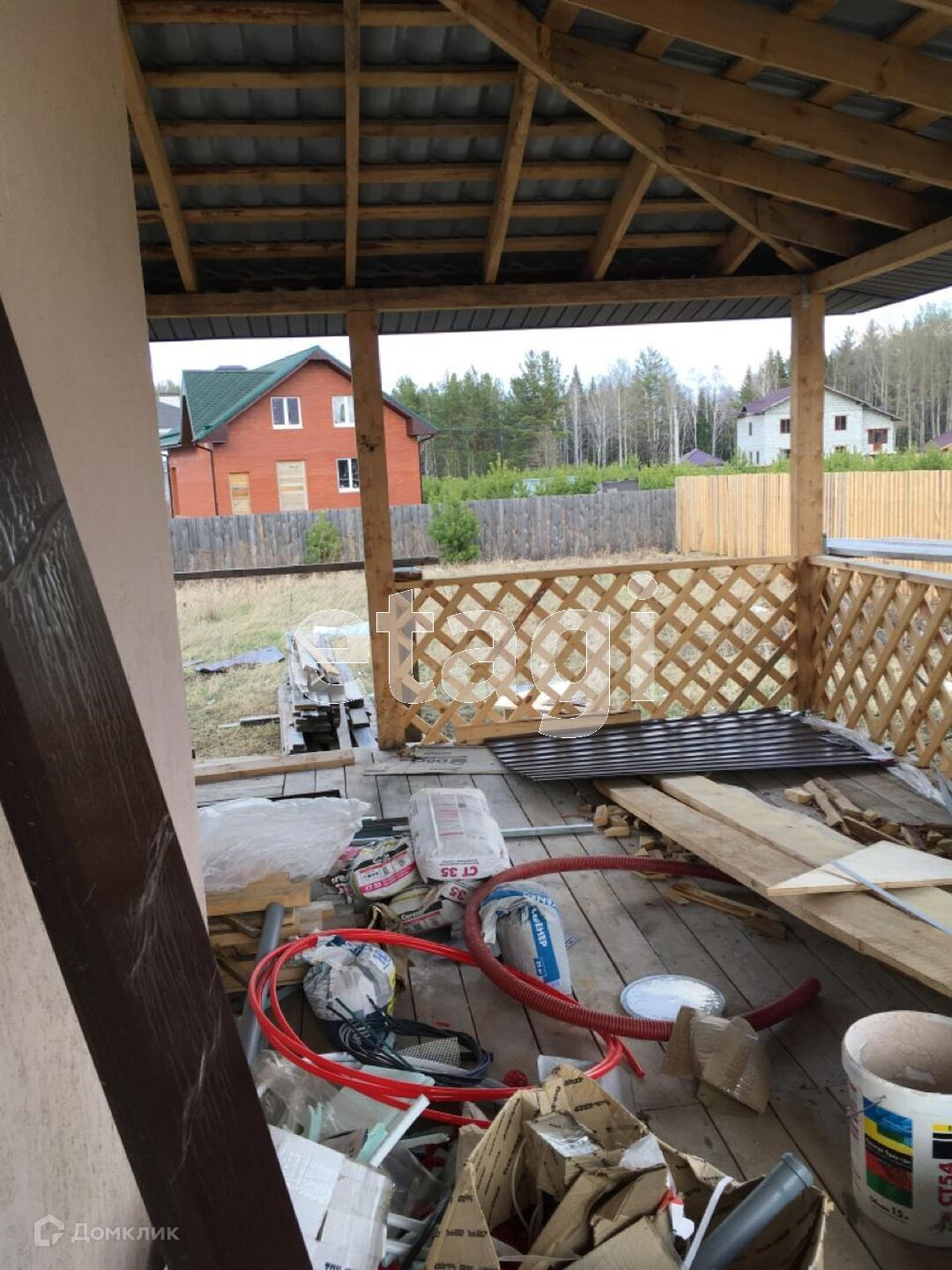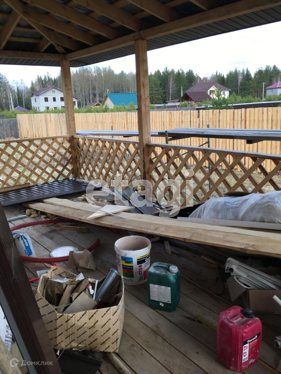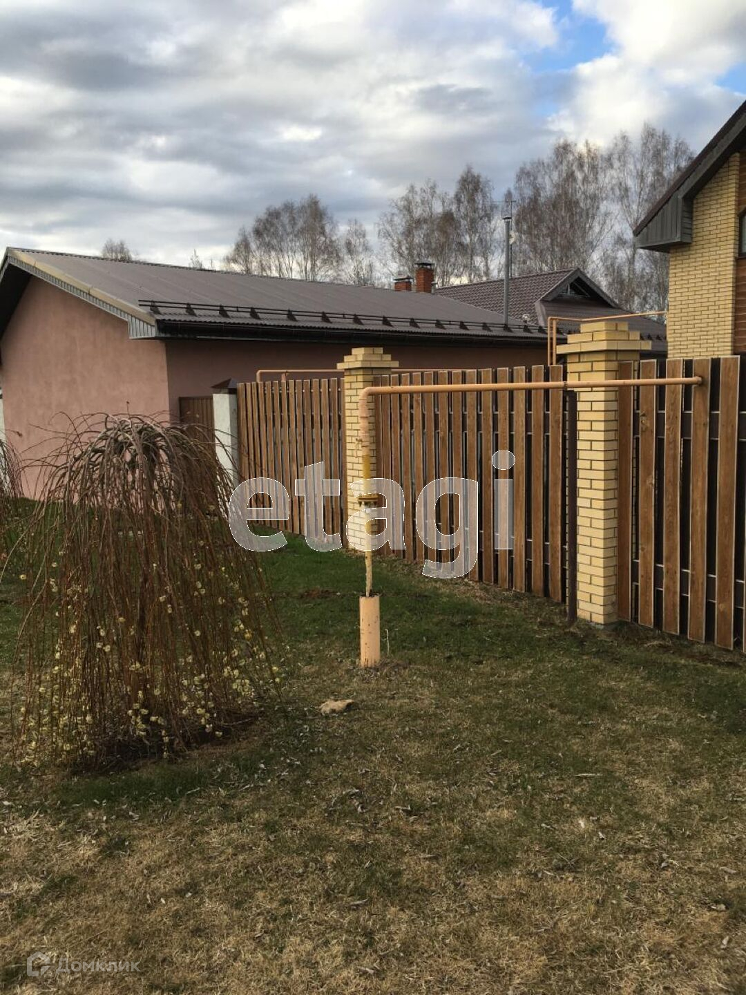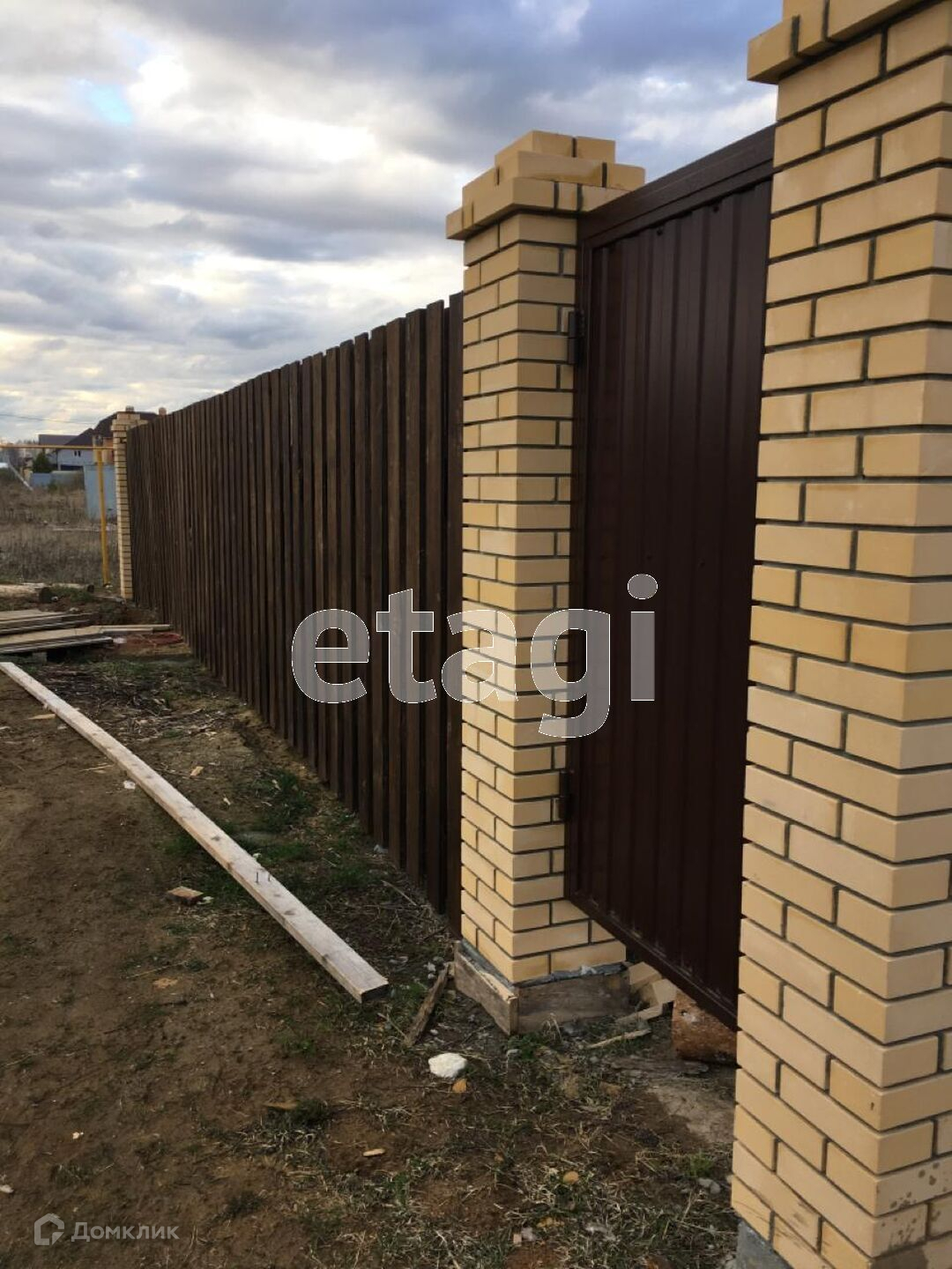Участок обнесен забором из шоколадного профлиста на бетонном ростверге, парадный вход на территорию оснащен откатными воротами. Двор отсыпан белым щебнем. На участке есть баня .