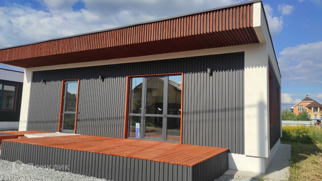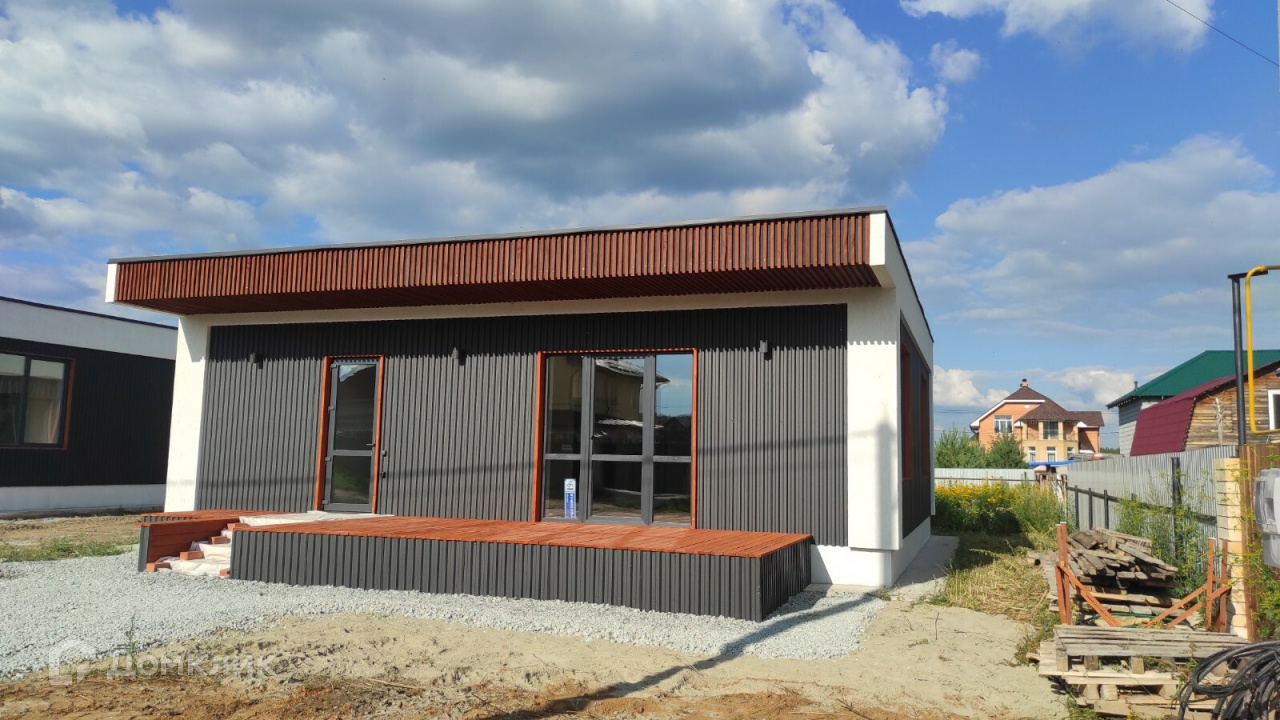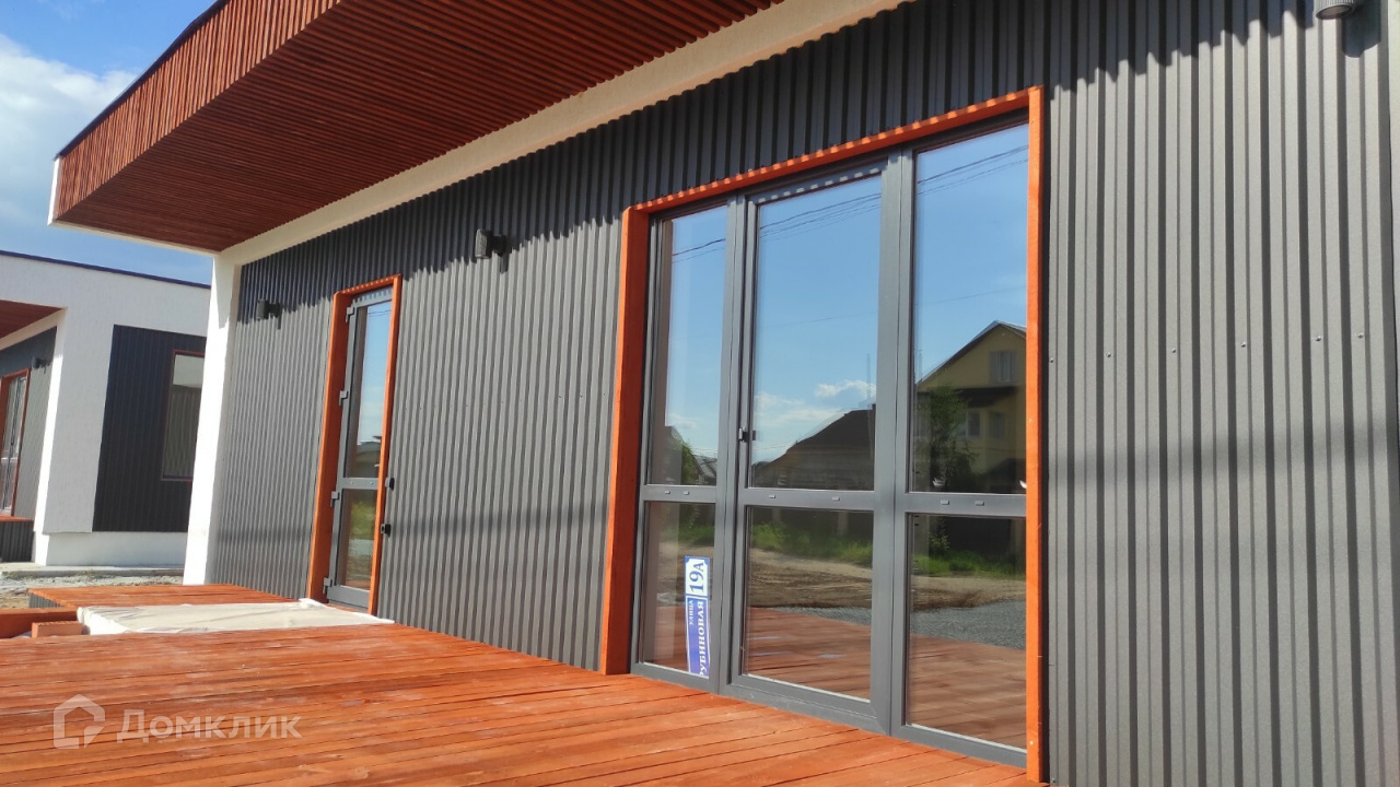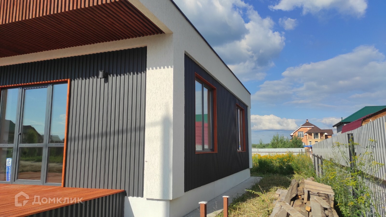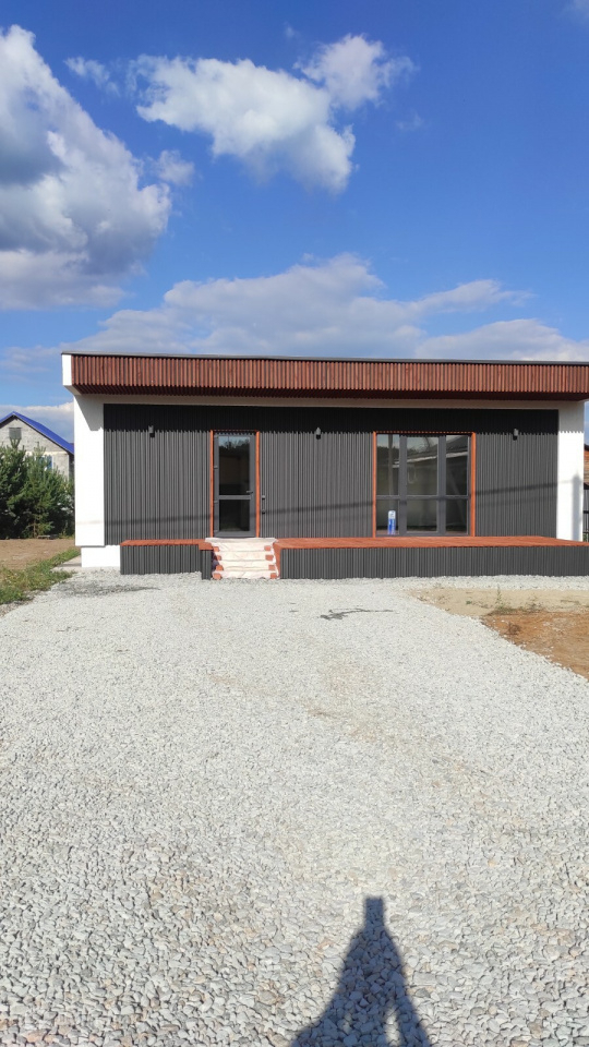 Предлагается к продаже новый дом 120 кв.м. в стиле Хайтэк .  Фундамент свайно- ростверковый. Перекрытие плиты заводские ПБ. Стены газоблок 300 мм плюс утеплитель 50 мм вентзазор и профлист. По углам декор из утеплителя 150мм. Кровля по системе "плоская" с уклоном и отводом воды на заднюю часть дома. Газ и интернет на границе участка. Отопление водяной теплый пол от электрокотла с доп. разводкой под газовый котел.