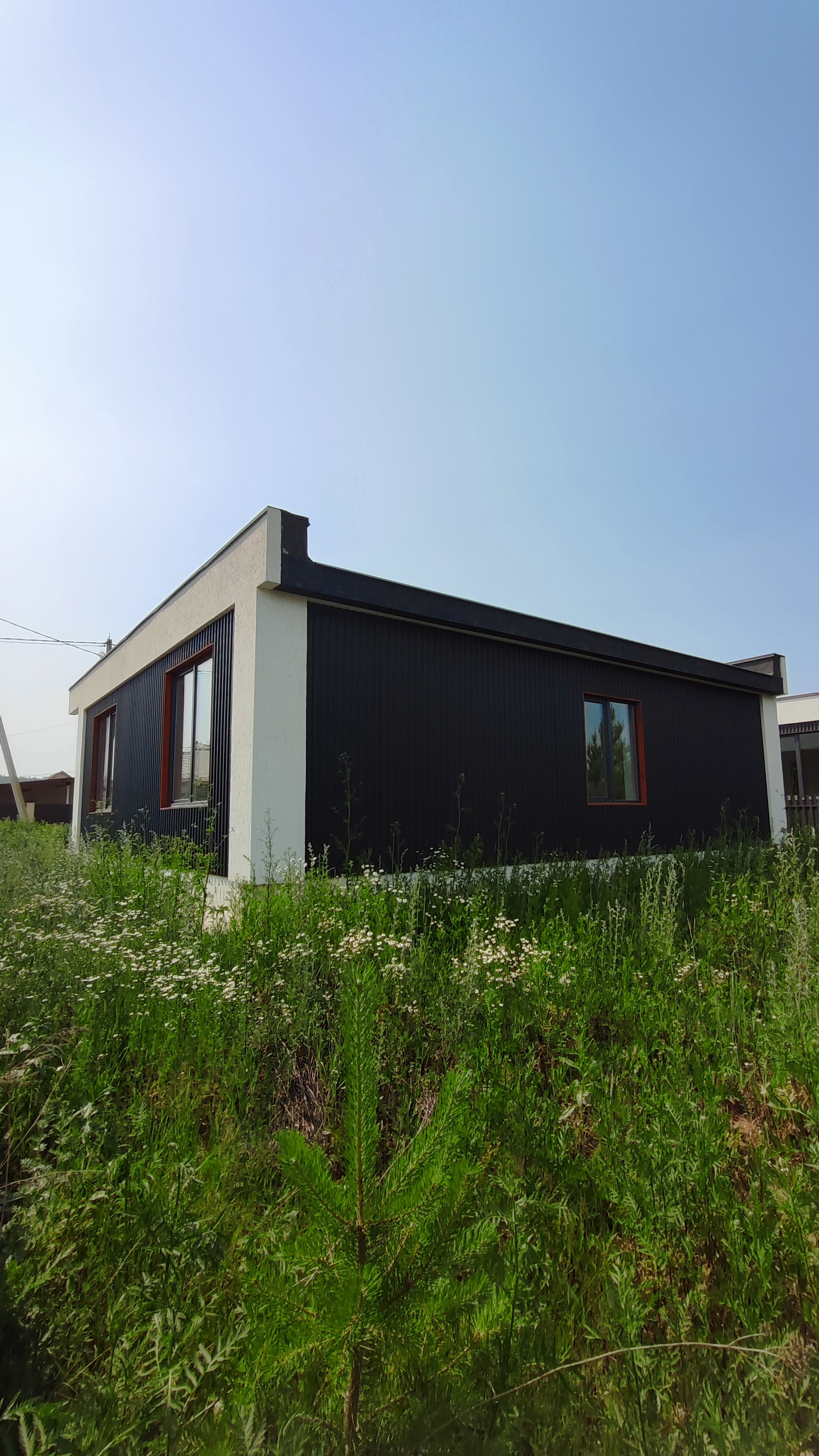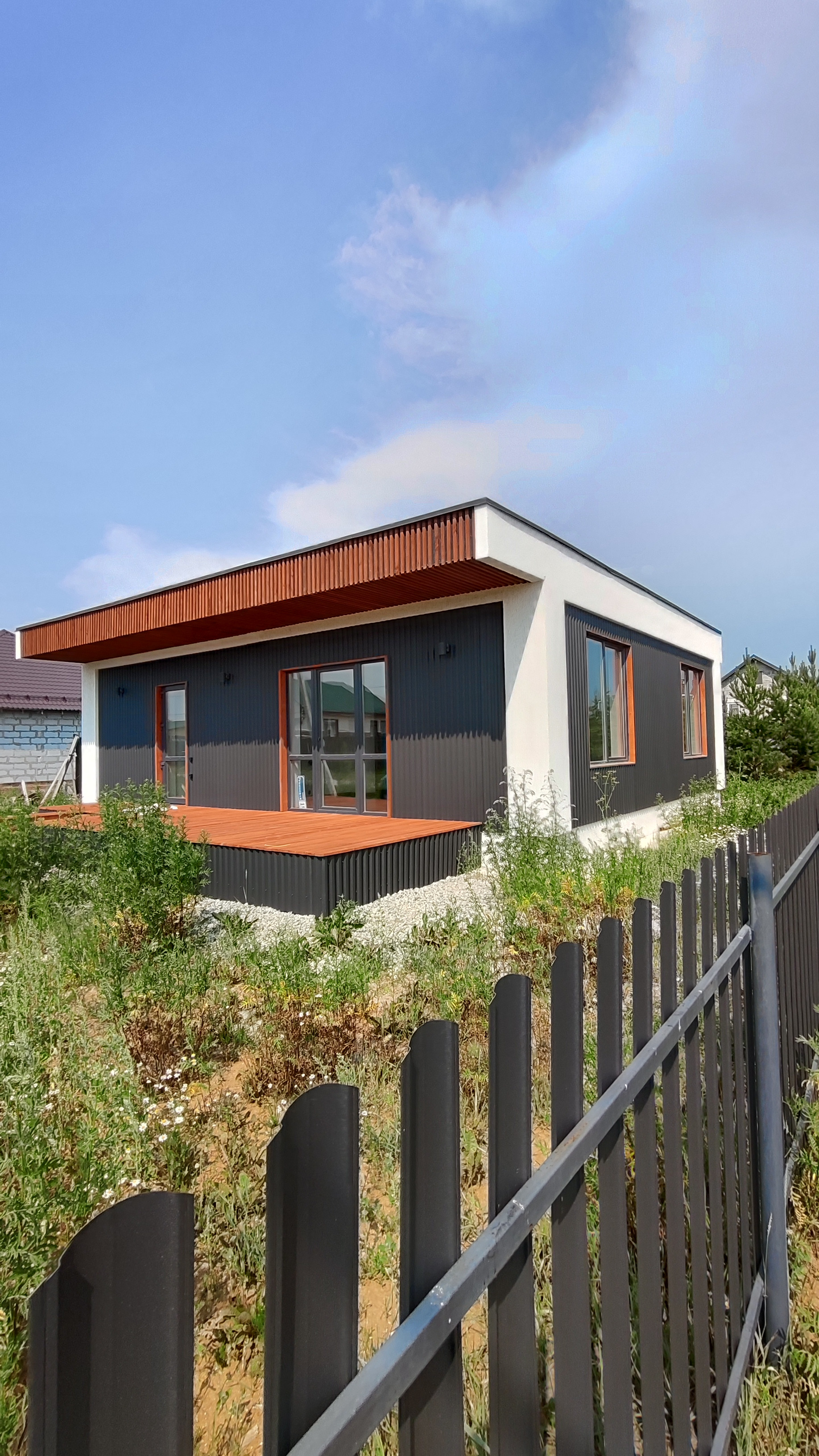 Предлагается к продаже новый дом 97 кв.м. в стиле Хайтэк .  Фундамент свайно- ростверковый. Перекрытие плиты заводские ПБ. Стены газоблок 300 мм плюс утеплитель 50 мм вентзазор и профлист. По углам декор из утеплителя 150мм. Кровля по системе "плоская" с уклоном и отводом воды на заднюю часть дома. Газ и интернет на границе участка. Отопление водяной теплый пол от электрокотла с доп. разводкой под газовый котел.
