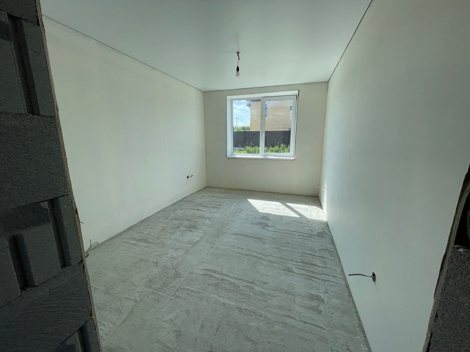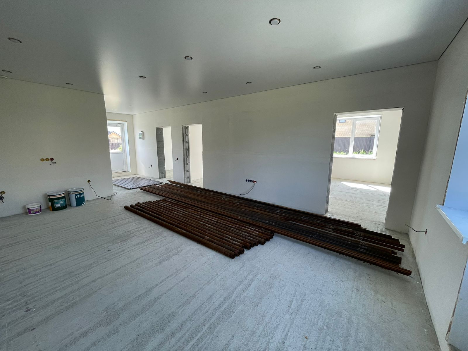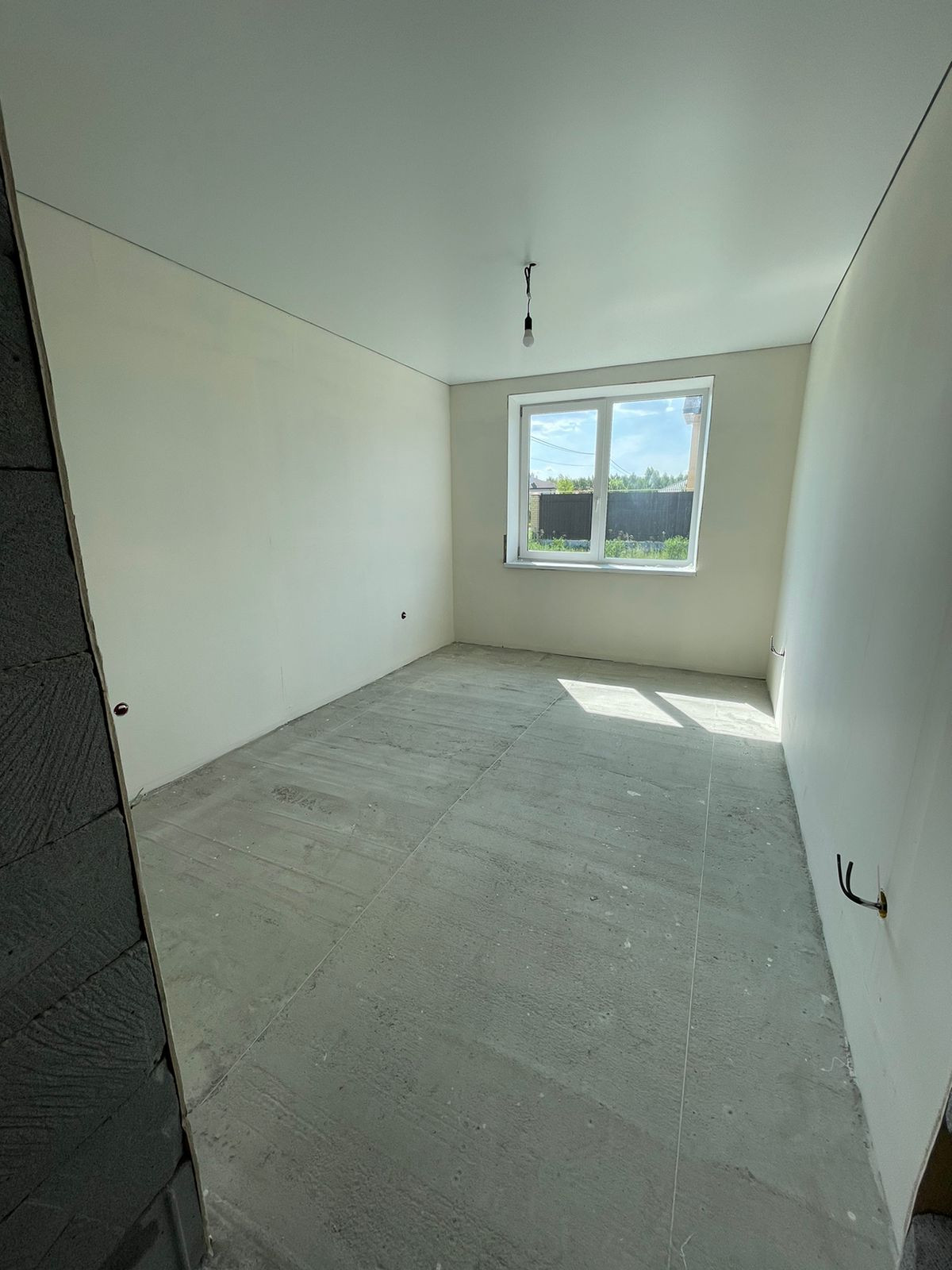 В доме выполнена отделка под чистовую, стены выровнены, на полу - стяжка, теплые полы во всем доме, натяжные потолки, пластиковые окна, сейф-дверь входная, проведено электричество, установлен электрический котел, в доме проведены вода и канализация - скважина, септик, газ заведен на участок - осталось завести в дом.