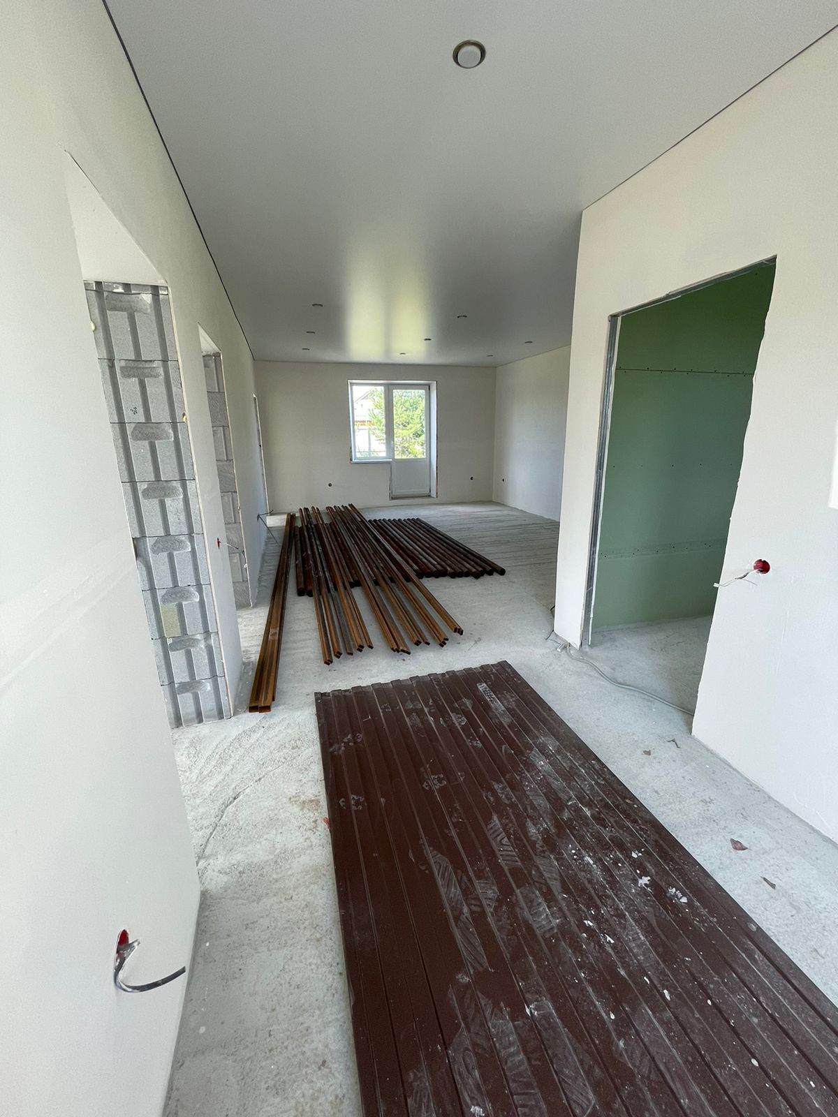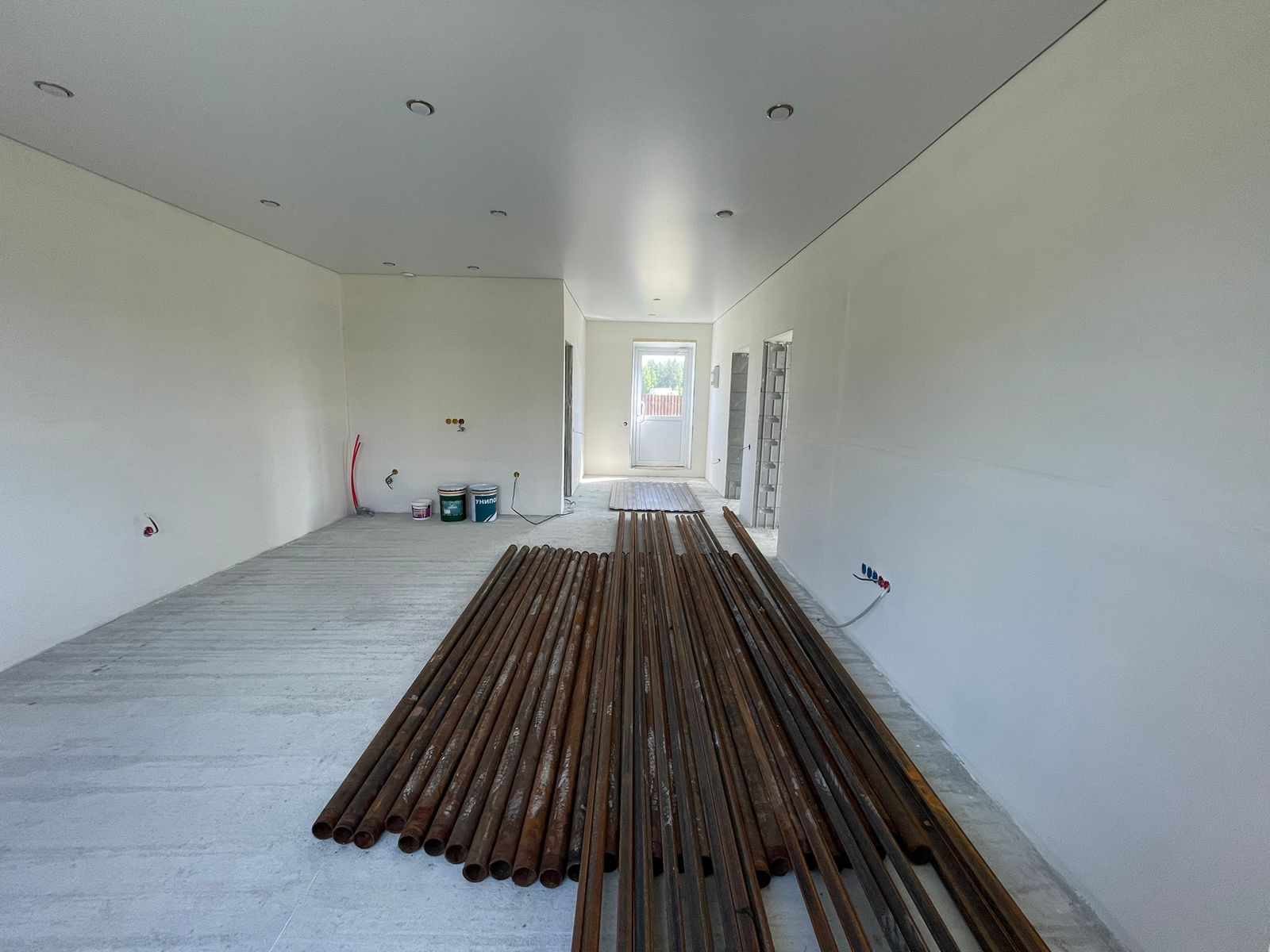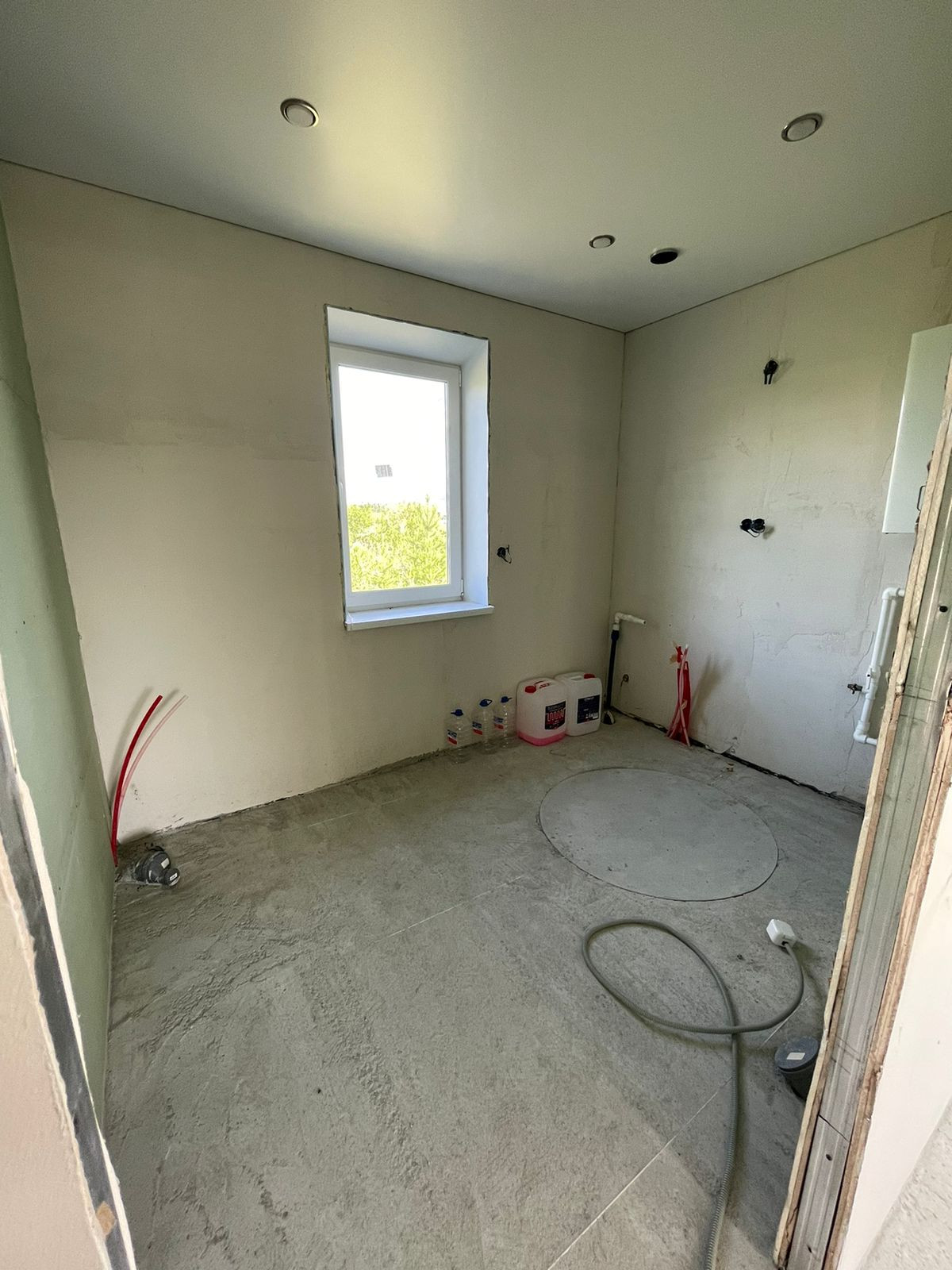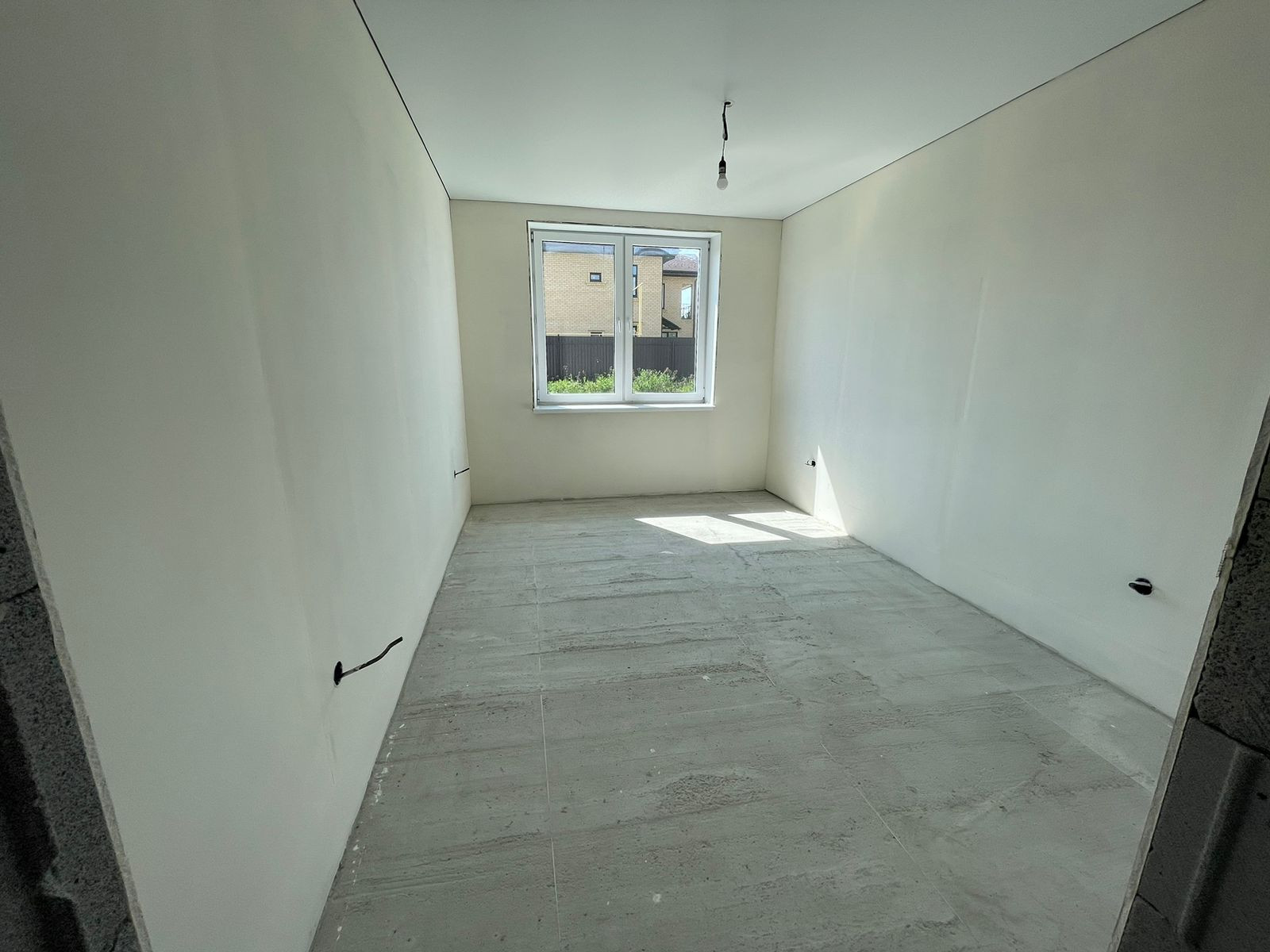 В доме выполнена отделка под чистовую, стены выровнены, на полу - стяжка, теплые полы во всем доме, натяжные потолки, пластиковые окна, сейф-дверь входная, проведено электричество, установлен электрический котел, в доме проведены вода и канализация - скважина, септик, газ заведен на участок - осталось завести в дом.