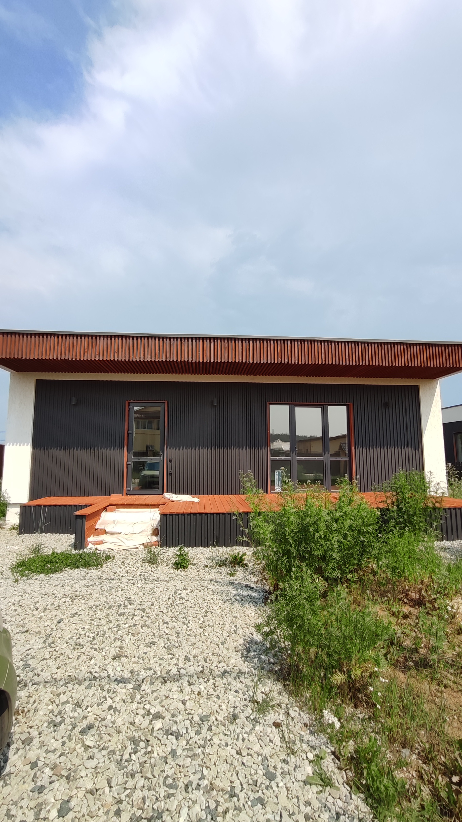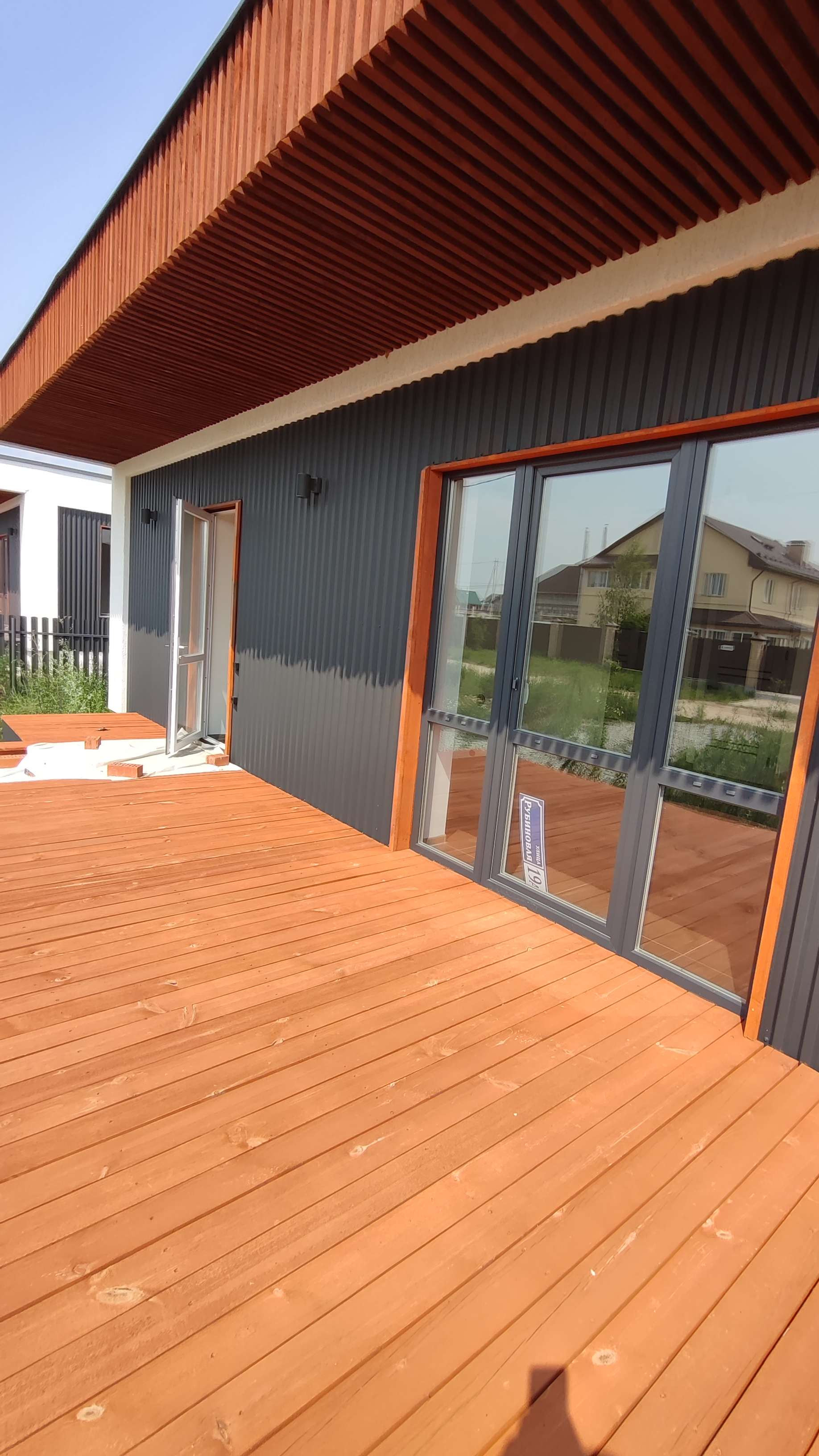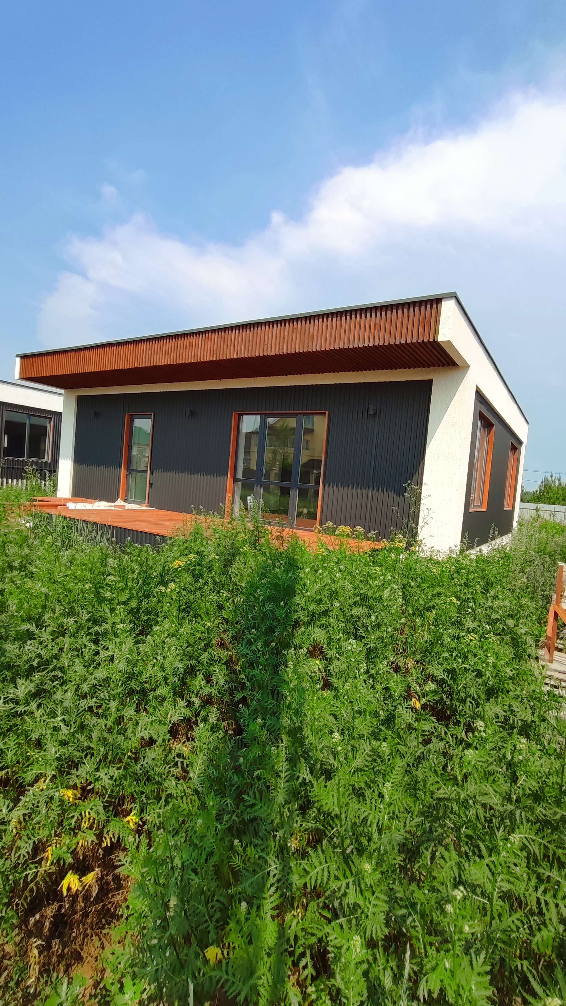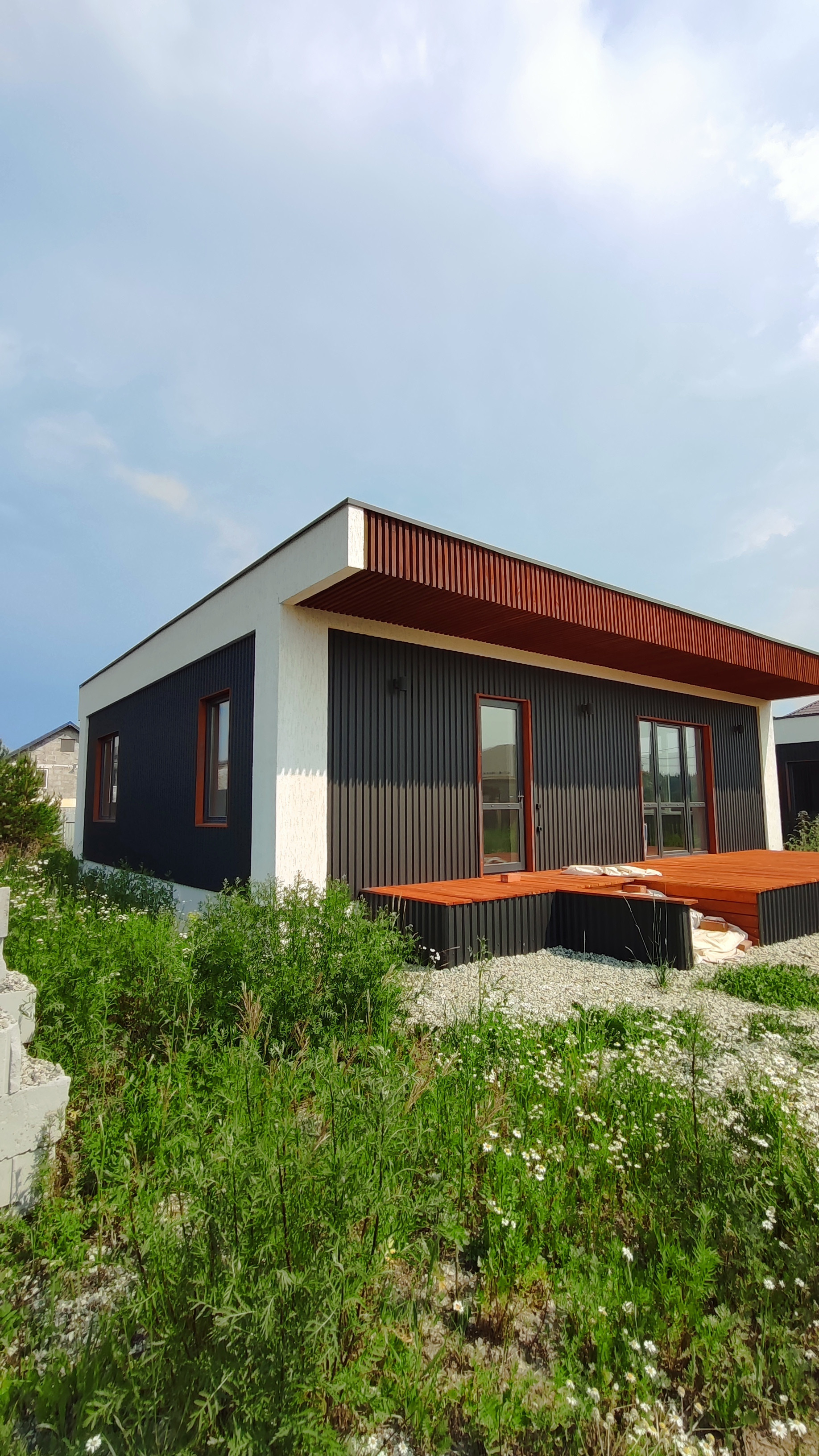 Предлагается к продаже новый дом 97 кв.м. в стиле Хайтэк . Пос. Становая, ул. Рубиновая, д.19 А. Фундамент свайно- ростверковый. Перекрытие плиты заводские ПБ. Стены газоблок 300 мм плюс утеплитель 50 мм вентзазор и профлист. По углам декор из утеплителя 150мм. Кровля по системе "плоская" с уклоном и отводом воды на заднюю часть дома. Газ и интернет на границе участка. Отопление водяной теплый пол от электрокотла с доп. разводкой под газовый котел.