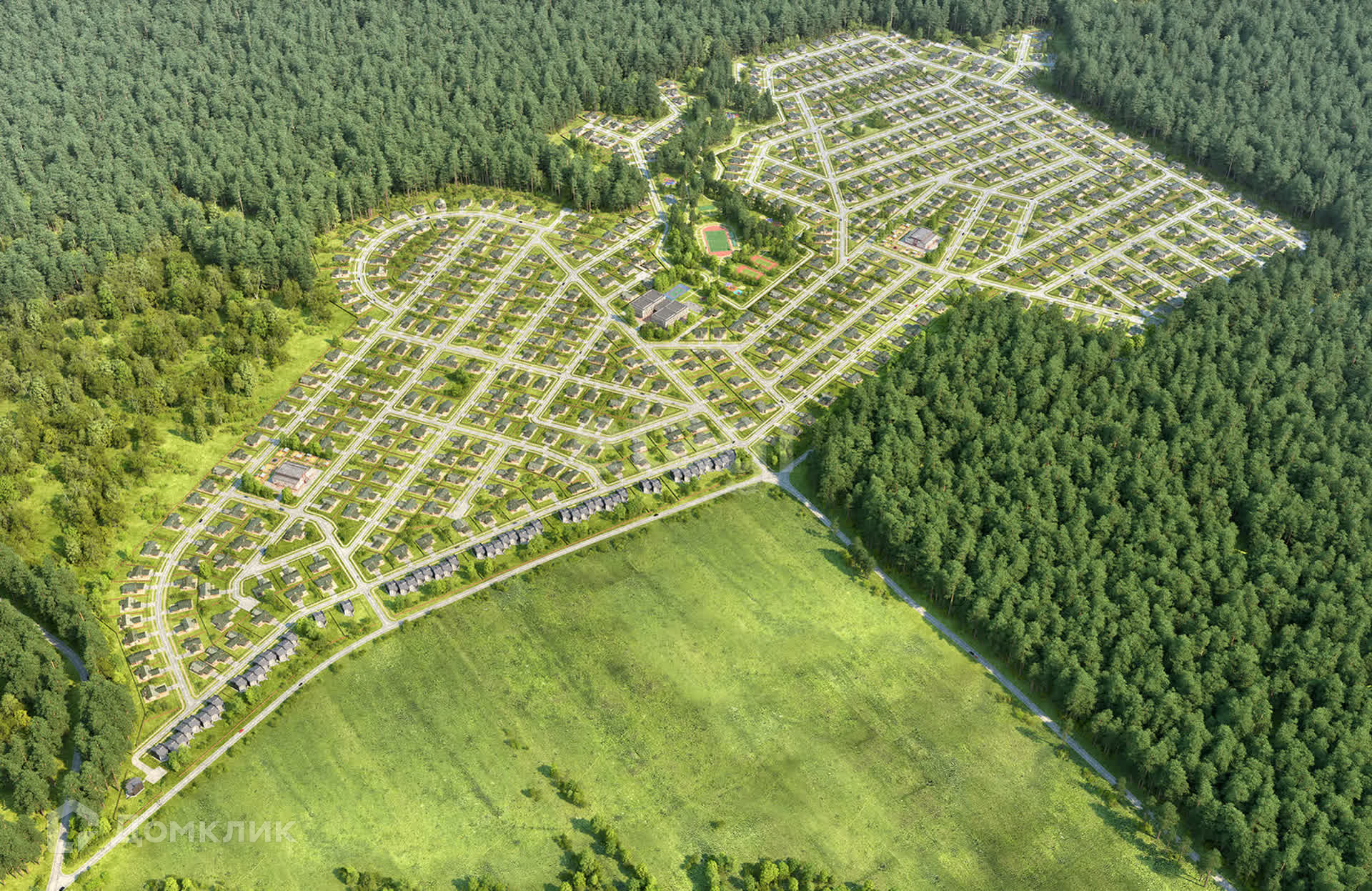 В проекте КП предусмотрено строительство объектов социальной инфраструктуры: детский сад, школа, медицинский центр, места для занятия спортом. Окруженный лесными массивами крупноформатный поселок расположен вдали от автомобильных, железнодорожных и авиа трасс.