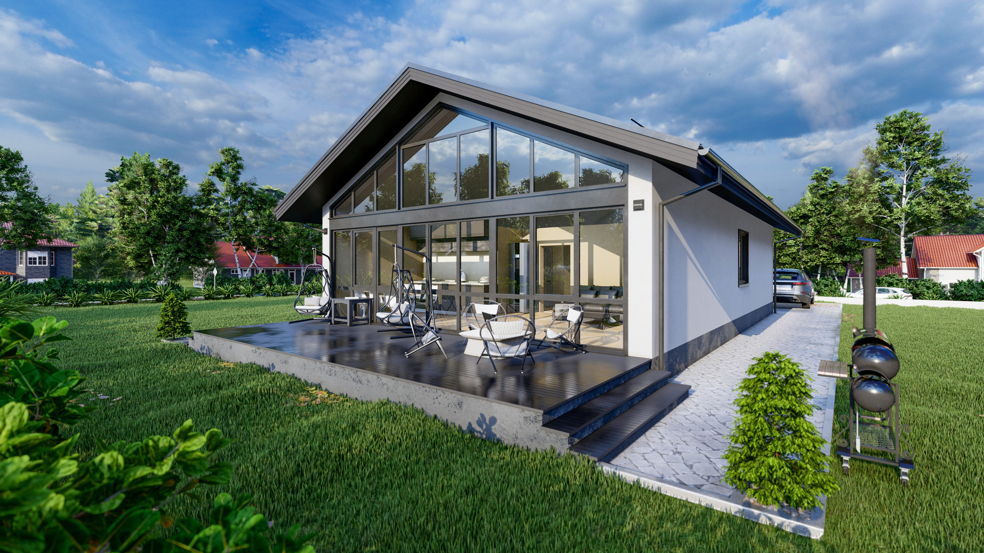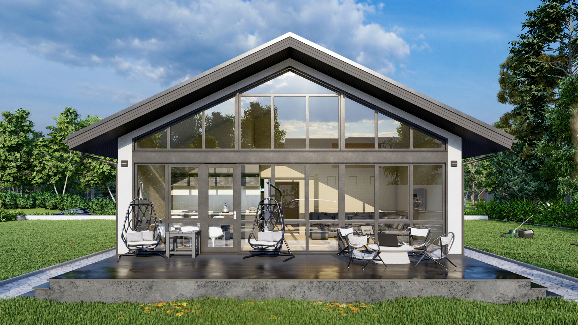 Имеет полностью одну панорамную стену с торца дома во всю ширину и высоту, с выходом на открытую террасу.