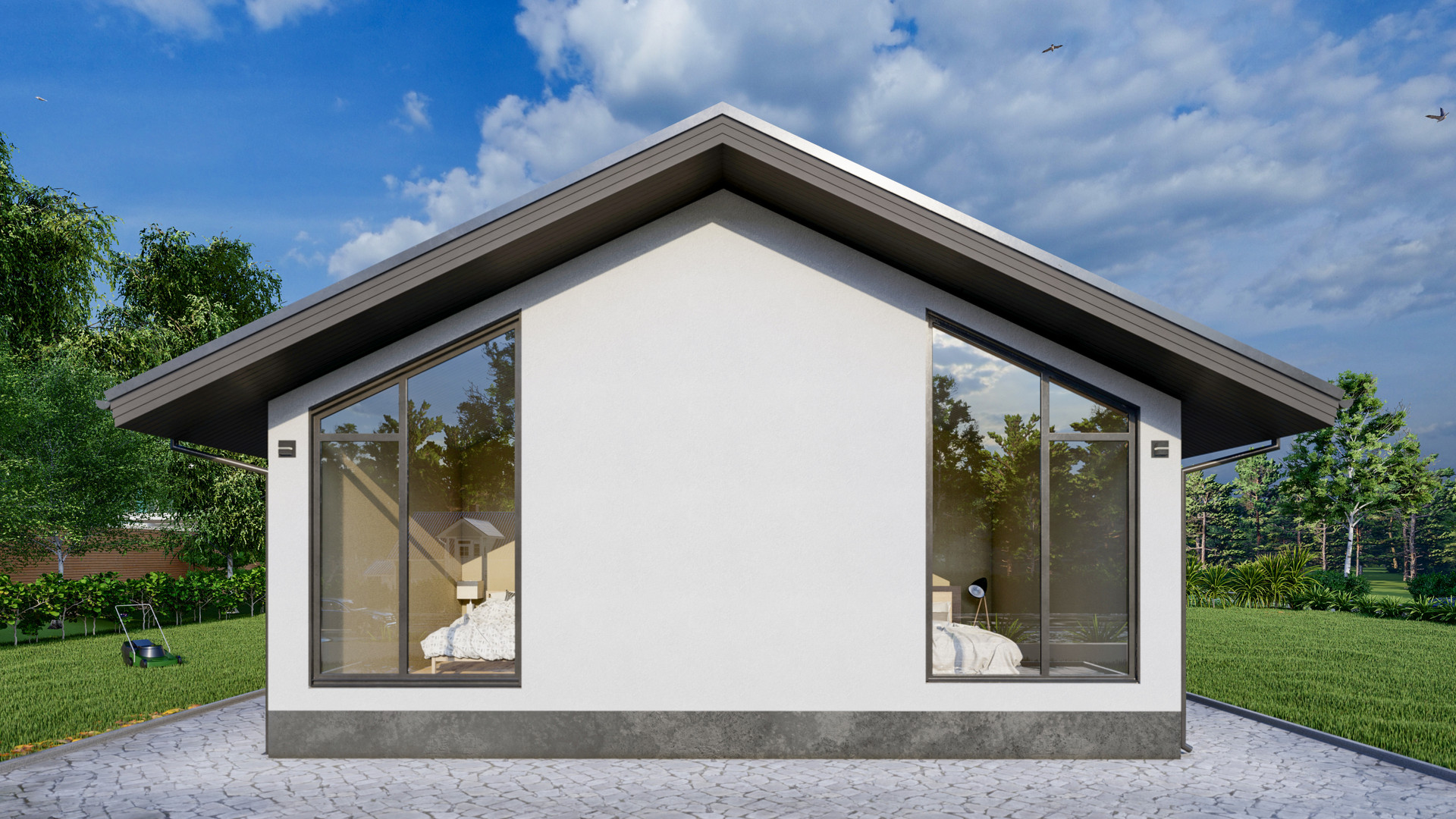 Комната очень светлая и просторная. Окна имеют зеркальное напыление, что дает комфортно находится в доме. Со стороны улицы не просматривается.