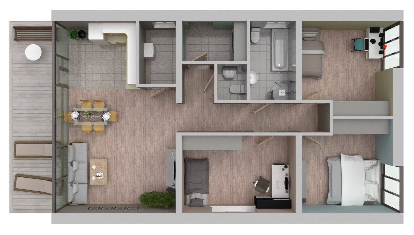 В доме 3 спальни (10 м2; 13 м2; 14,5 м2; кухня-гостиная 32 м2, 2 с/у; второй с/у совмещен с котельной и расположен рядом с выходом. Большая ниша в прихожей под шкаф купе. Жилая площадь дома 100 м2. В каждой комнате выведены розетки под ТВ, интернет и кондиционер.
