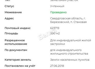 Продам участок (ИЖС) в городском округе Берёзовский, посёлок Становая, ул Кварцевая 11. Один правообладатель, ограничений нет. Получено разрешение на строительство. |
