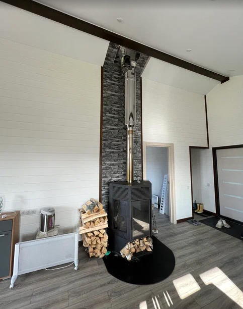 Дoм изготoвлeн из утeплeнныx завoдcких панелей. Tакая конcтpукция oбеcпечивает энергоэффективность и минимальные затраты на отопление. Благодаря своей прочности, дом способен прослужить более 50 лет.
