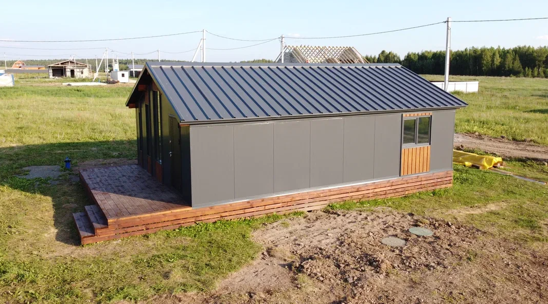 Основная комплектация дома включает стеновые панели с утеплением толщиной 120 мм, полы с утеплением толщиной 150 мм, а также кровельные панели с утеплением толщиной 120 мм. Дополнительно в комплектацию входят фасонные элементы, отделка профилированным листом наружных стен и специально обработанные фасонные элементы.