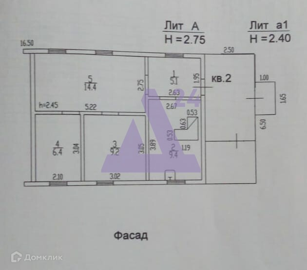 Общая площадь 44.5 м2