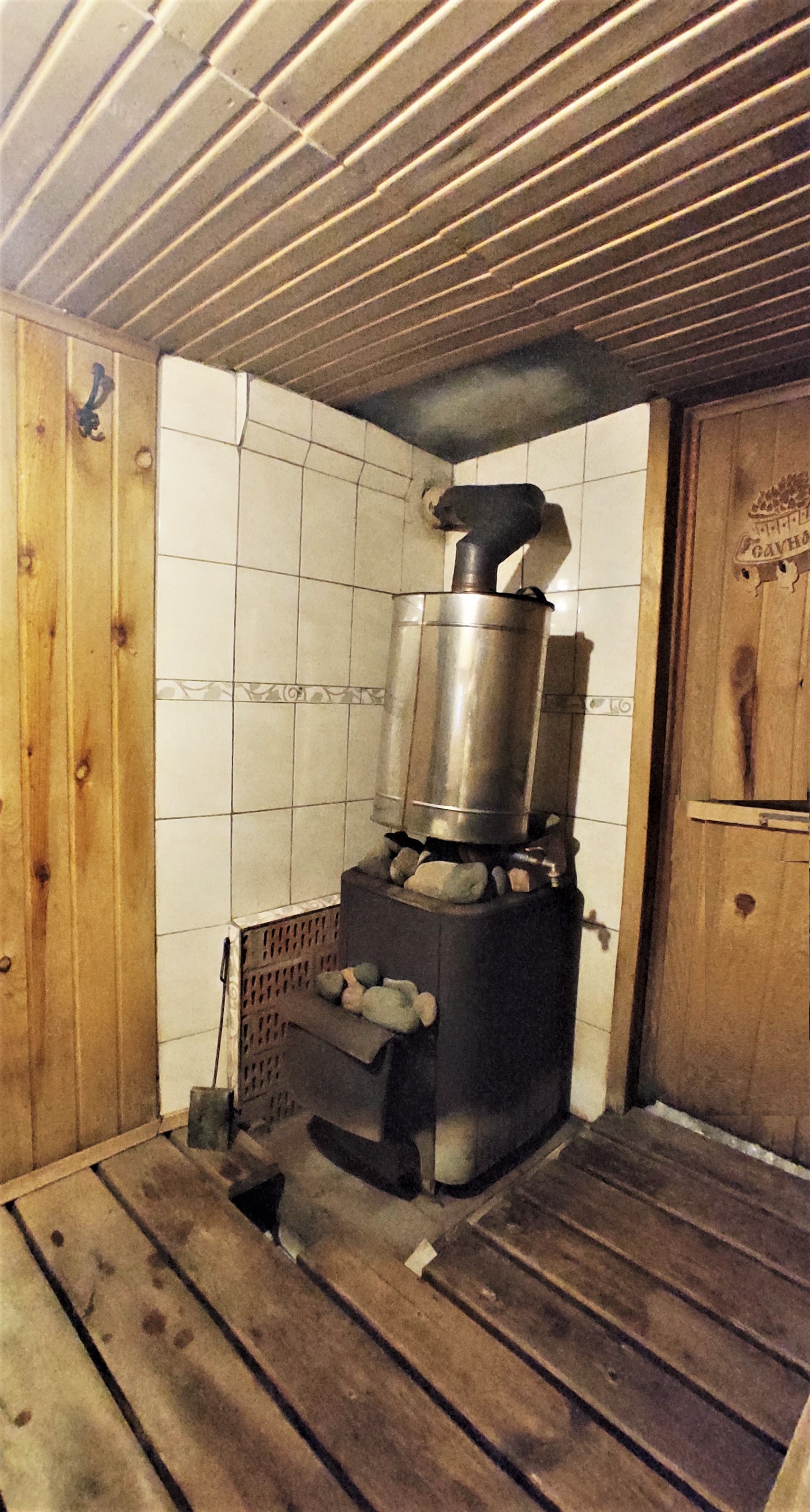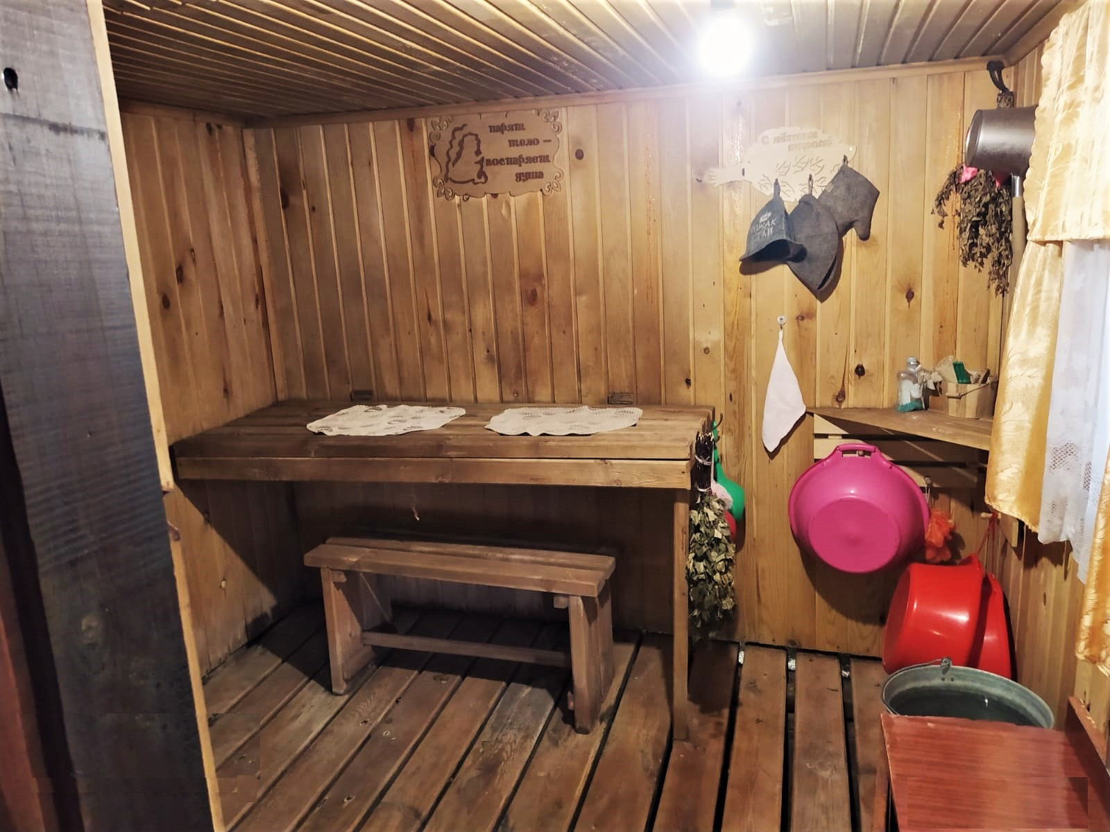Рядом с домом жаркая баня из бруса с верандой и зоной отдыха, обшита рейкой.