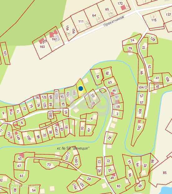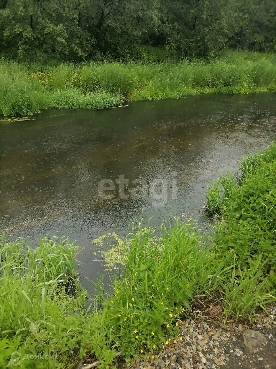 Участок с собственным выходом к речке (берег отсыпан и укреплен скалой, щебнем и песком), чистый, ухоженный; засеян газонной травой; имеются плодовые деревья и кусты (слива, яблоня, вишня), ель, сосны