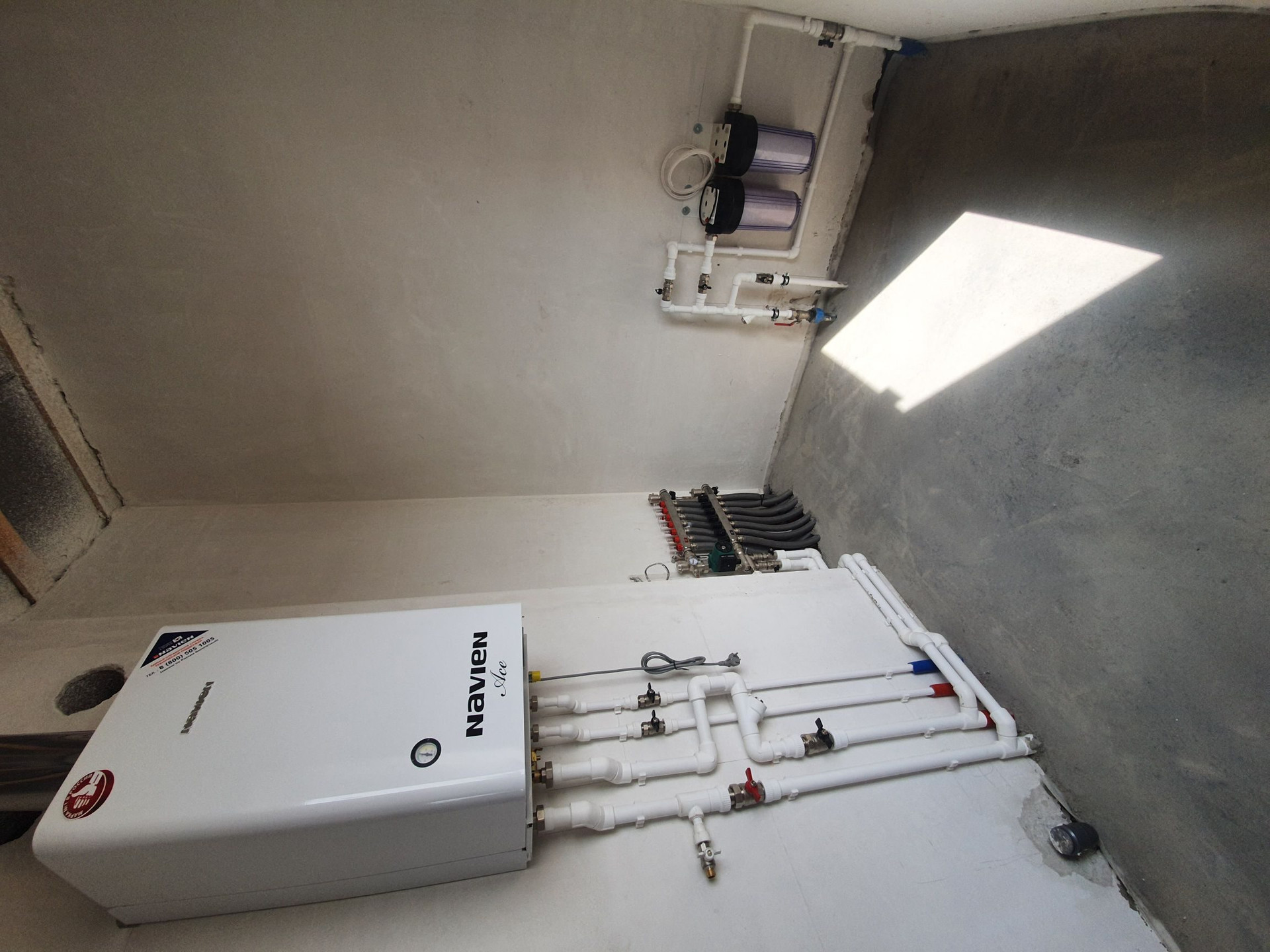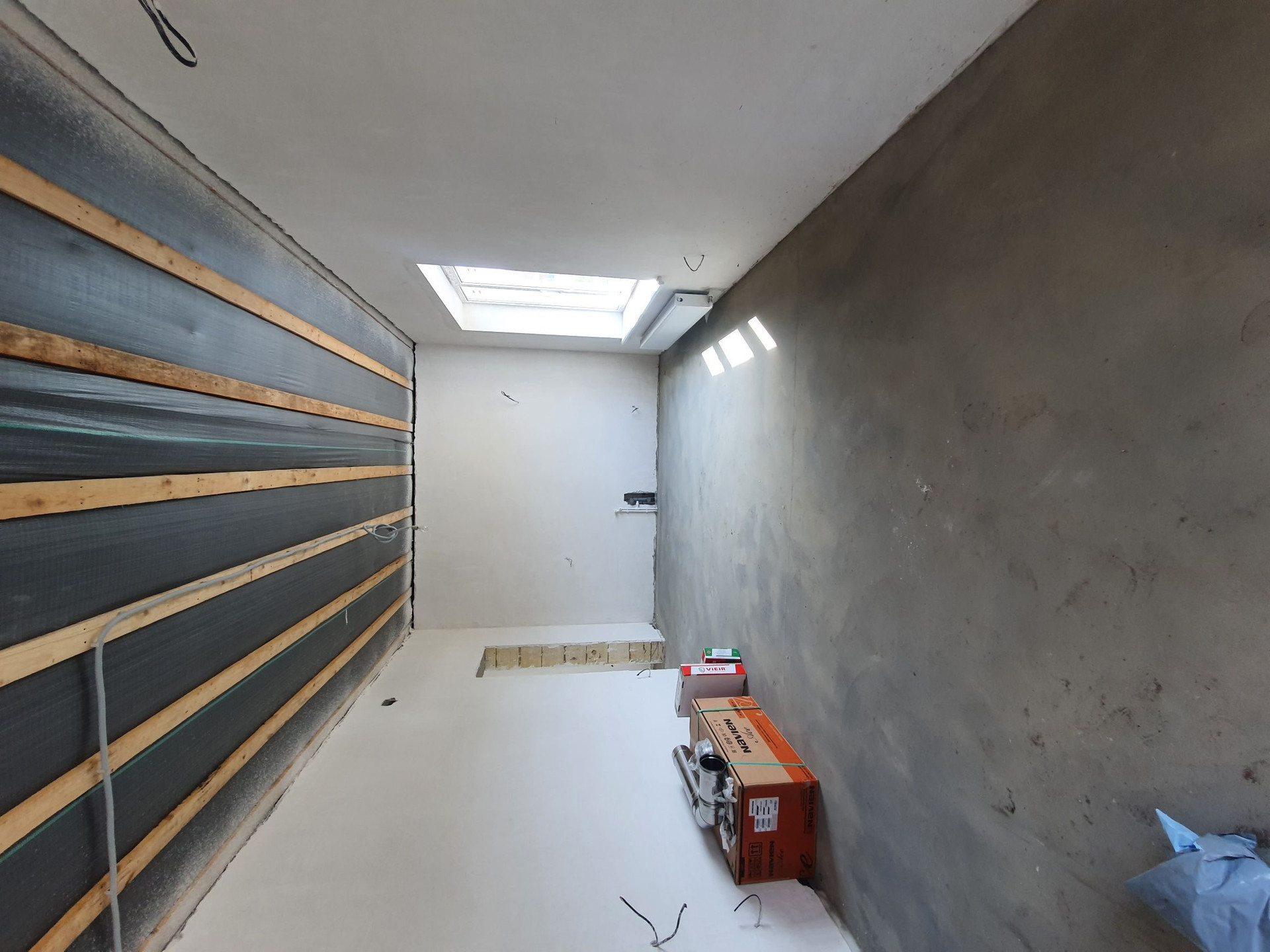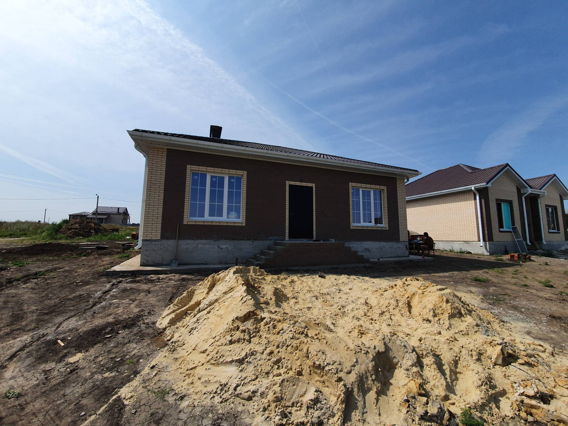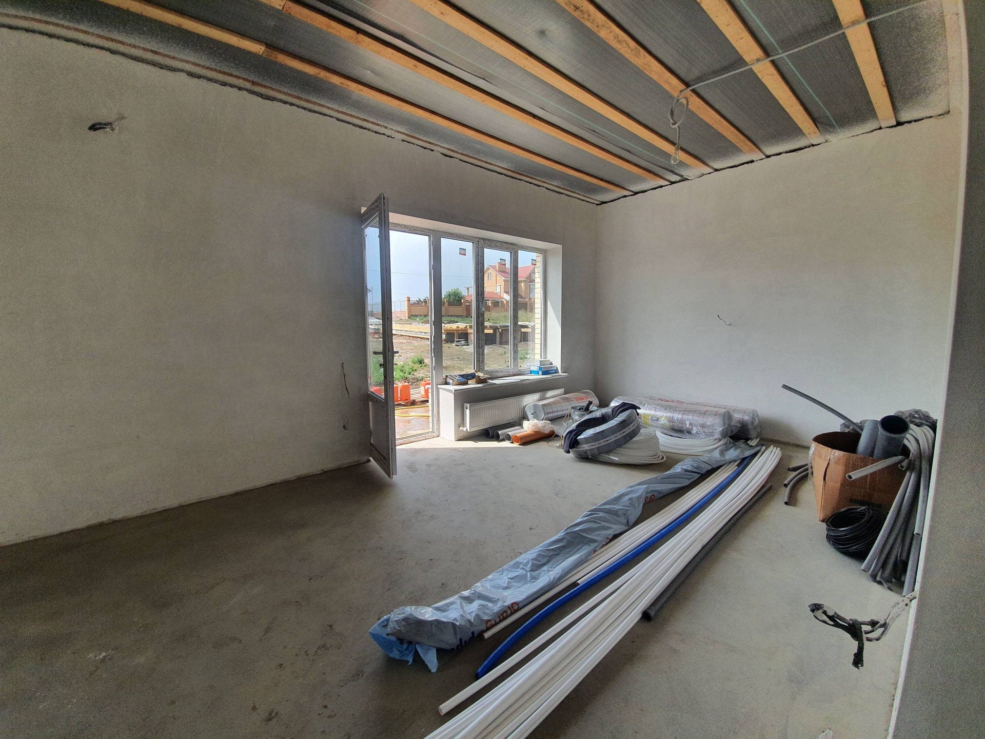 В доме выполнена предчистовая отделка: электропроводка, тёплые полы везде кроме спален, штукатурка стен, стяжка пола. )