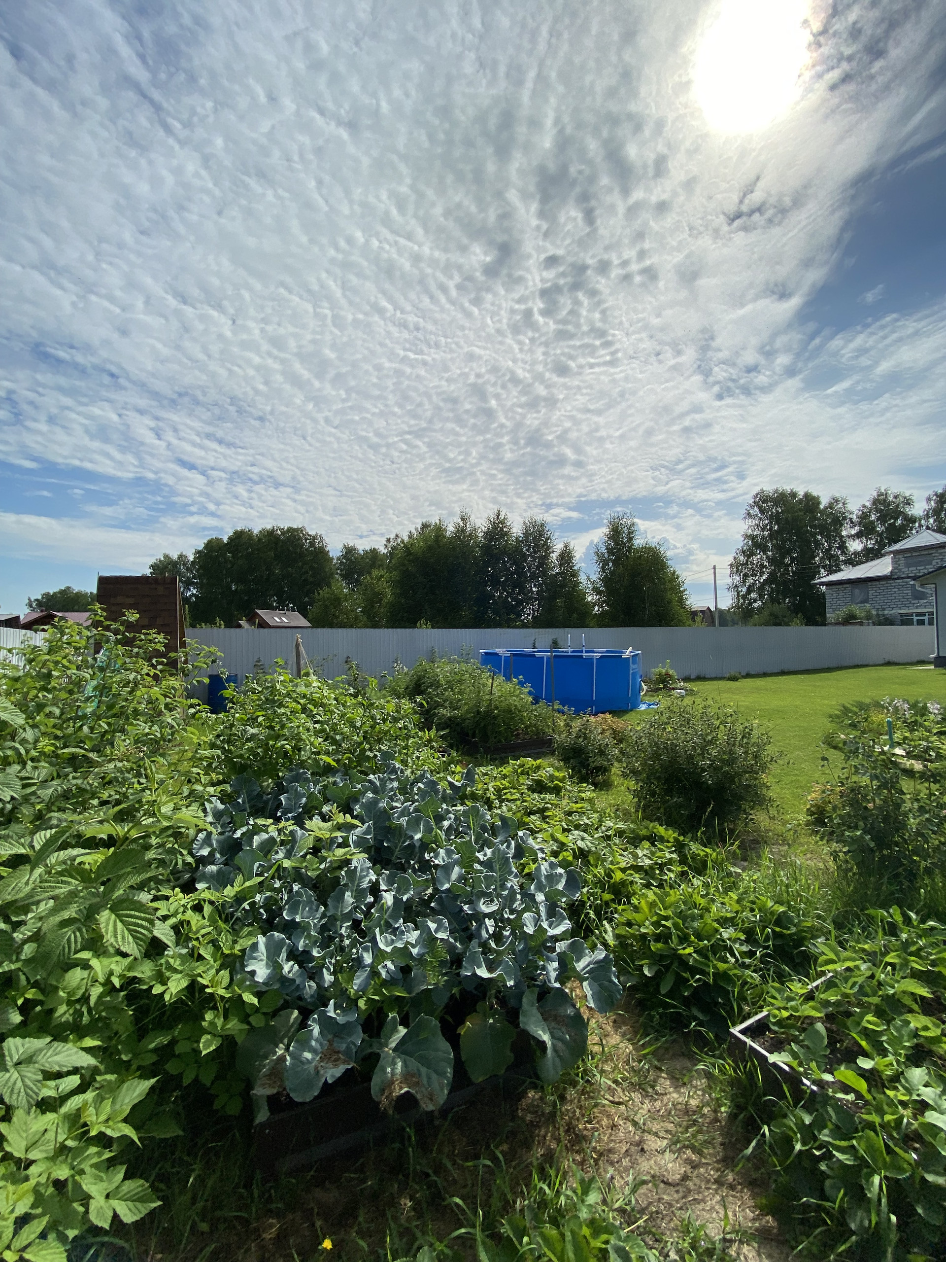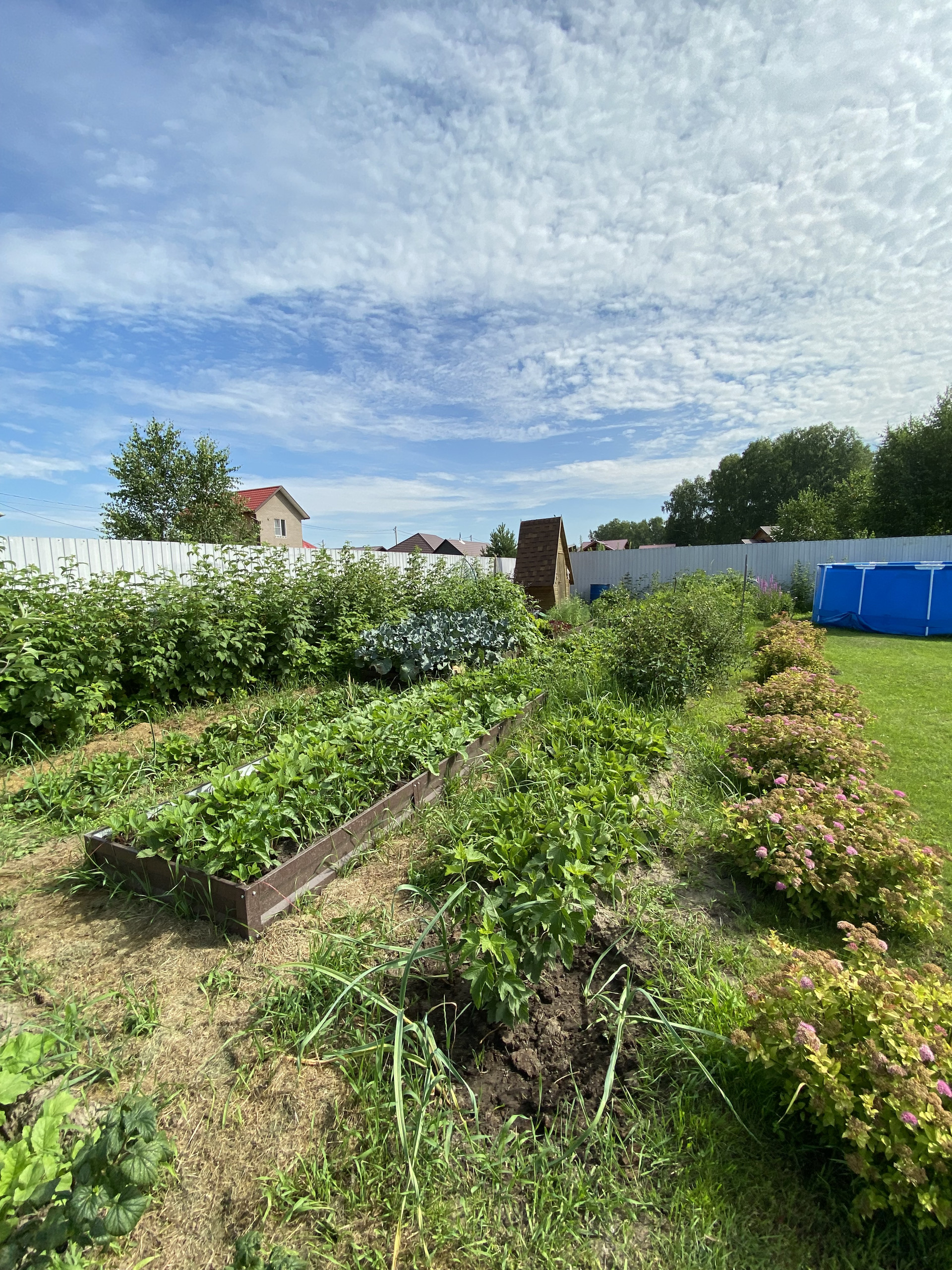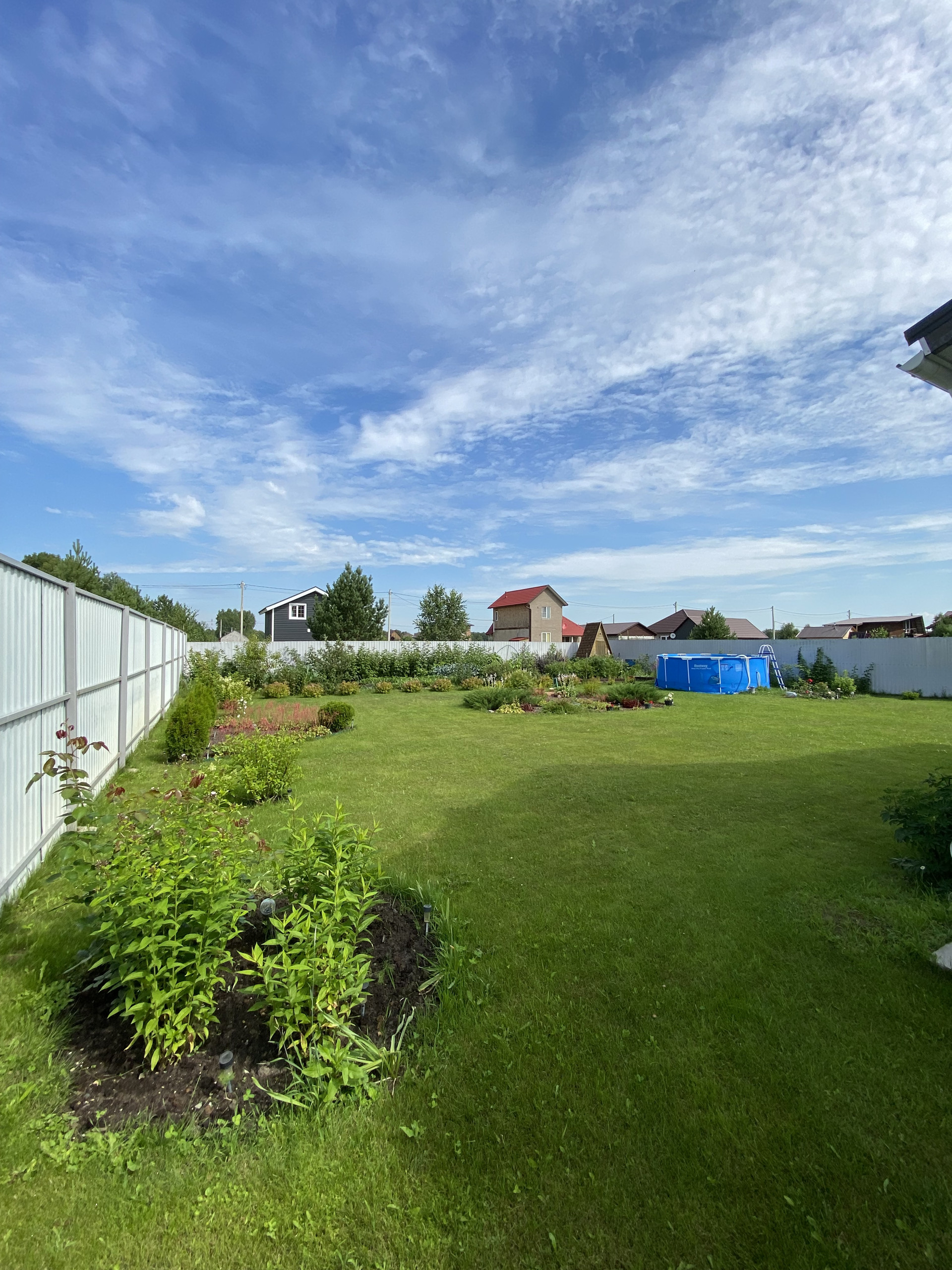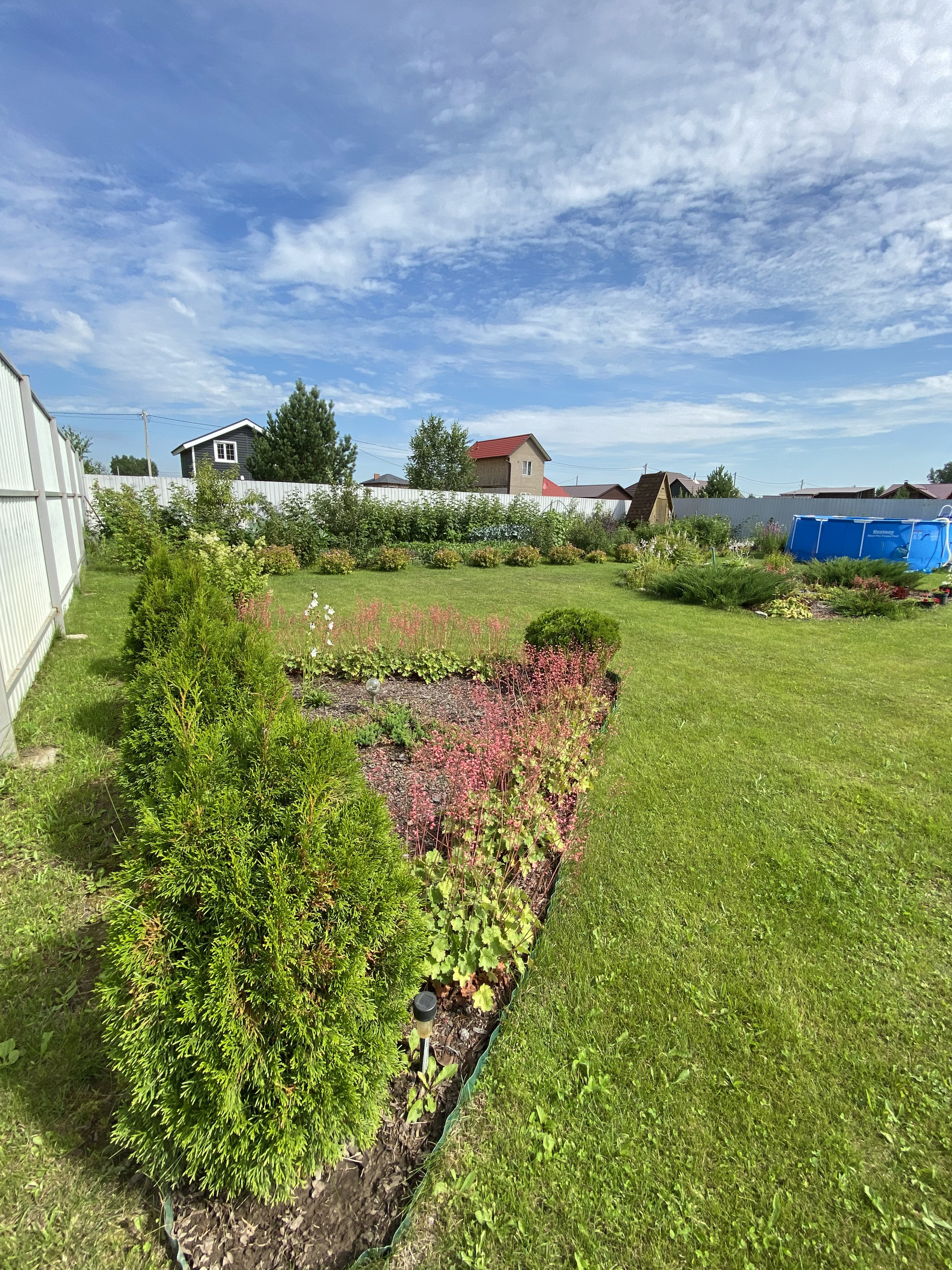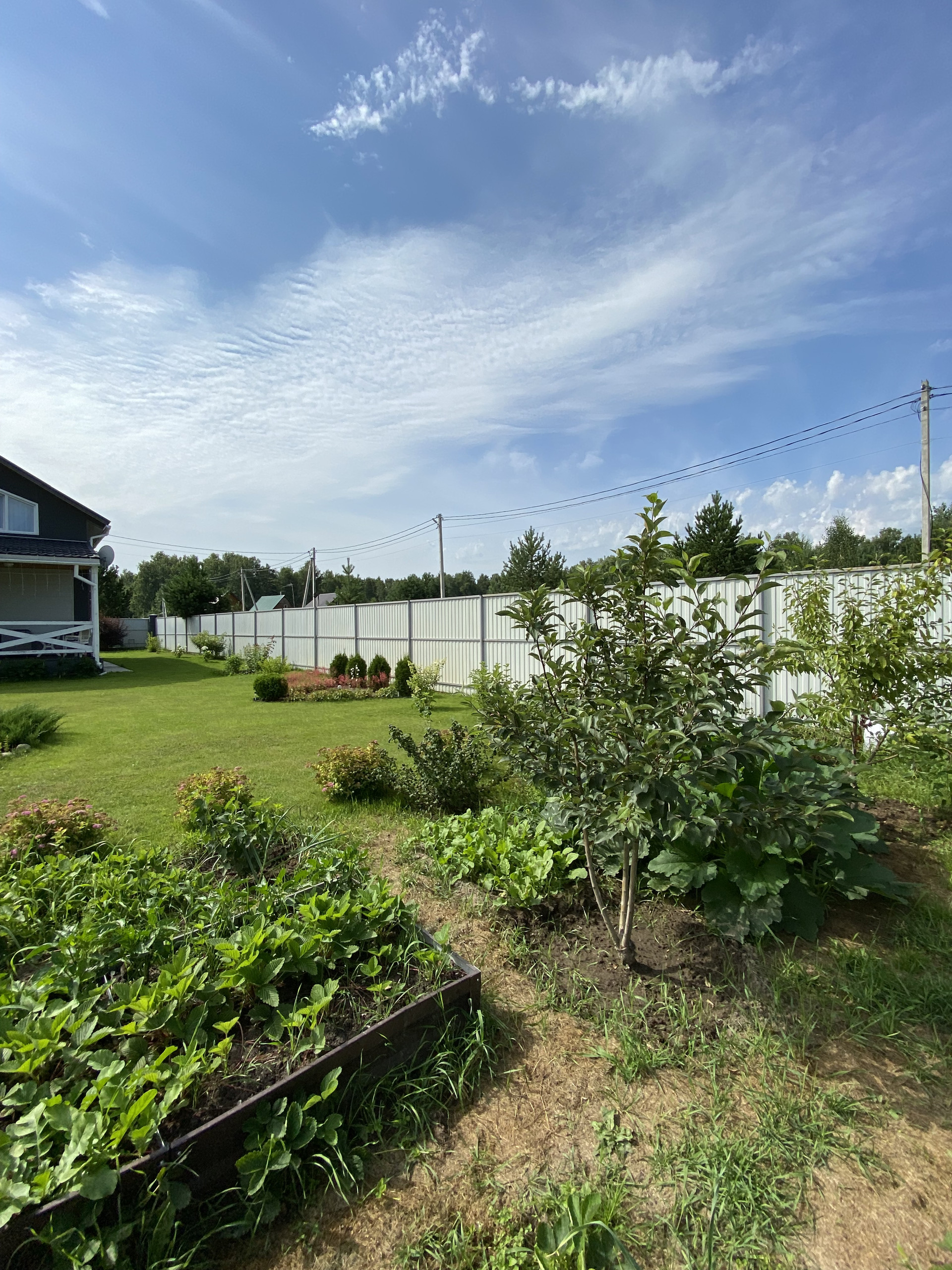 На участке вся территория засеяна газонной травой. Имеются грядки овощные, а так же растут плодовые деревья и ягодные кустарники. Украшение участка-это наличие красивых кустовых гортензий, туи и можжевельника.