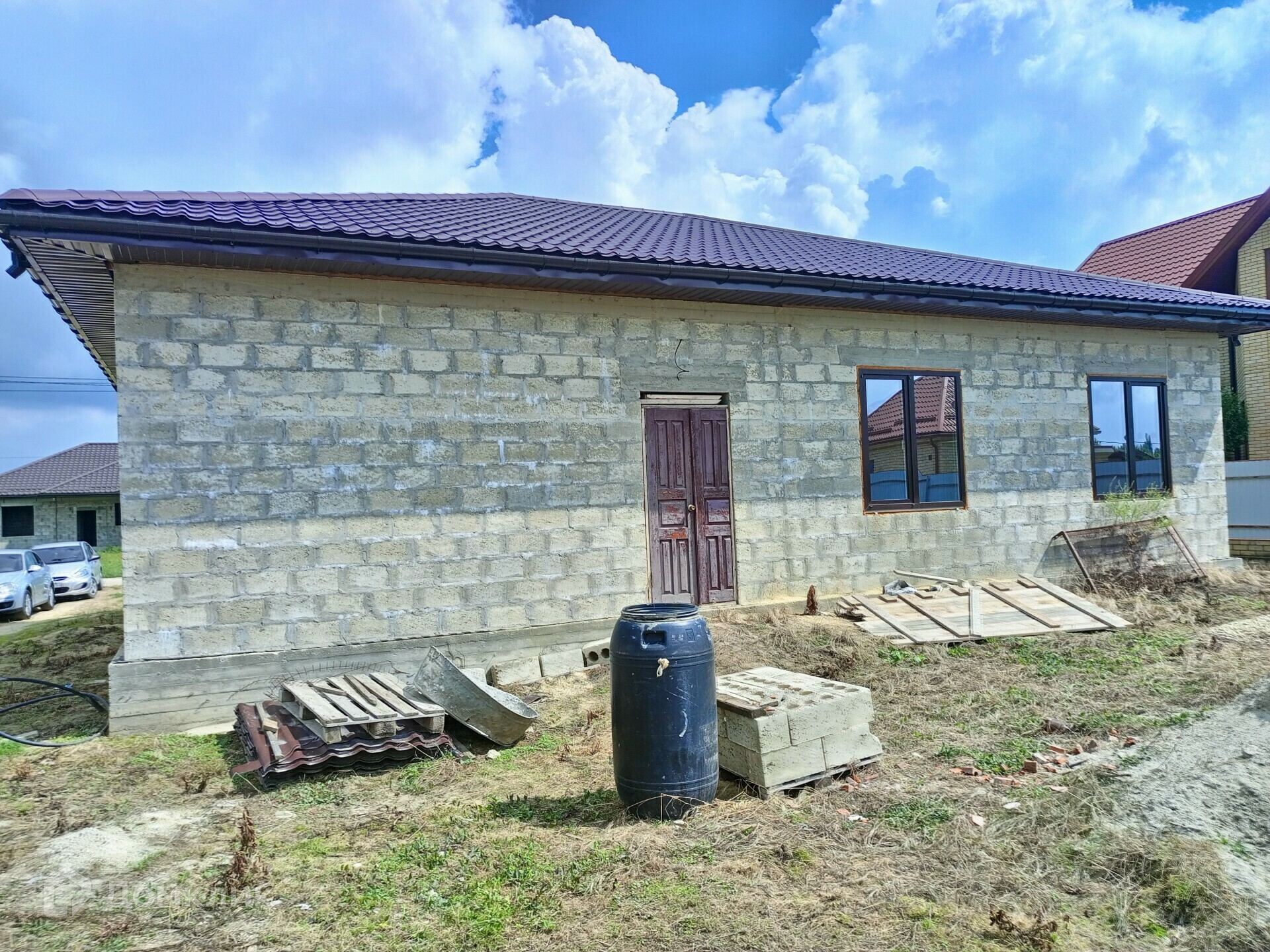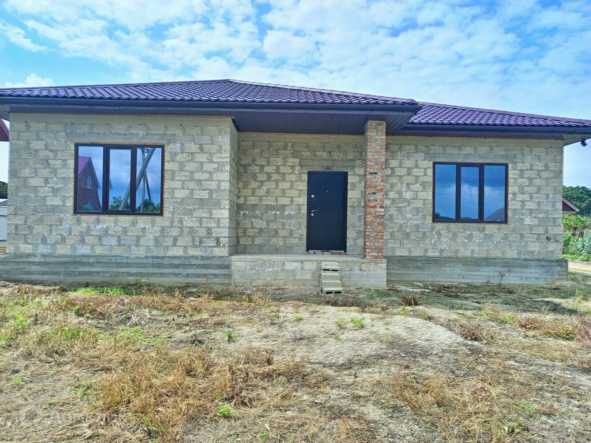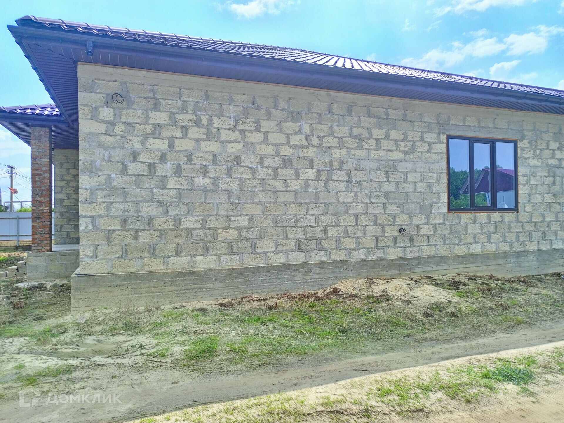 Фундамент и цоколь залит качественно, между с собой связаны. Стены выполнены из блока. Крыша выполнена из металлочерепицы матовая 0,5 мм.