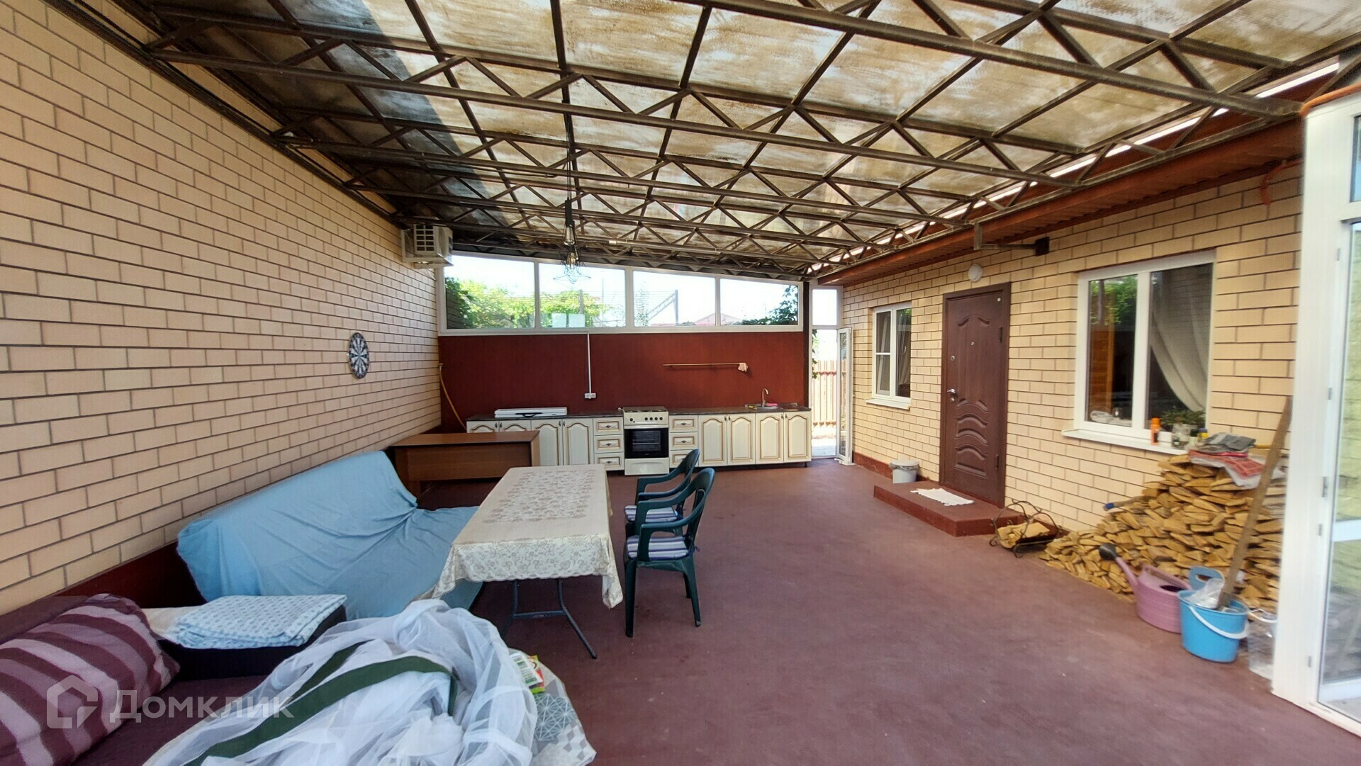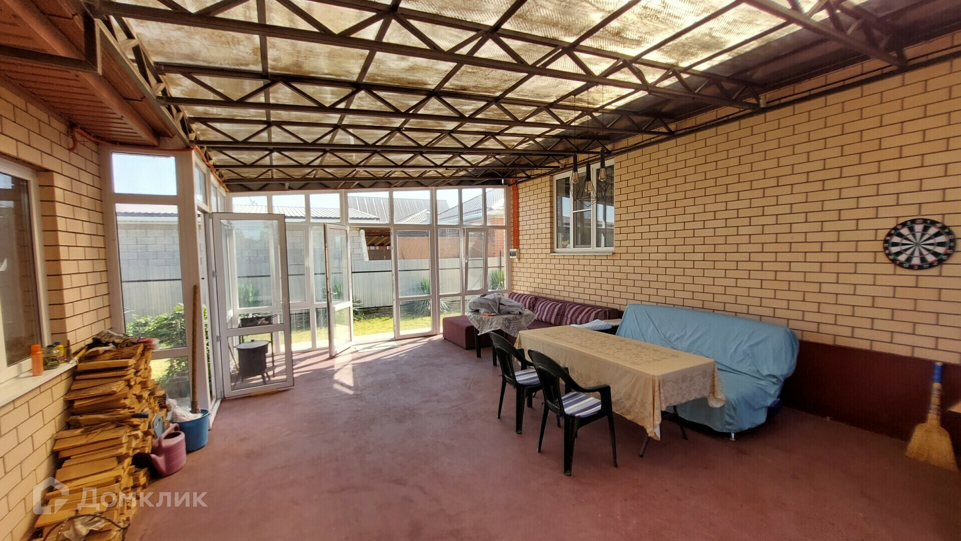 В задней части дома имеется баня на дровах, в которой есть парилка, комната отдыха, душевая, туалет. Дом и баня соединены между собой просторной застеклённой верандой - летней кухней. В левой части дома есть автомобильный гараж.