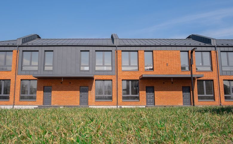 Возведены по газобетонной технологии строительства. В оформлении фасадов использовано 2 оттенка — красный кирпич и серый металл.