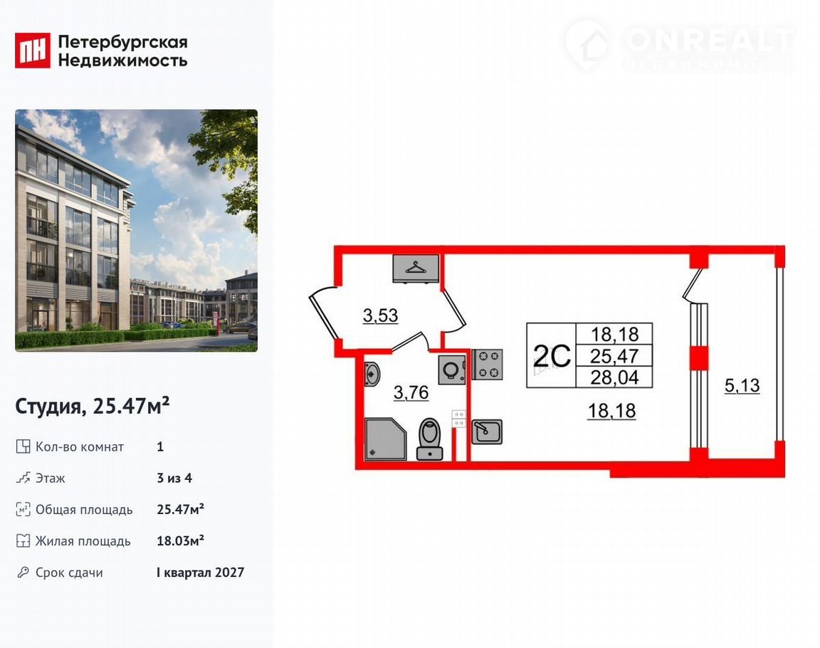 Квартира студия, 25.5 м2, этаж 3 / 4, на продажу в посёлке Стрельна